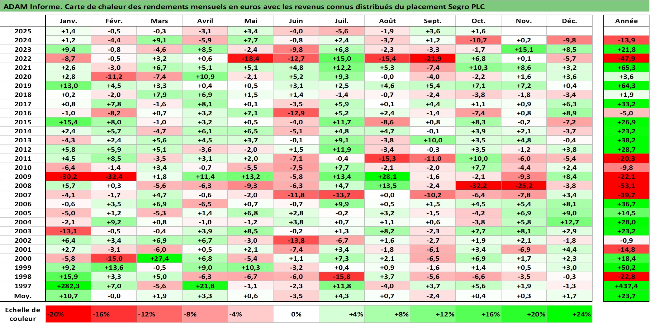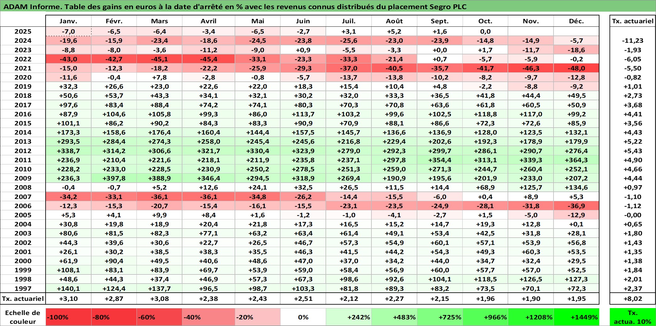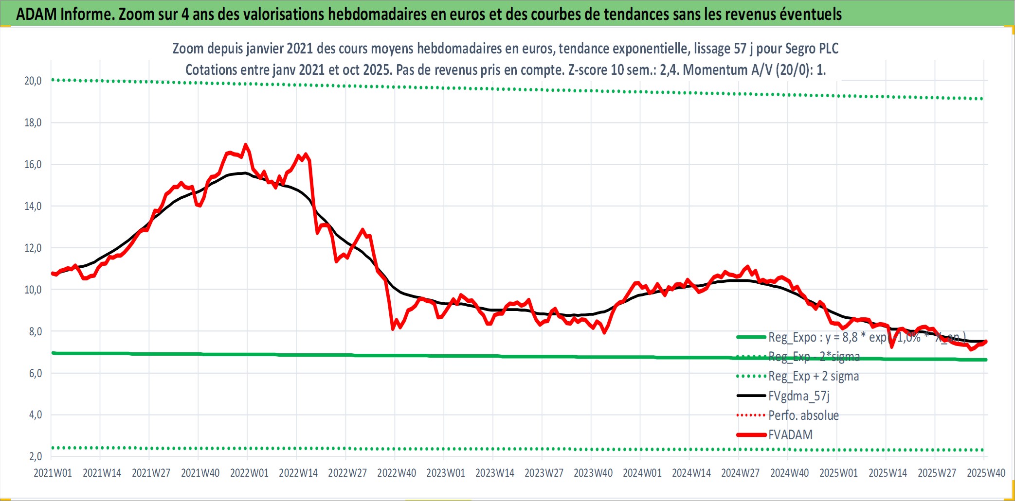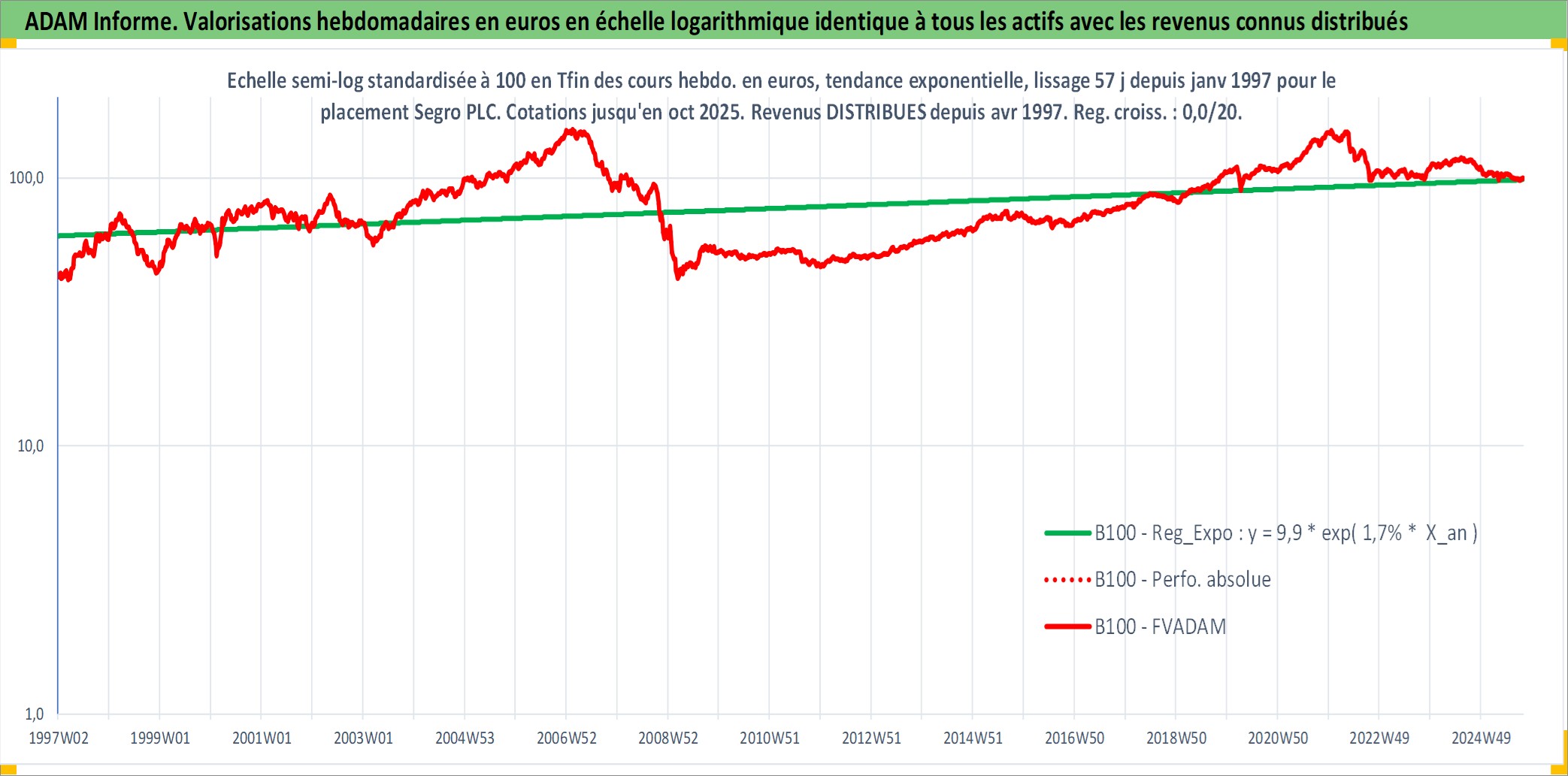Site dédié aux investisseursPage dédiée sur site financeAnalyse des valorisations hebdomadaires de l'action Segro PLC. Cet actif est cote en GBX. Les valorisations sont en contrevaleur EURO et couvrent les semaines 1997W01 a 2025W40. Les revenus de cet actif financier sont pris en compte depuis la semaine 1997W17. La note globale ESG de cet actif est estimee a 17.0 (apres rebasage entre 0 et 20).