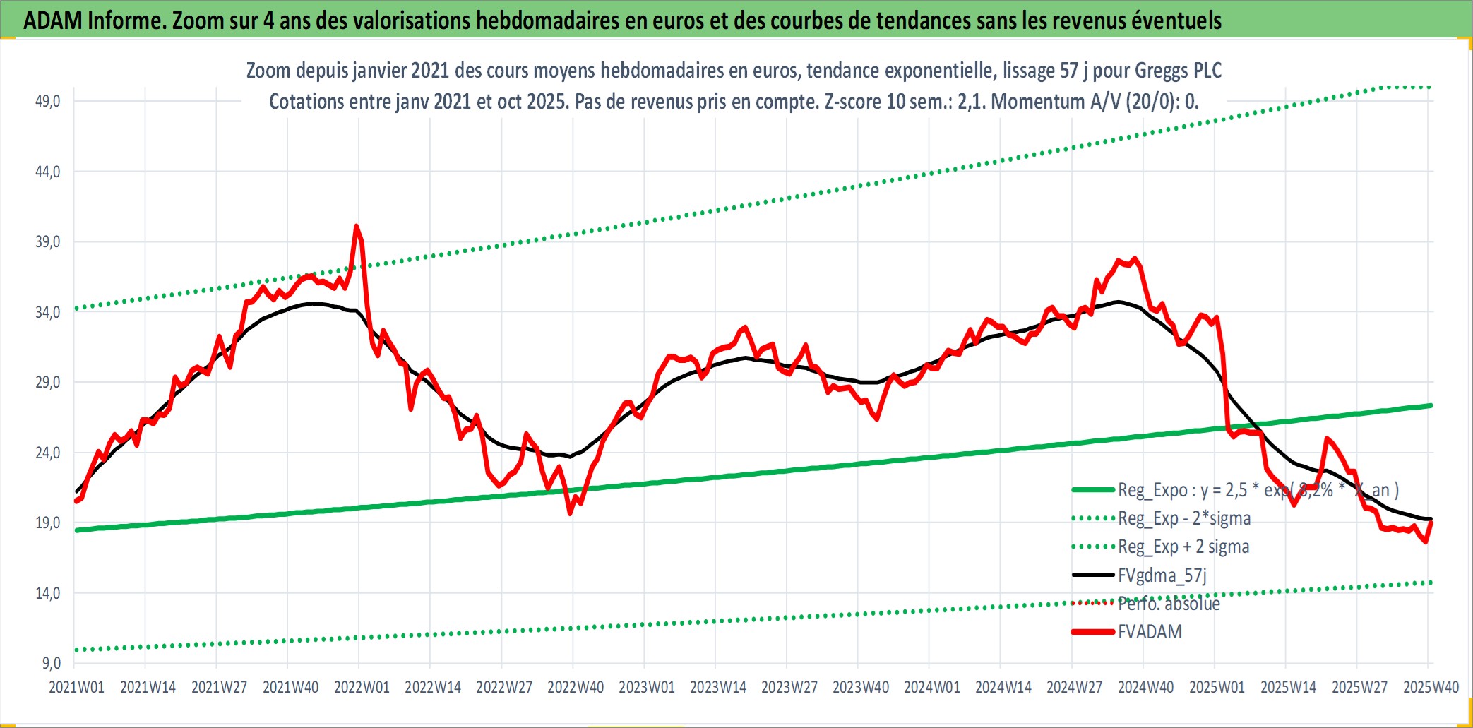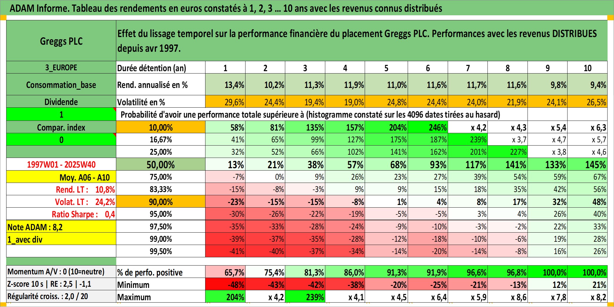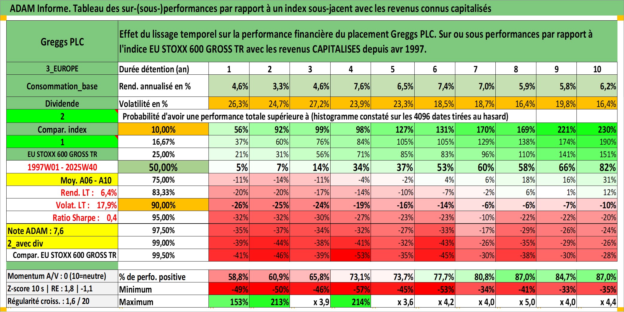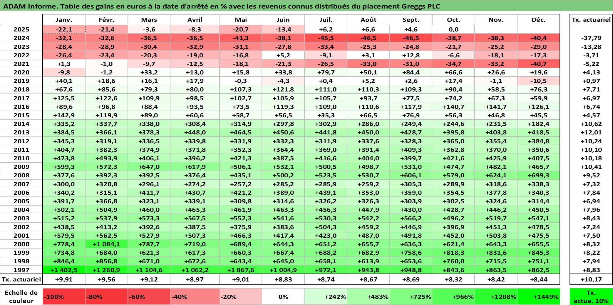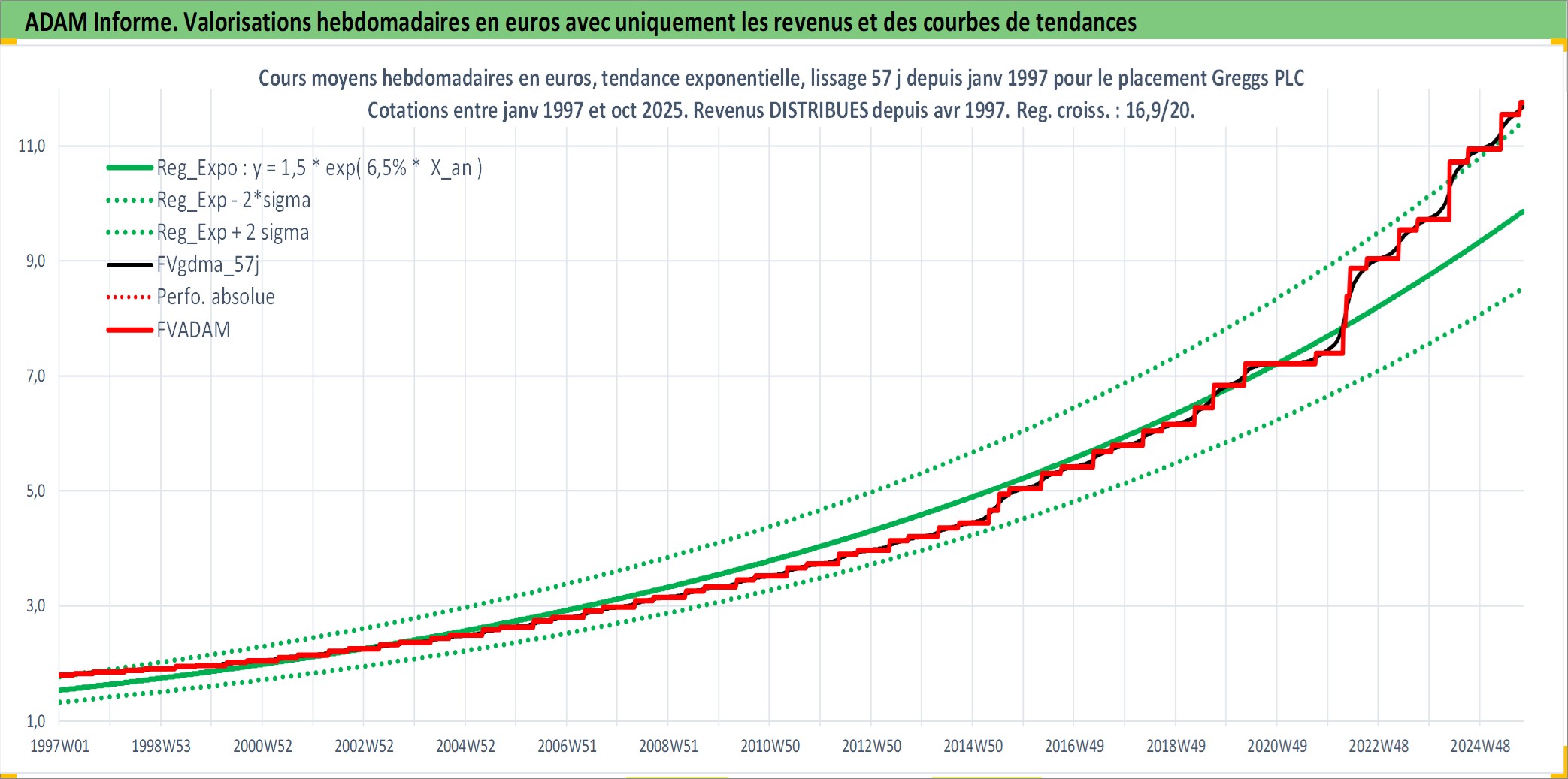 Site dédié aux investisseursPage dédiée sur site financeAnalyse des valorisations hebdomadaires de l'action Greggs PLC. Cet actif est cote en GBX. Les valorisations sont en contrevaleur EURO et couvrent les semaines 1997W01 a 2025W40. Les revenus de cet actif financier sont pris en compte depuis la semaine 1997W16. La note ESG de cet actif n'est pas connue.