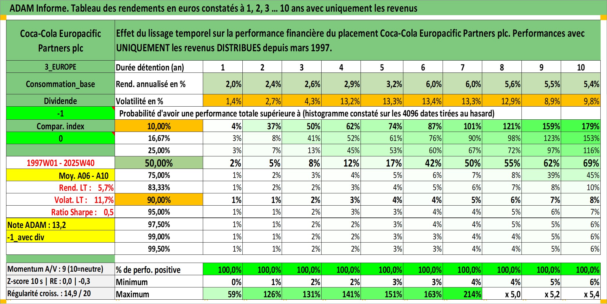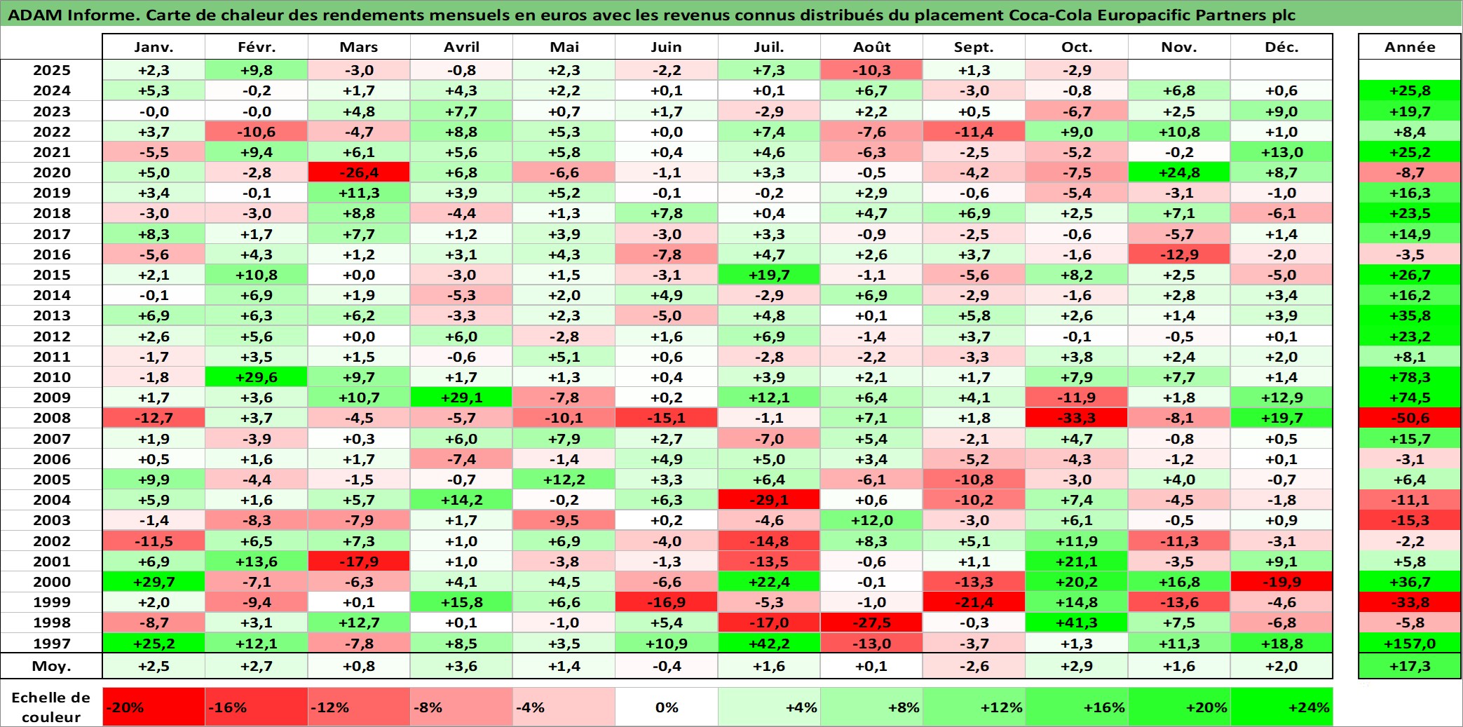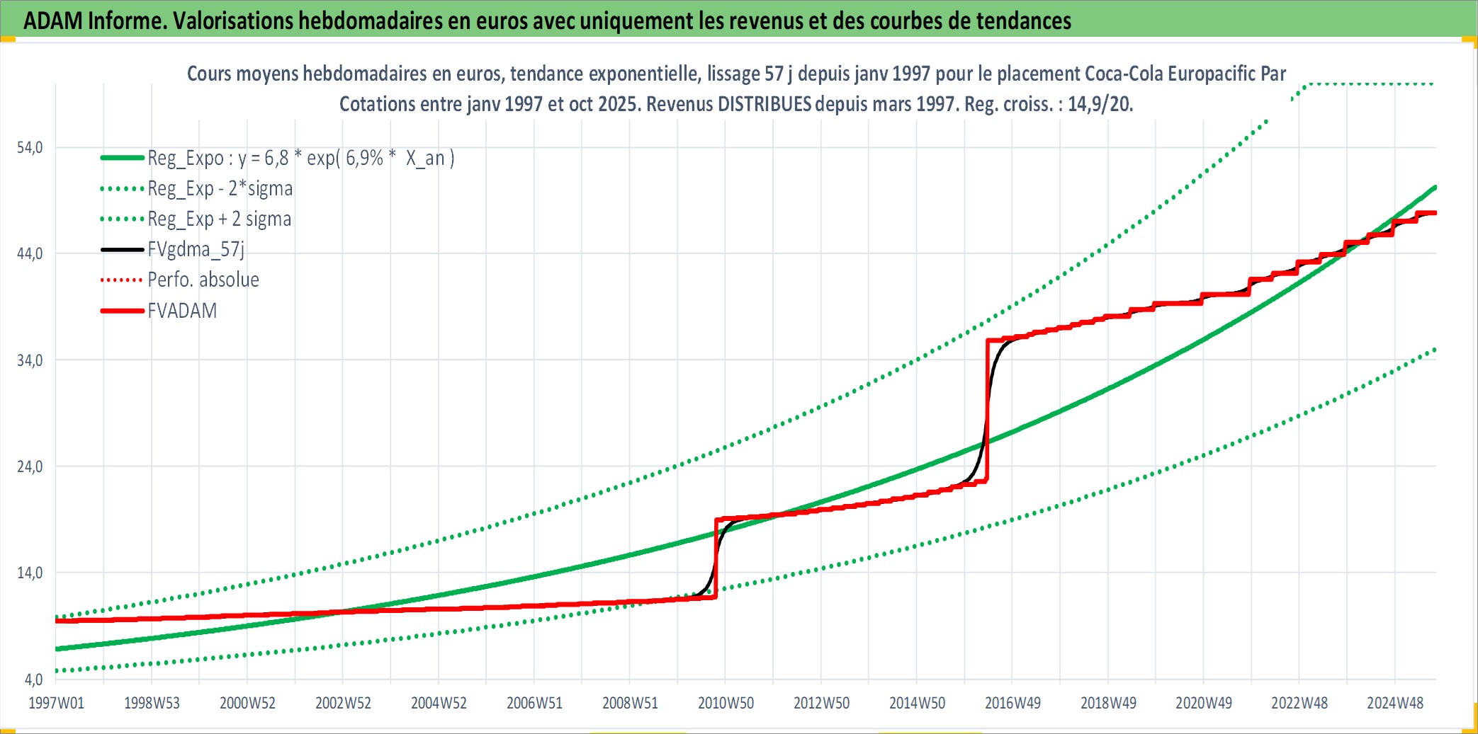Site dédié aux investisseursPage dédiée sur site financeAnalyse des valorisations hebdomadaires de l'action Coca-Cola Europacific Partners plc. Cet actif est cote en USD. Les valorisations sont en contrevaleur EURO et couvrent les semaines 1997W01 a 2025W40. Les revenus de cet actif financier sont pris en compte depuis la semaine 1997W12. La note ESG de cet actif n'est pas connue.