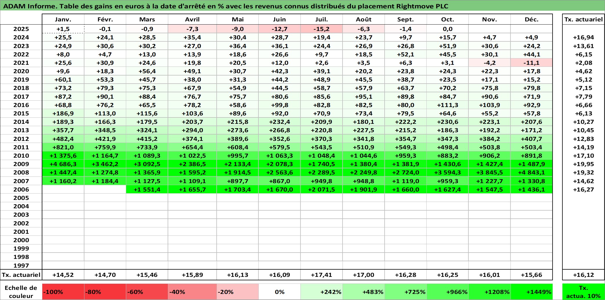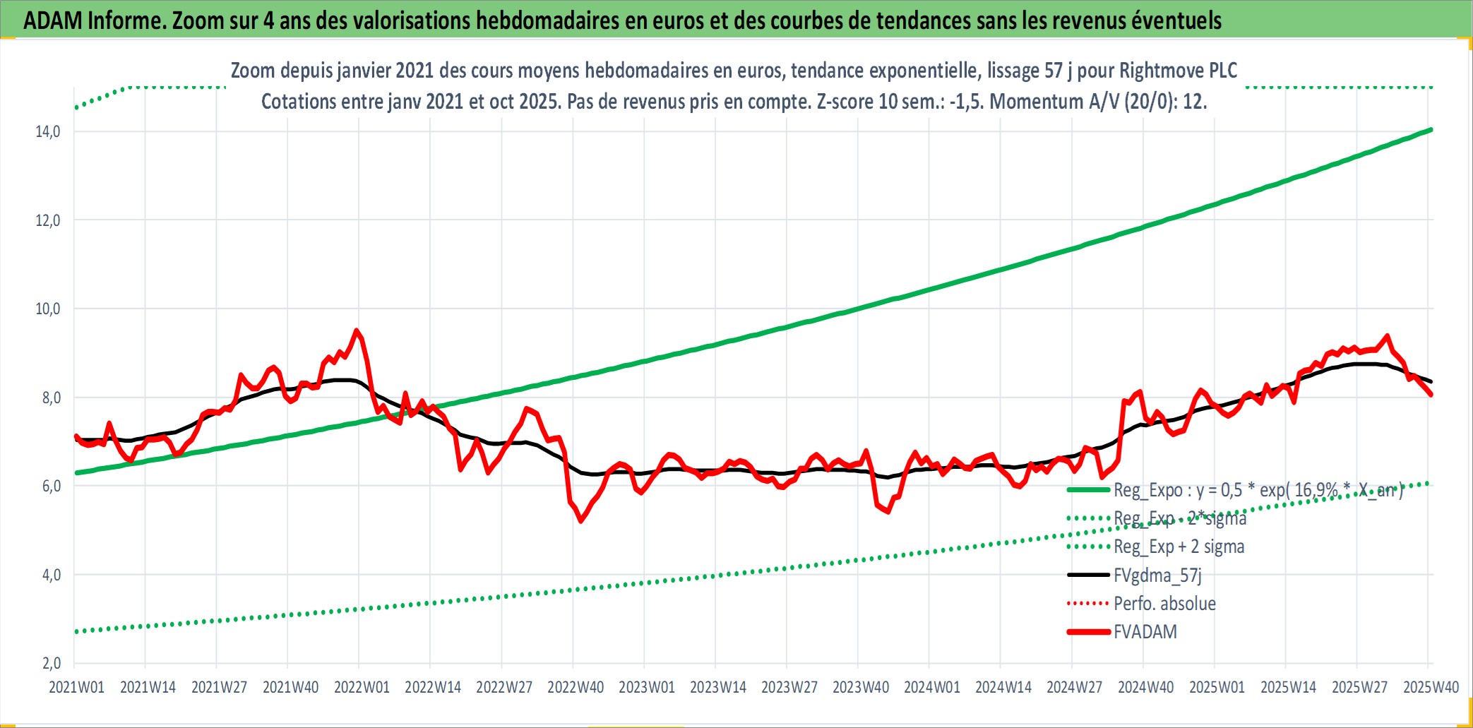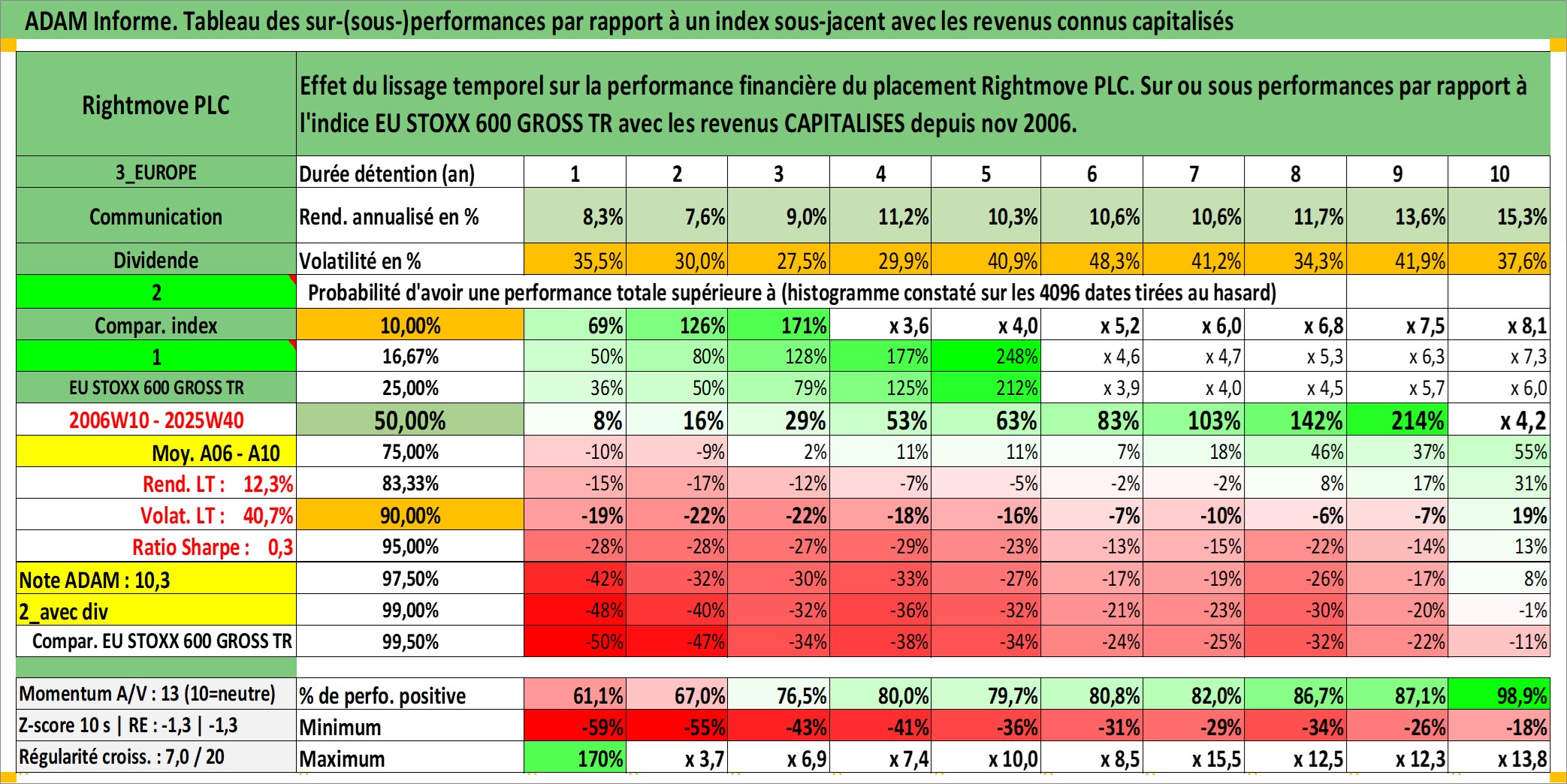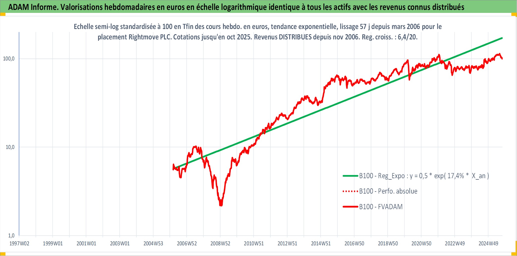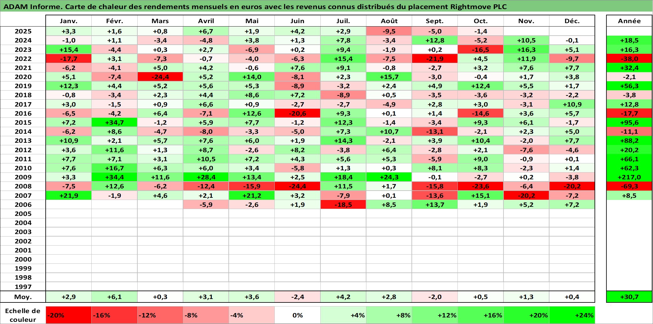 Site dédié aux investisseursPage dédiée sur site financeAnalyse des valorisations hebdomadaires de l'action Rightmove PLC. Cet actif est cote en GBX. Les valorisations sont en contrevaleur EURO et couvrent les semaines 2006W10 a 2025W40. Les revenus de cet actif financier sont pris en compte depuis la semaine 2006W47. La note ESG de cet actif n'est pas connue.