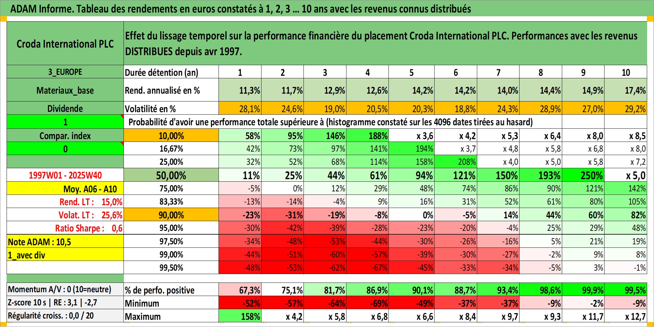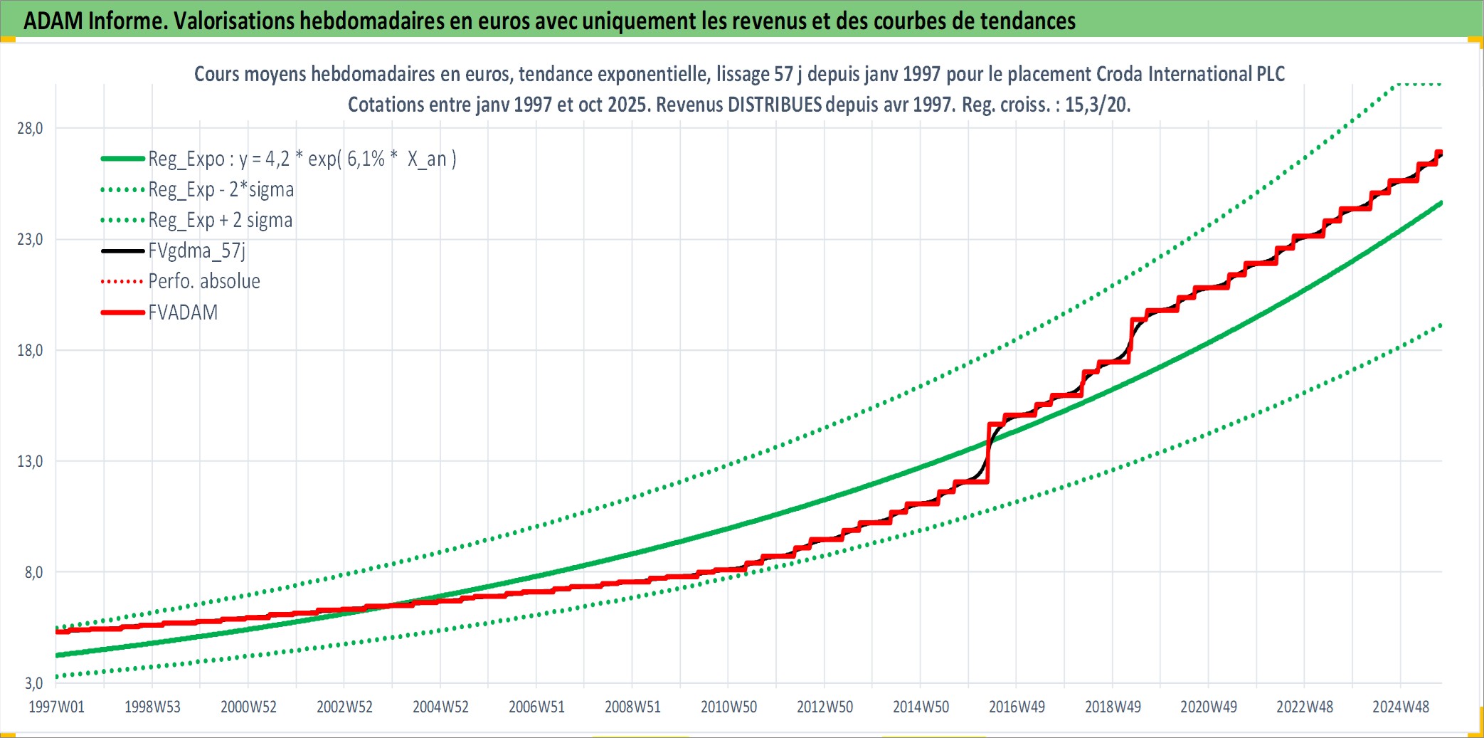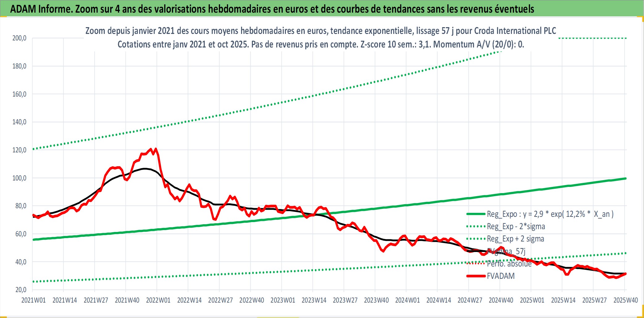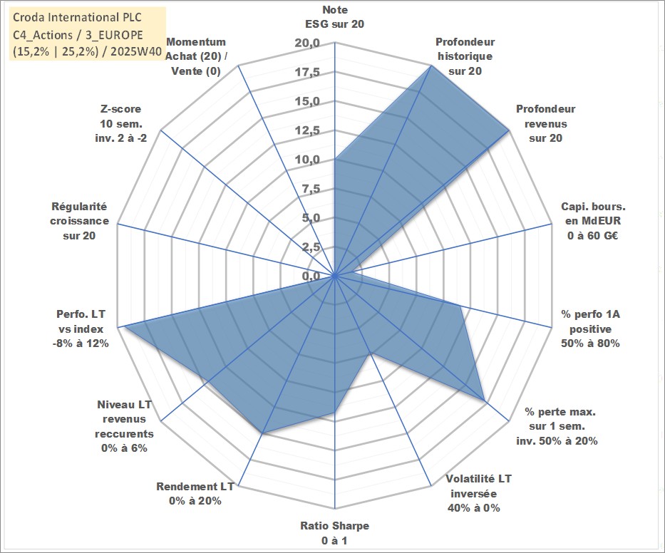 Site dédié aux investisseursPage dédiée sur site financeAnalyse des valorisations hebdomadaires de l'action Croda International PLC. Cet actif est cote en GBX. Les valorisations sont en contrevaleur EURO et couvrent les semaines 1997W01 a 2025W40. Les revenus de cet actif financier sont pris en compte depuis la semaine 1997W15. La note globale ESG de cet actif est estimee a 10.0 (apres rebasage entre 0 et 20).