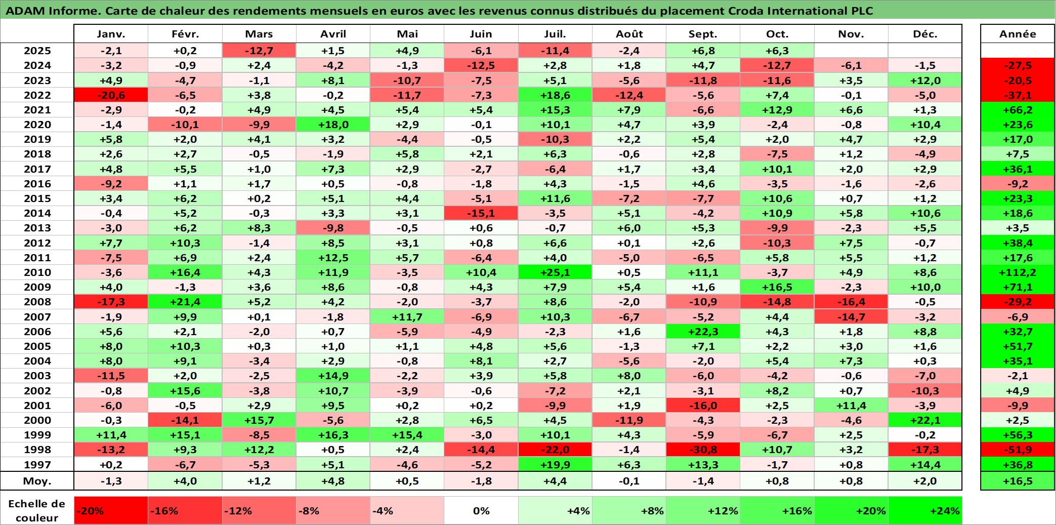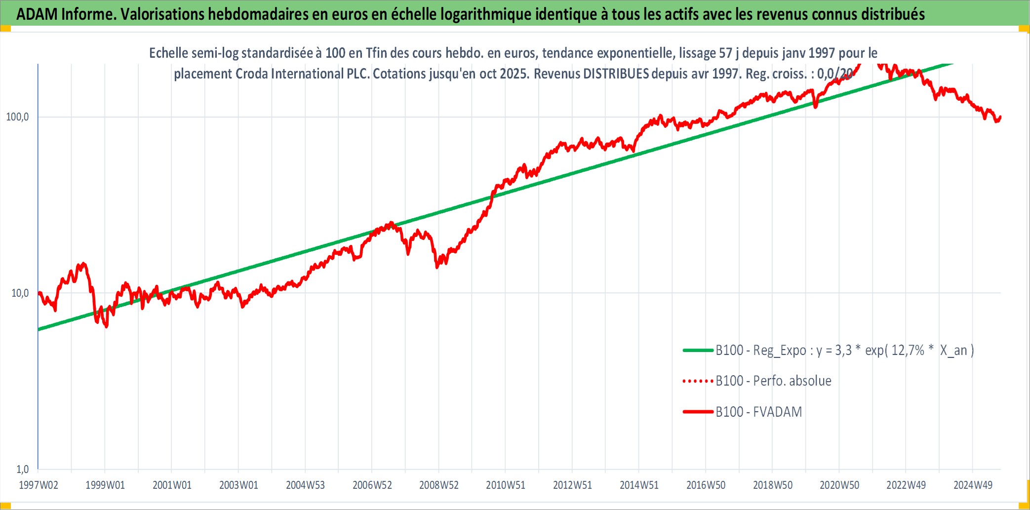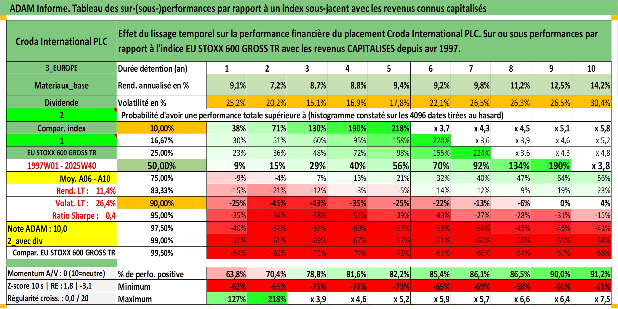 Site dédié aux investisseursPage dédiée sur site financeAnalyse des valorisations hebdomadaires de l'action Croda International PLC. Cet actif est cote en GBX. Les valorisations sont en contrevaleur EURO et couvrent les semaines 1997W01 a 2025W40. Les revenus de cet actif financier sont pris en compte depuis la semaine 1997W15. La note globale ESG de cet actif est estimee a 10.0 (apres rebasage entre 0 et 20).