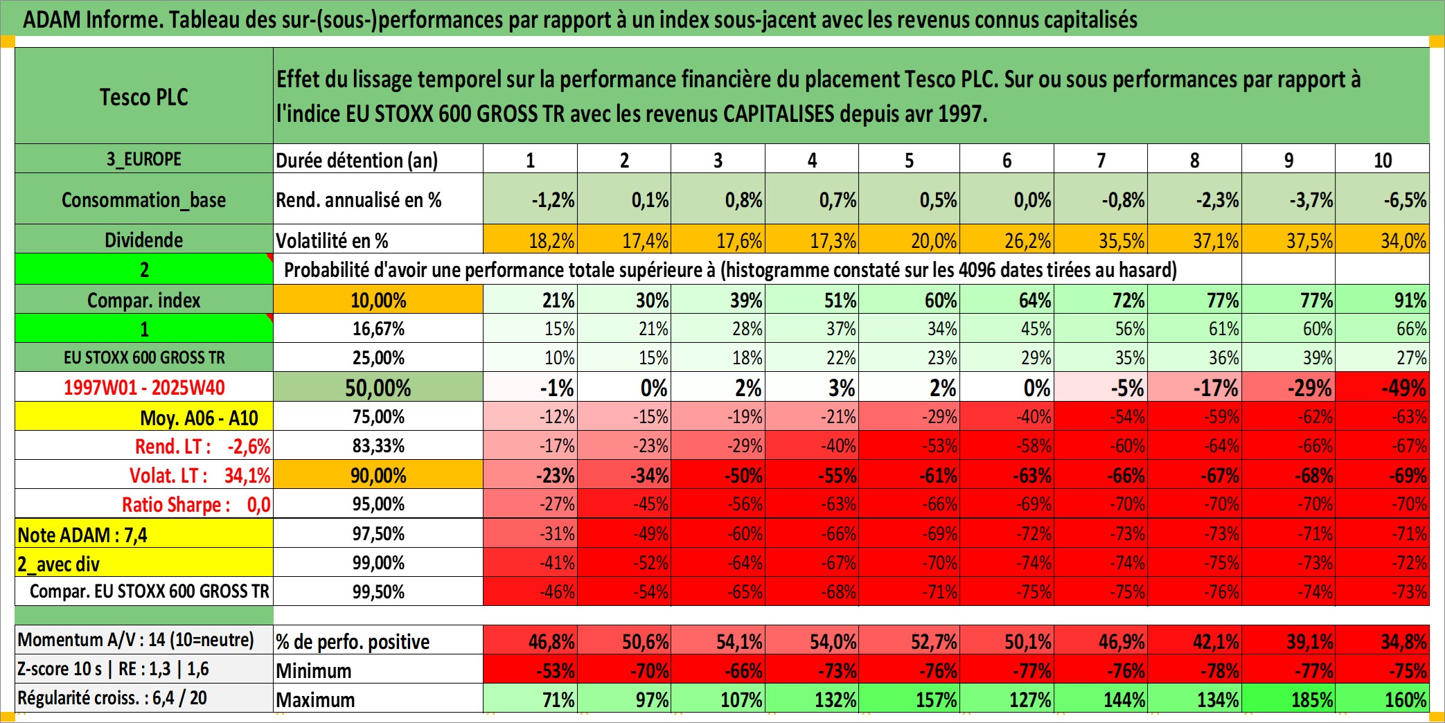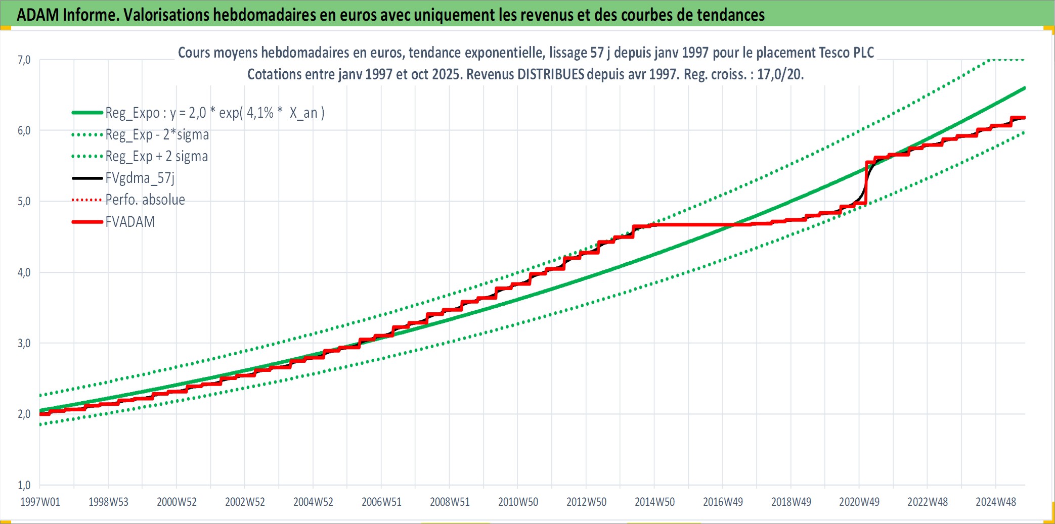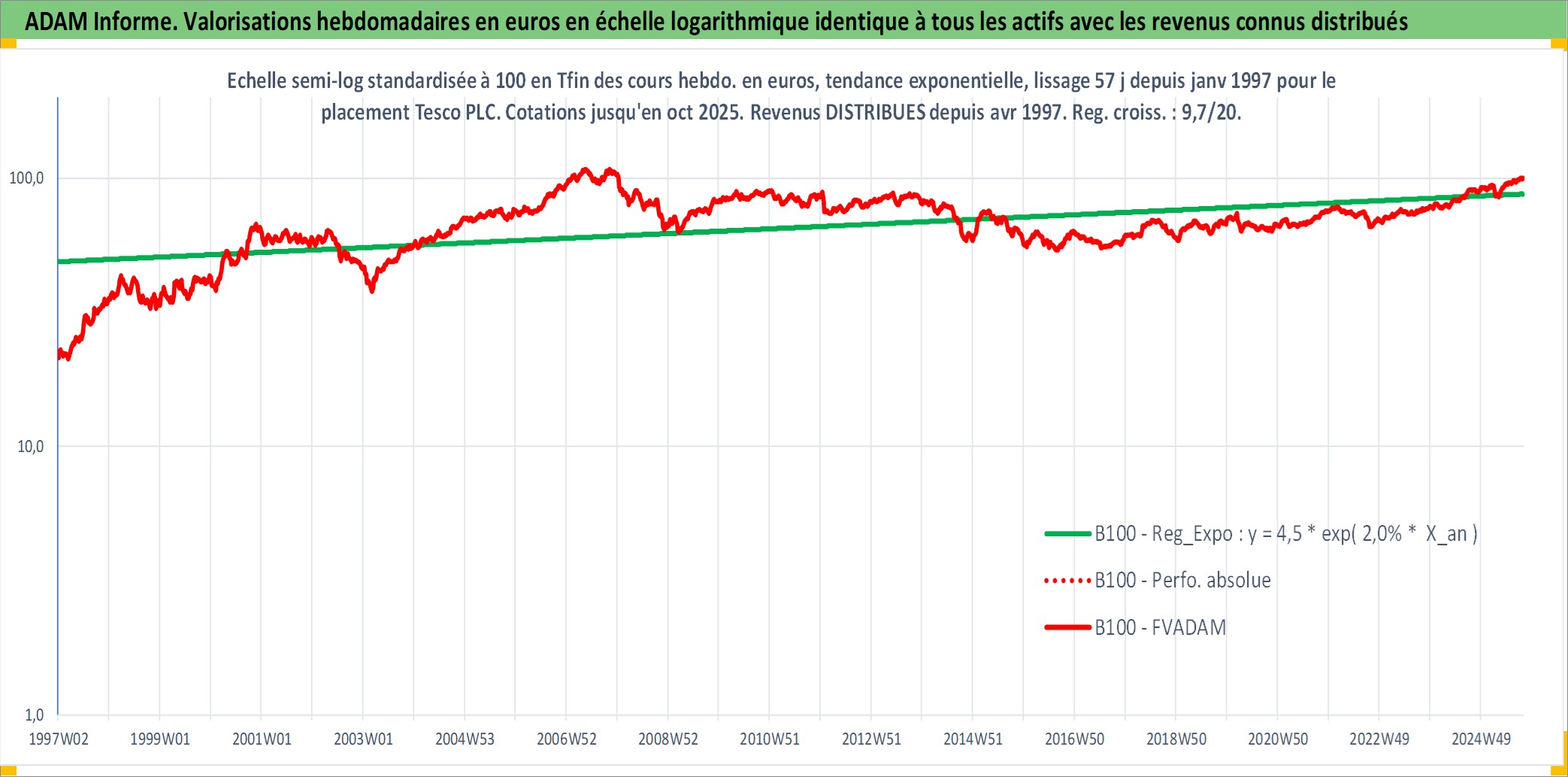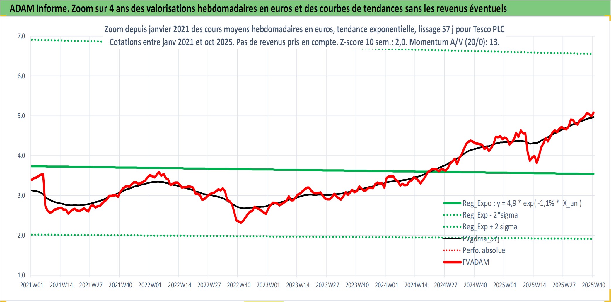 Site dédié aux investisseursPage dédiée sur site financeAnalyse des valorisations hebdomadaires de l'action Tesco PLC. Cet actif est cote en GBX. Les valorisations sont en contrevaleur EURO et couvrent les semaines 1997W01 a 2025W40. Les revenus de cet actif financier sont pris en compte depuis la semaine 1997W16. La note globale ESG de cet actif est estimee a 10.0 (apres rebasage entre 0 et 20).