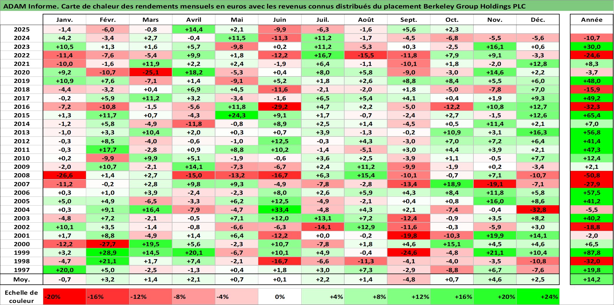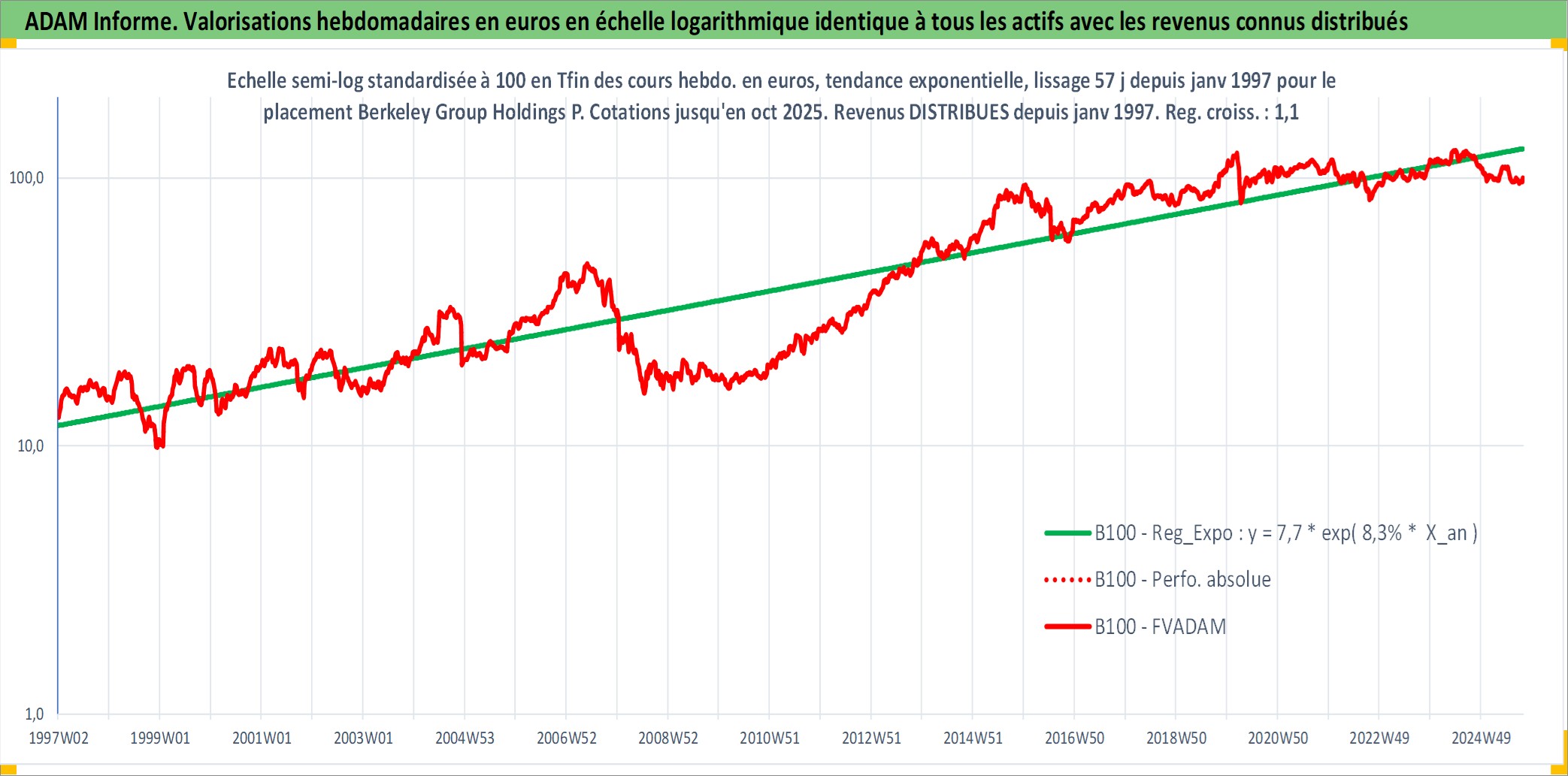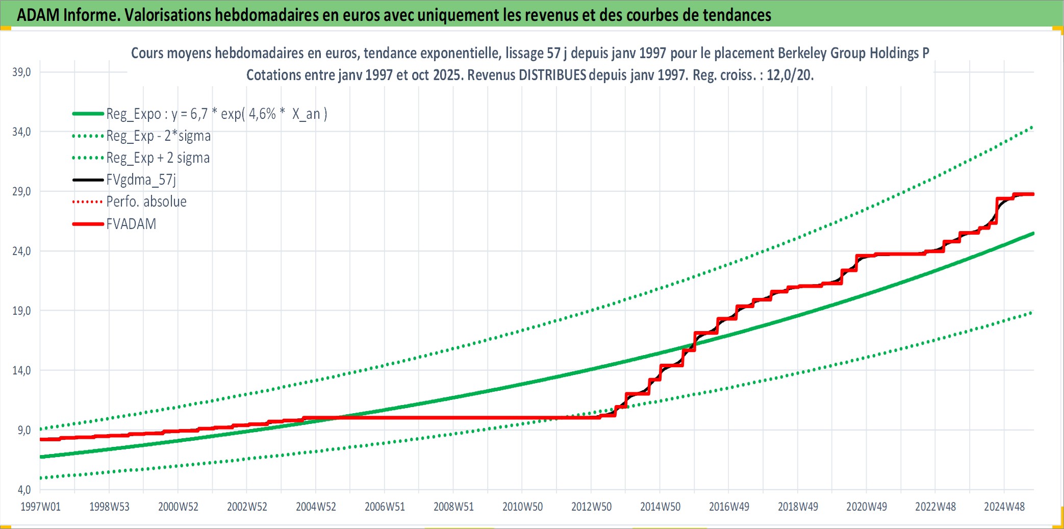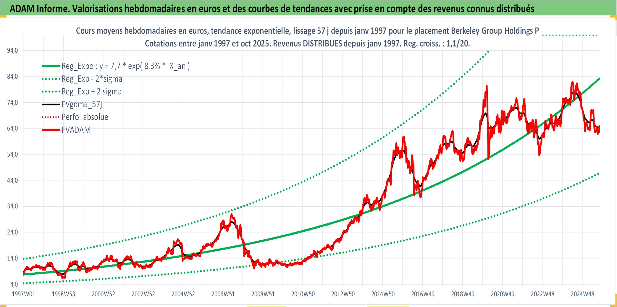 Site dédié aux investisseursPage dédiée sur site financeAnalyse des valorisations hebdomadaires de l'action Berkeley Group Holdings PLC. Cet actif est cote en GBX. Les valorisations sont en contrevaleur EURO et couvrent les semaines 1997W01 a 2025W40. Les revenus de cet actif financier sont pris en compte depuis la semaine 1997W02. La note ESG de cet actif n'est pas connue.