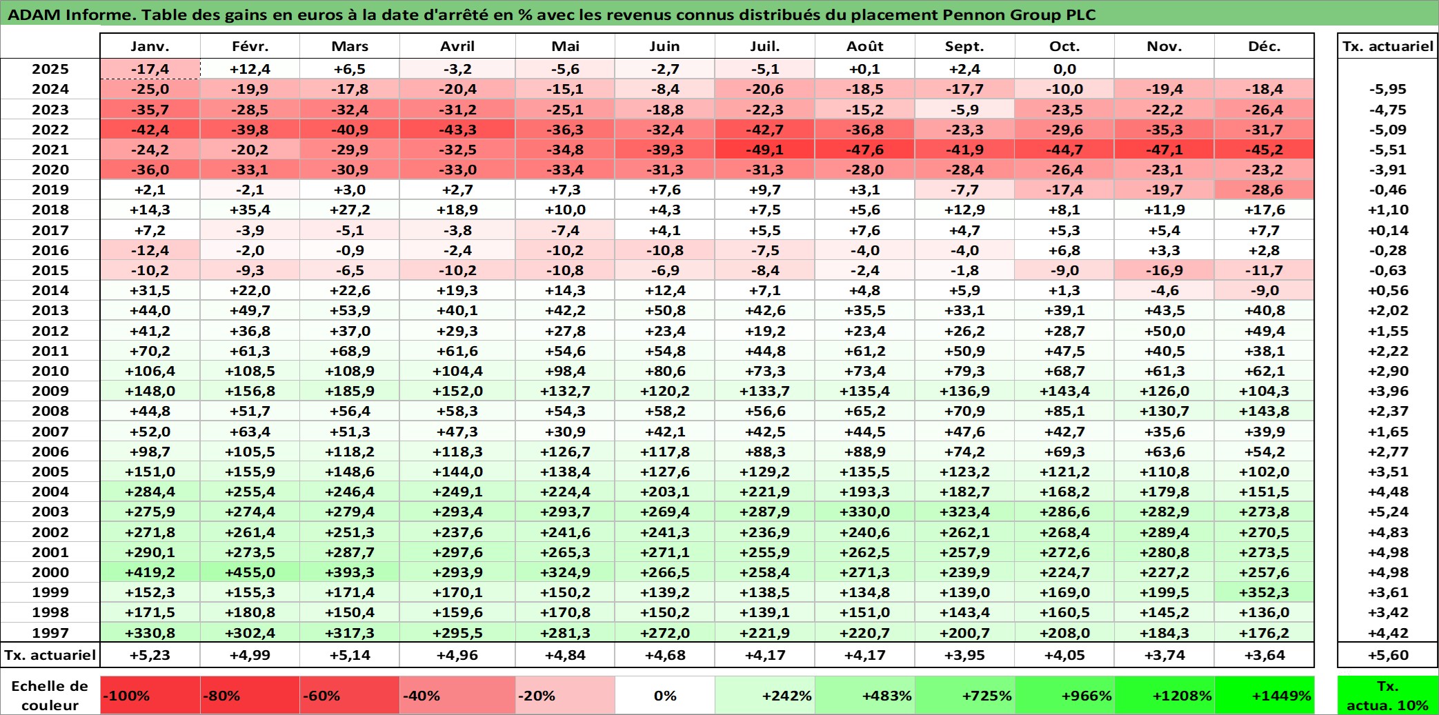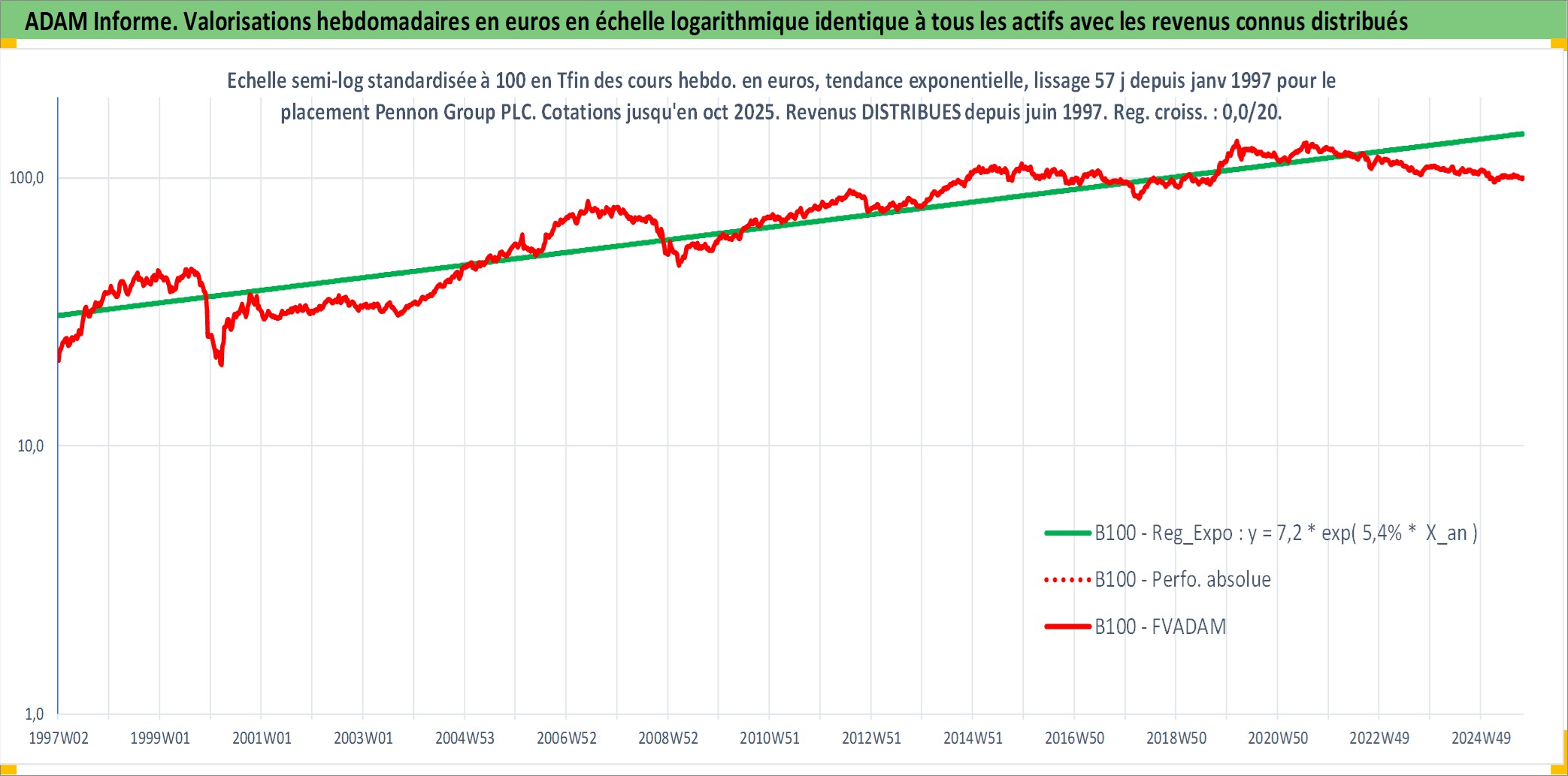 Site dédié aux investisseursPage dédiée sur site financeAnalyse des valorisations hebdomadaires de l'action Pennon Group PLC. Cet actif est cote en GBX. Les valorisations sont en contrevaleur EURO et couvrent les semaines 1997W01 a 2025W40. Les revenus de cet actif financier sont pris en compte depuis la semaine 1997W24. La note ESG de cet actif n'est pas connue.