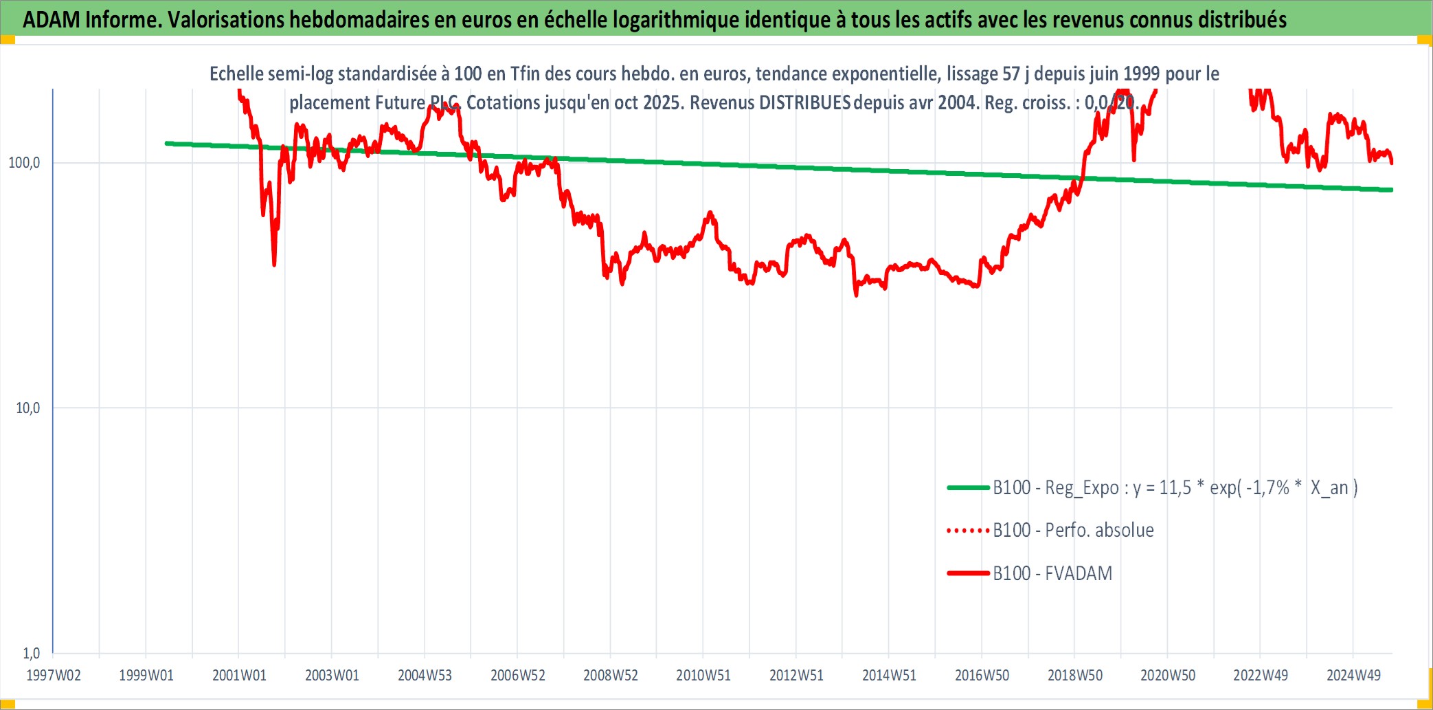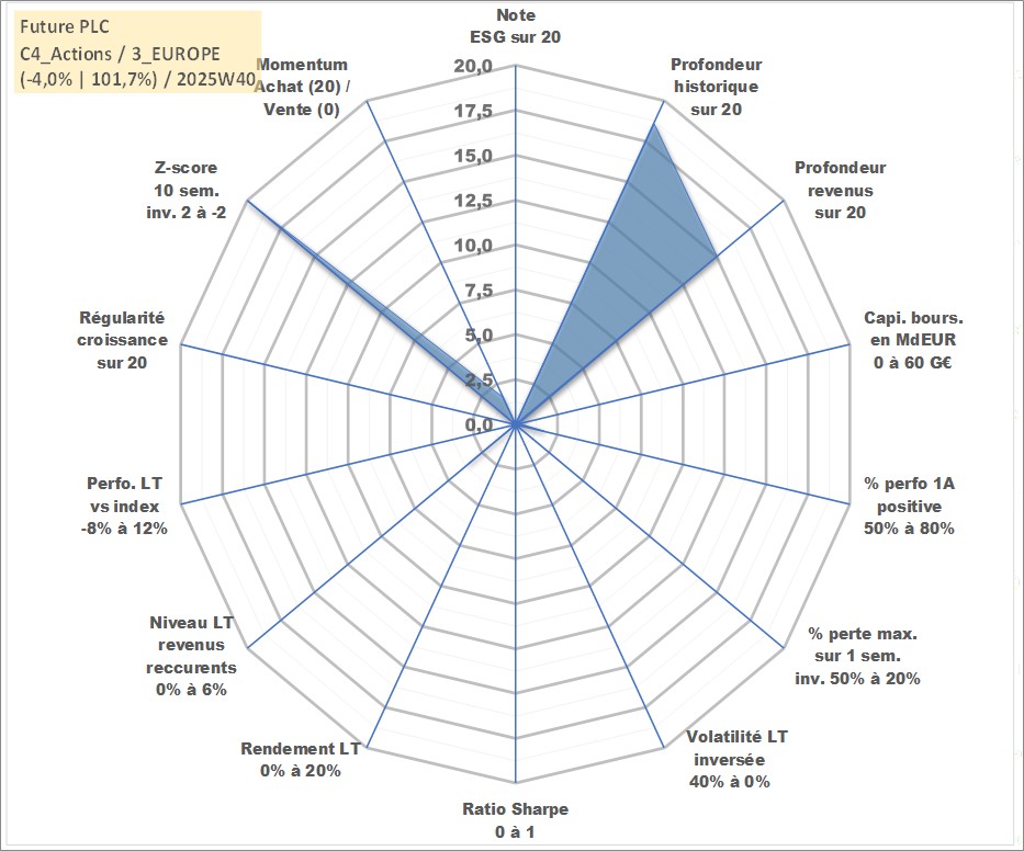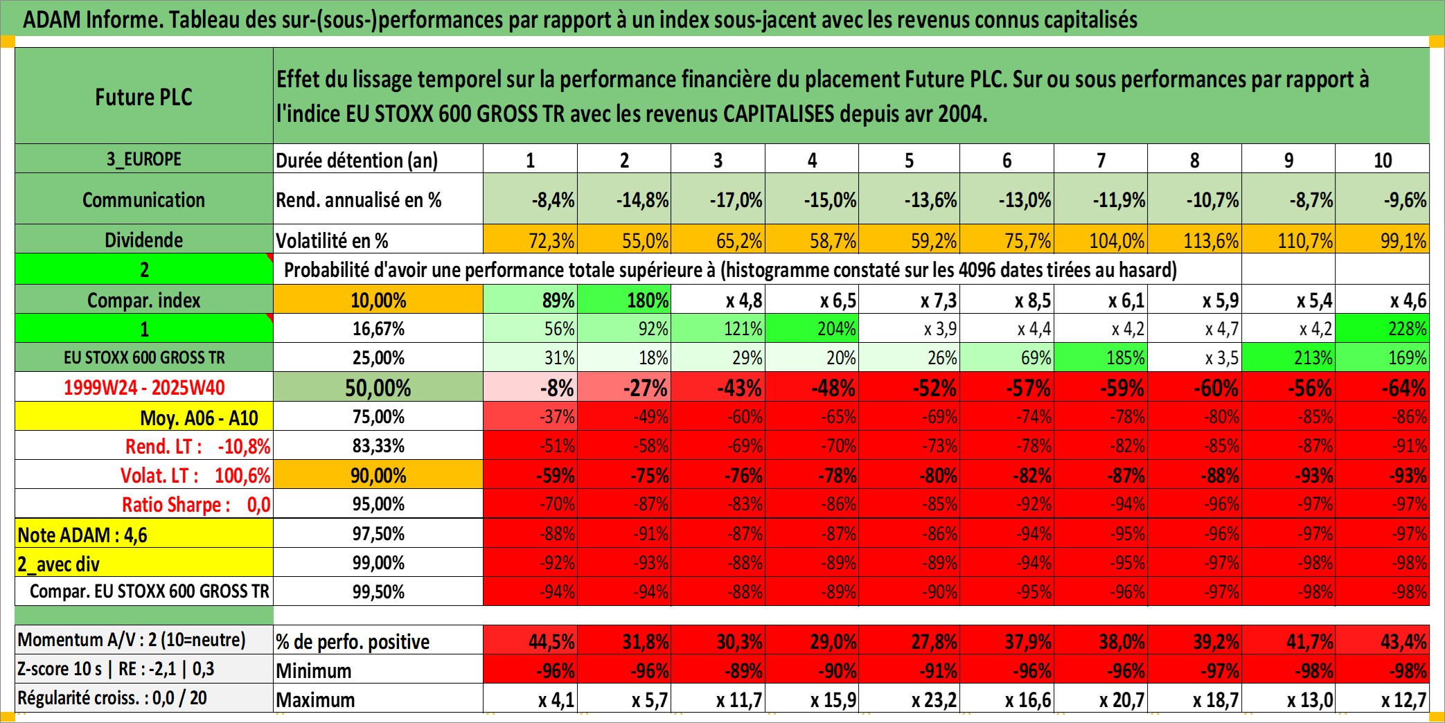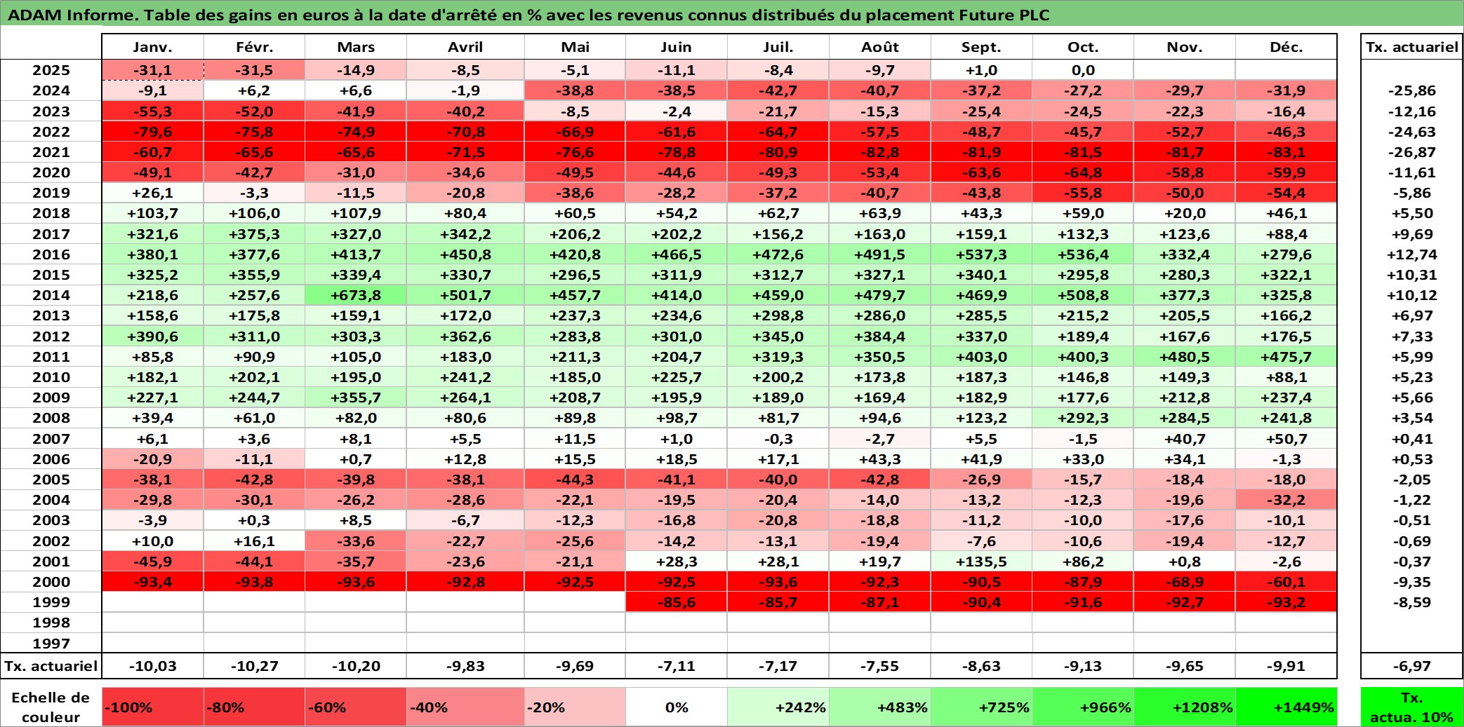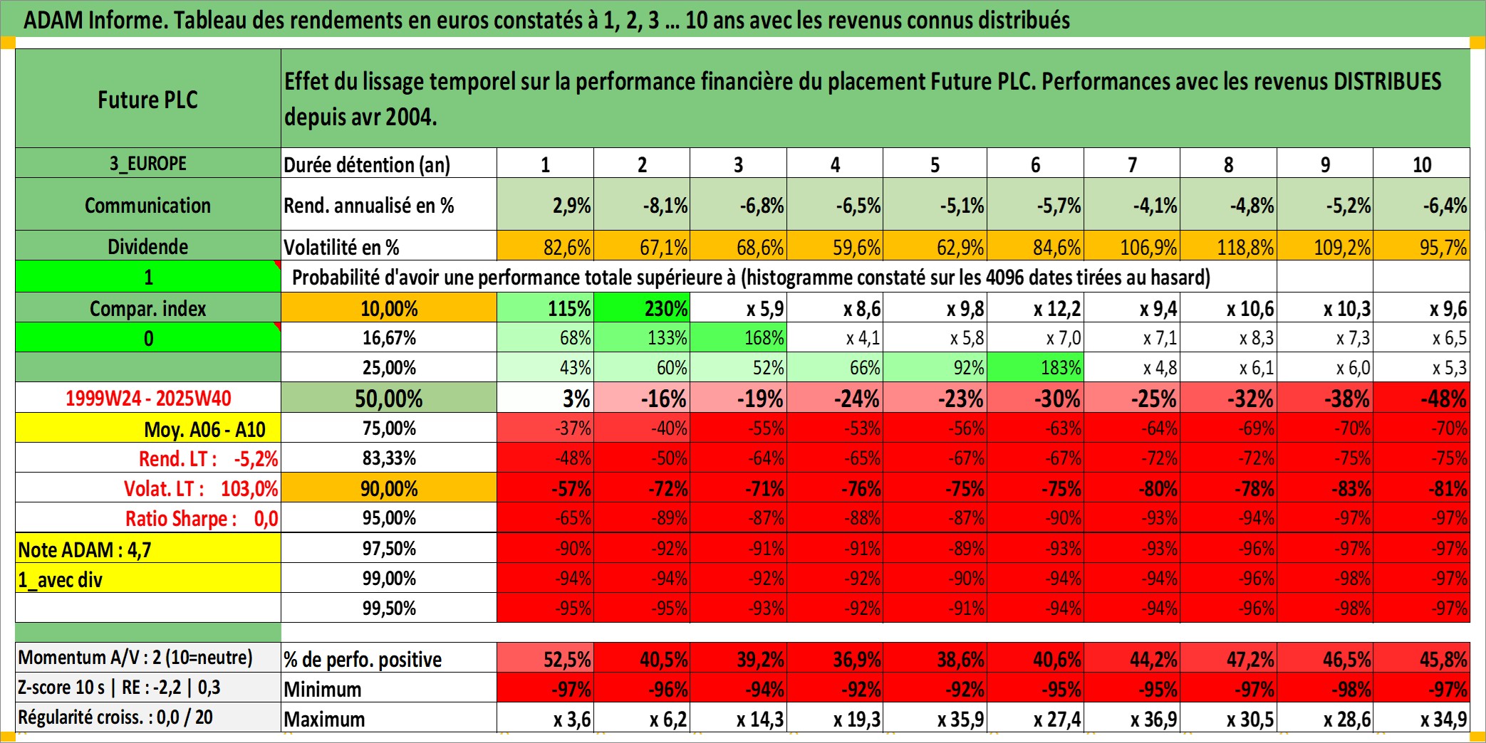Site dédié aux investisseursPage dédiée sur site financeAnalyse des valorisations hebdomadaires de l'action Future PLC. Cet actif est cote en GBX. Les valorisations sont en contrevaleur EURO et couvrent les semaines 1999W24 a 2025W40. Les revenus de cet actif financier sont pris en compte depuis la semaine 2004W17. La note ESG de cet actif n'est pas connue.