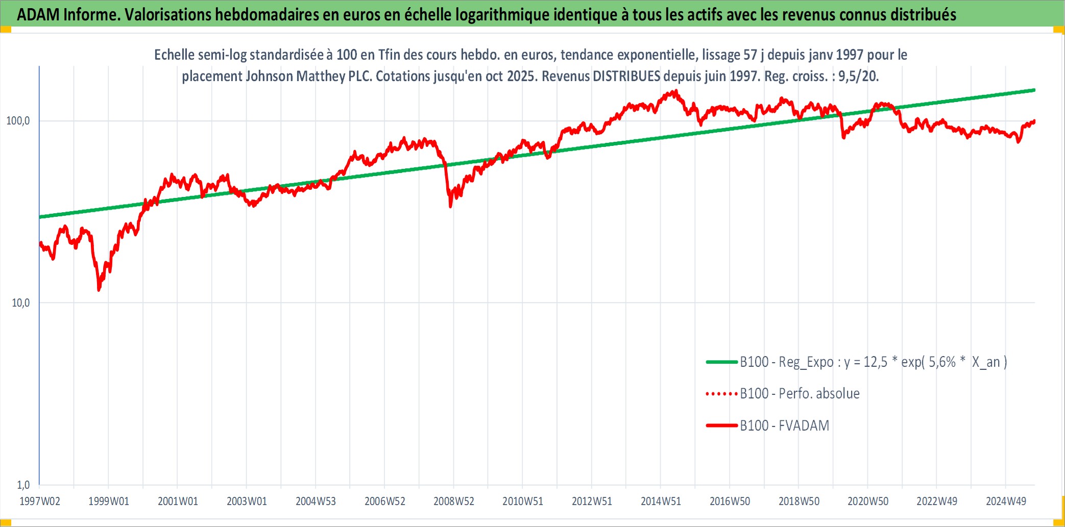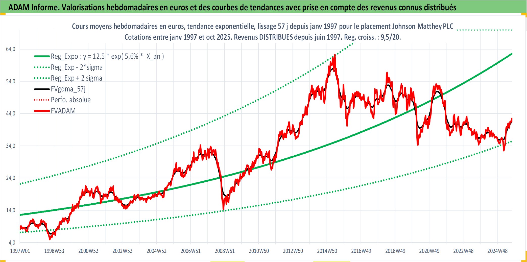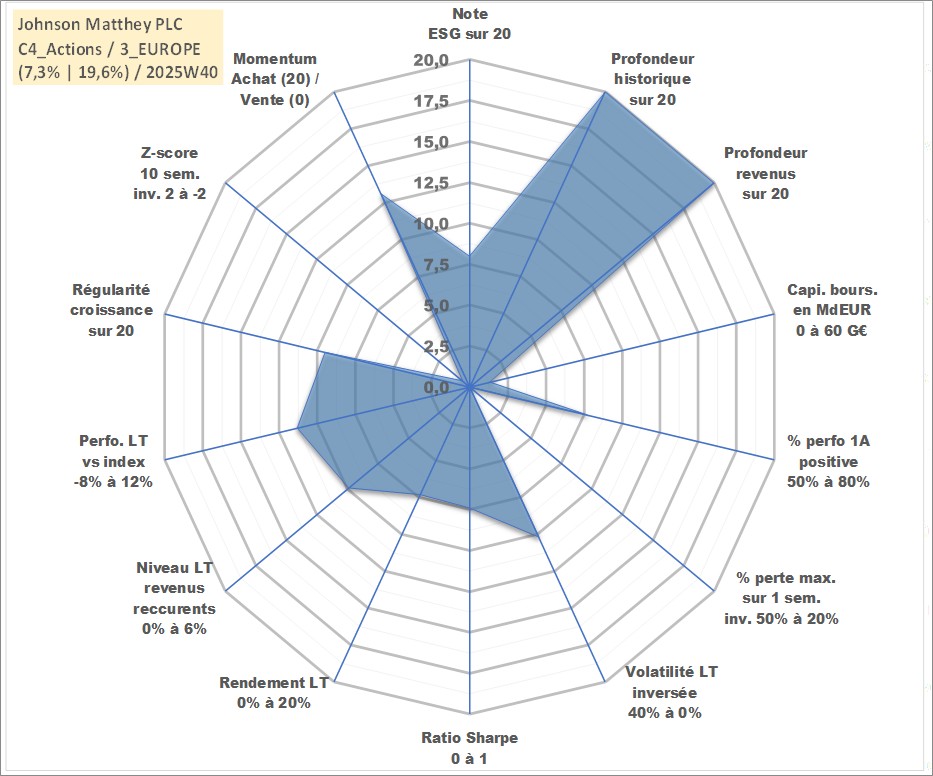 Site dédié aux investisseursPage dédiée sur site financeAnalyse des valorisations hebdomadaires de l'action Johnson Matthey PLC. Cet actif est cote en GBX. Les valorisations sont en contrevaleur EURO et couvrent les semaines 1997W01 a 2025W40. Les revenus de cet actif financier sont pris en compte depuis la semaine 1997W26. La note globale ESG de cet actif est estimee a 8.0 (apres rebasage entre 0 et 20).