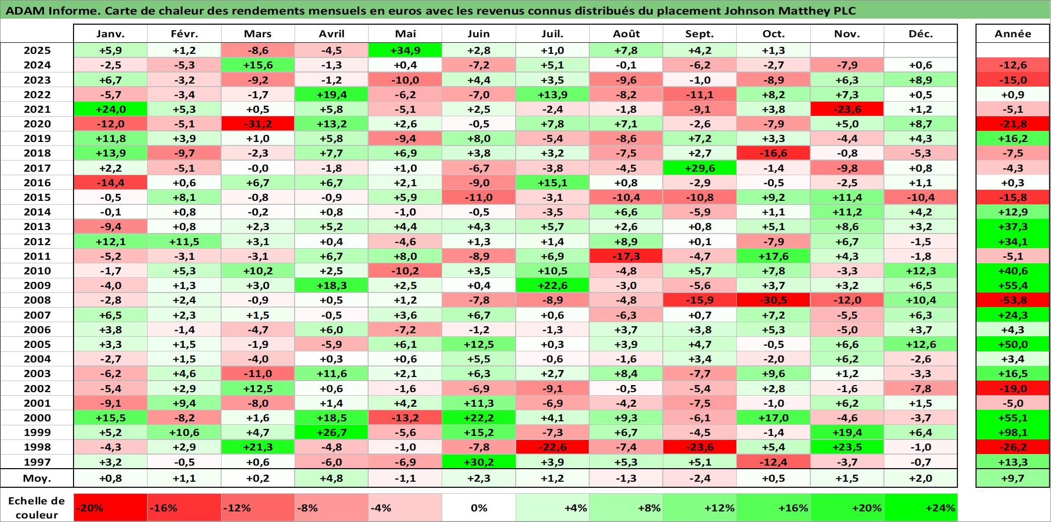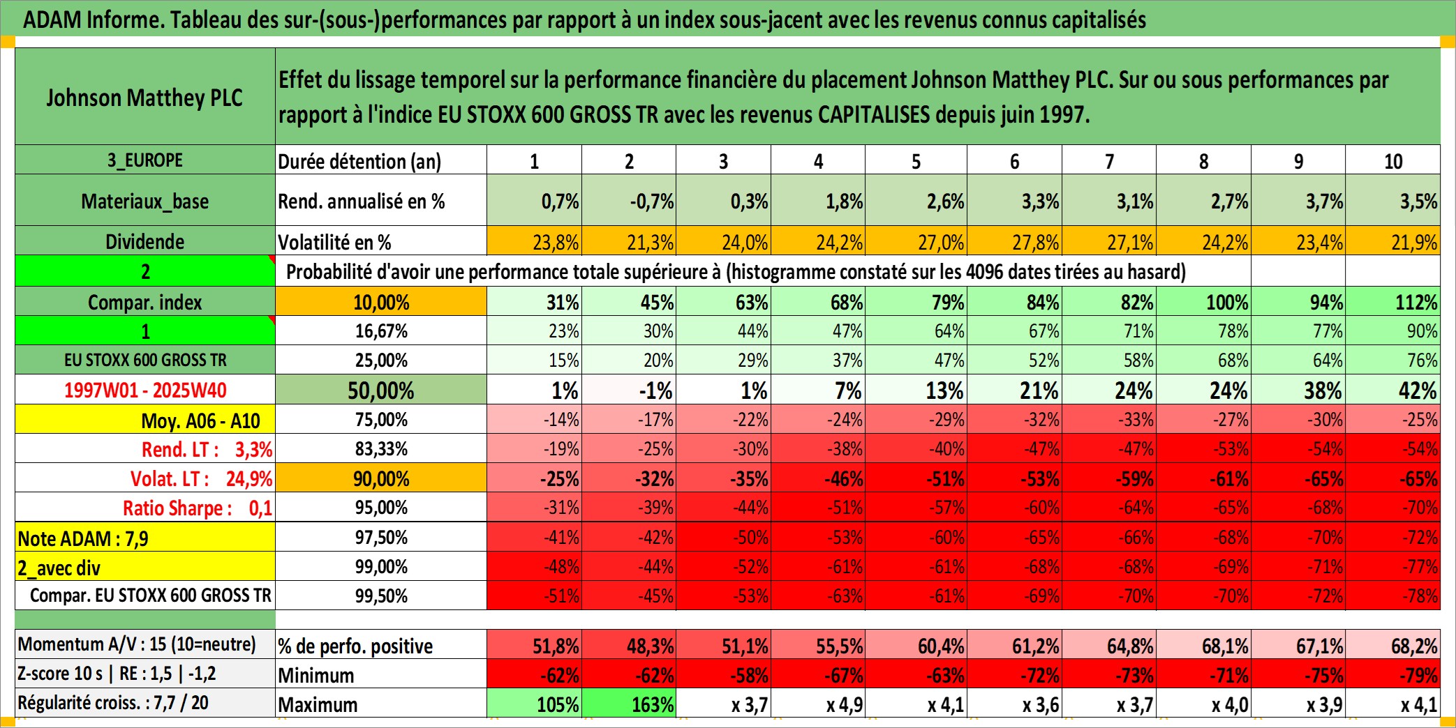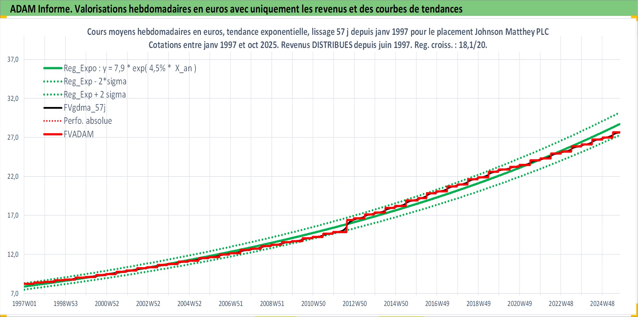Site dédié aux investisseursPage dédiée sur site financeAnalyse des valorisations hebdomadaires de l'action Johnson Matthey PLC. Cet actif est cote en GBX. Les valorisations sont en contrevaleur EURO et couvrent les semaines 1997W01 a 2025W40. Les revenus de cet actif financier sont pris en compte depuis la semaine 1997W26. La note globale ESG de cet actif est estimee a 8.0 (apres rebasage entre 0 et 20).