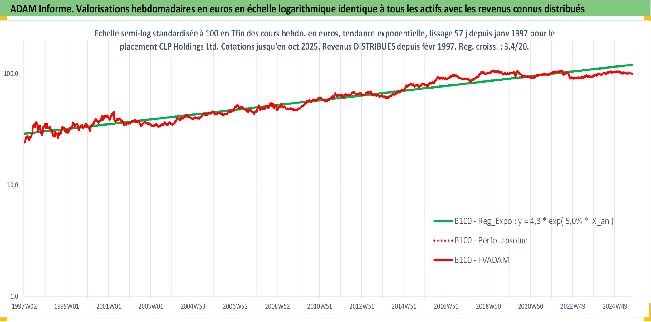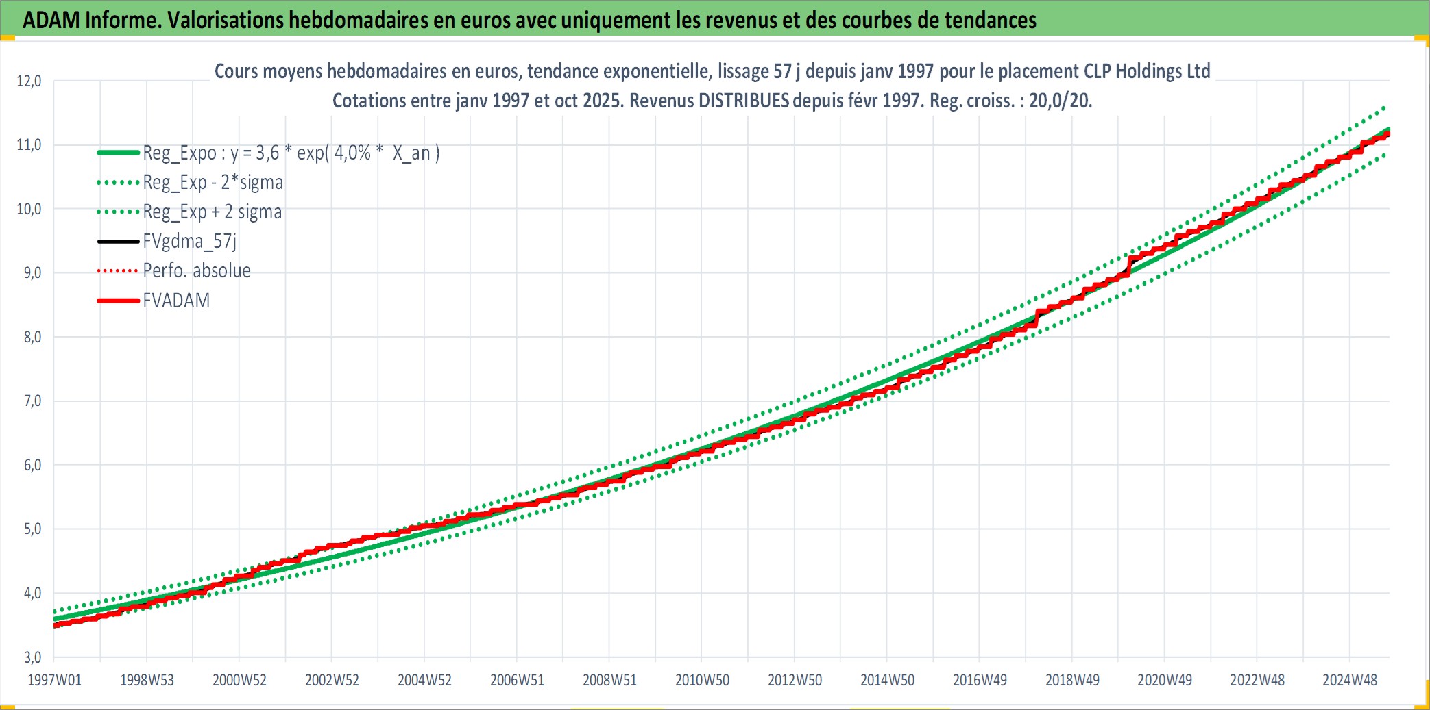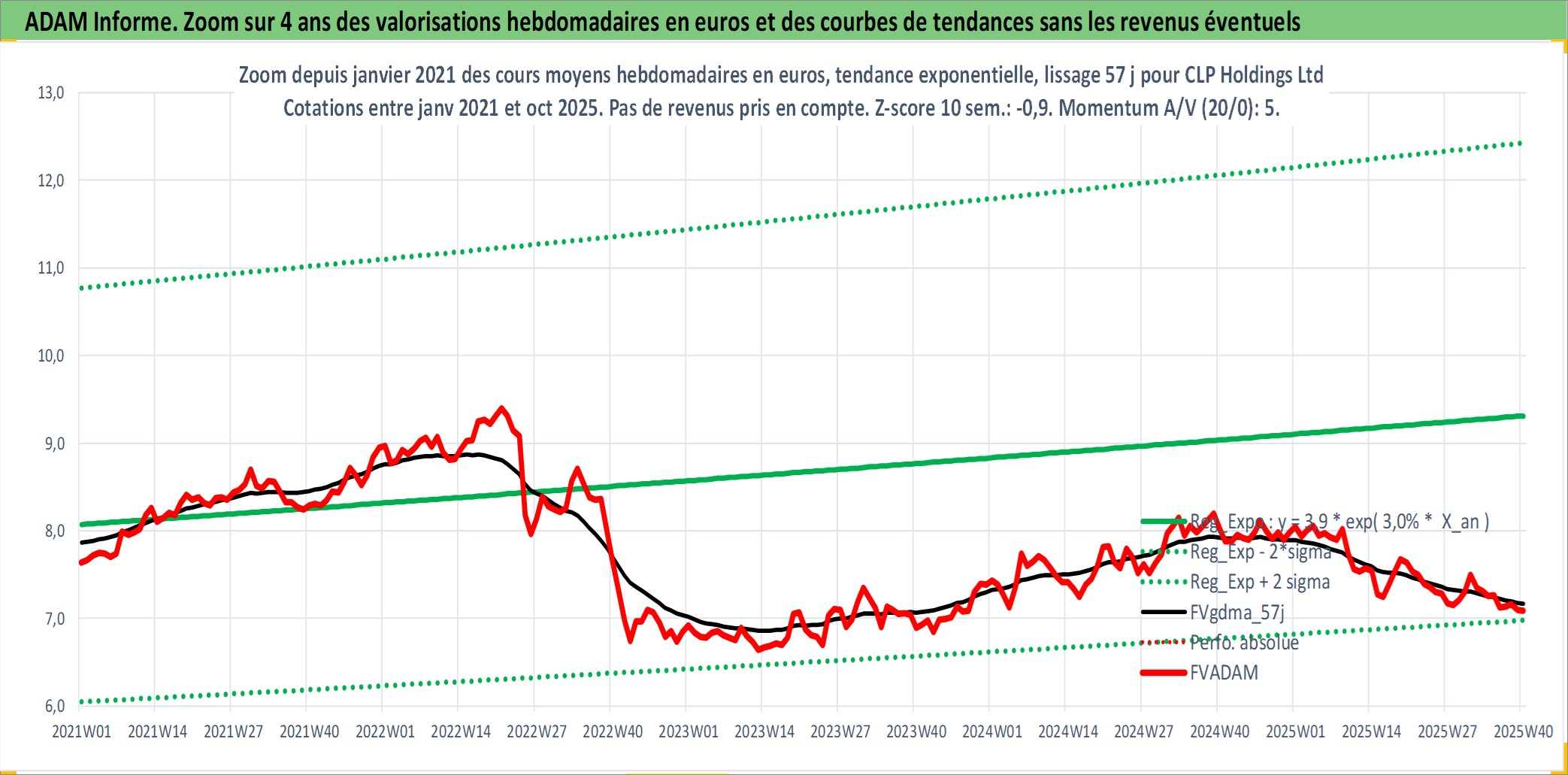 Site dédié aux investisseursPage dédiée sur site financeAnalyse des valorisations hebdomadaires de l'action CLP Holdings Ltd. Cet actif est cote en HKD. Les valorisations sont en contrevaleur EURO et couvrent les semaines 1997W01 a 2025W40. Les revenus de cet actif financier sont pris en compte depuis la semaine 1997W07. La note globale ESG de cet actif est estimee a 6.0 (apres rebasage entre 0 et 20).