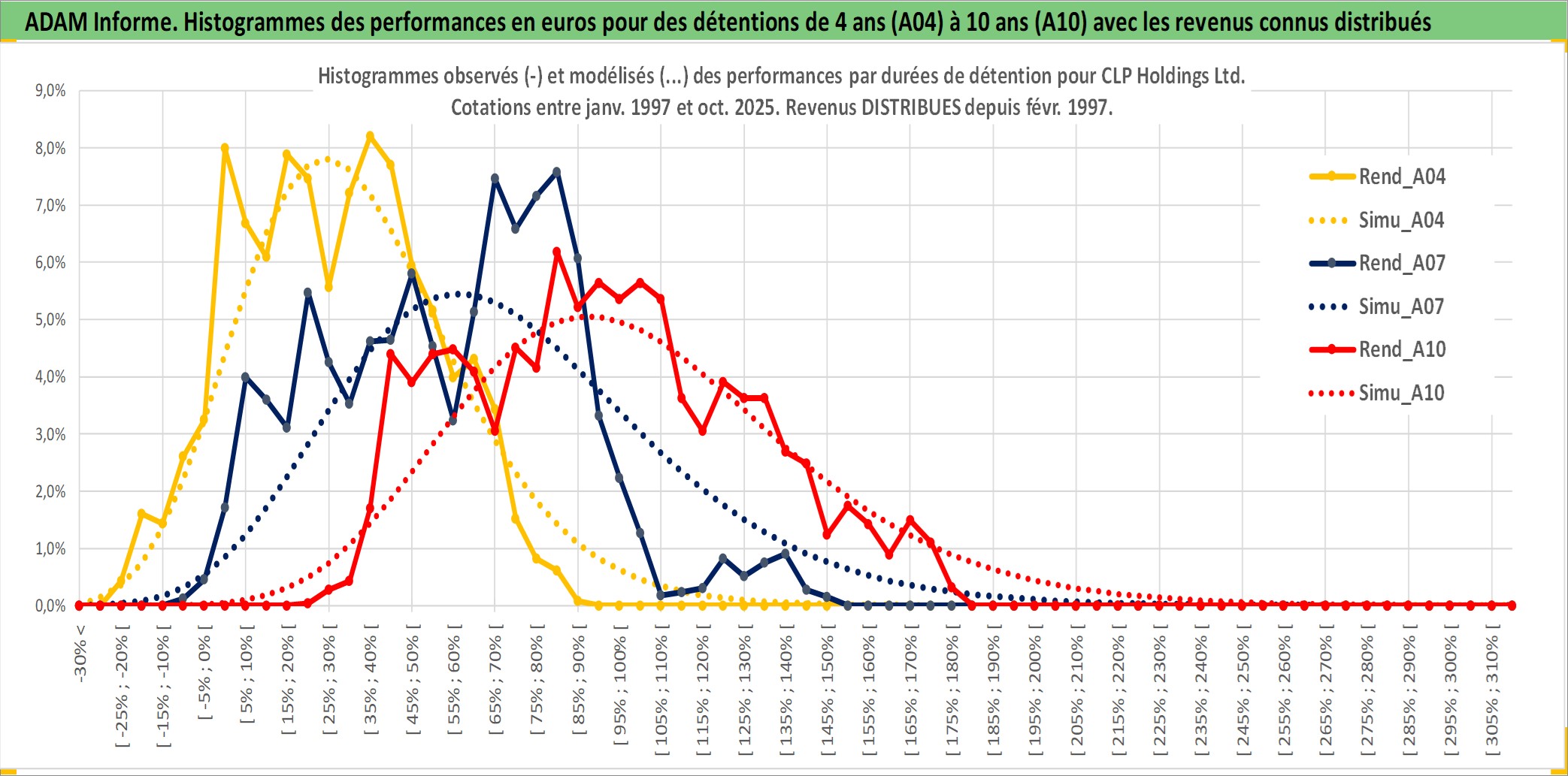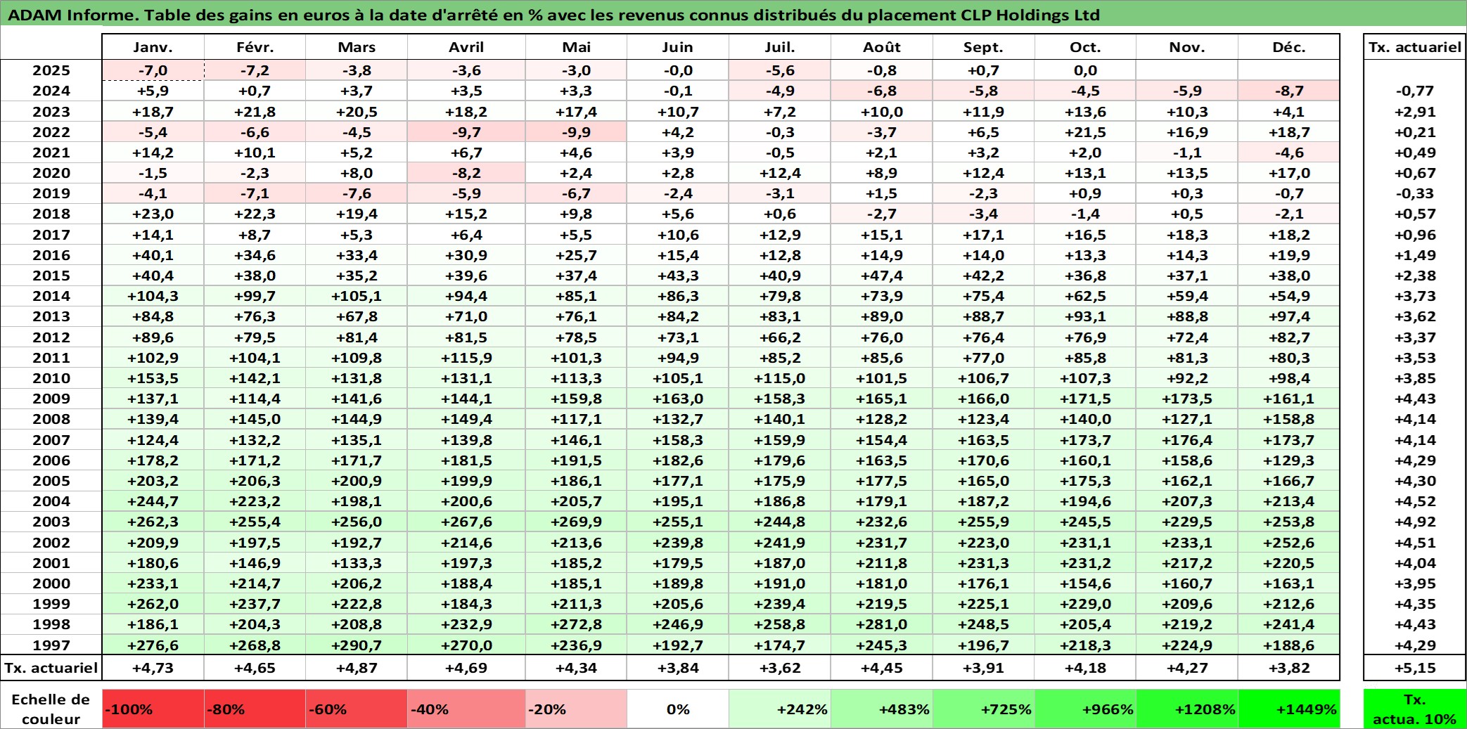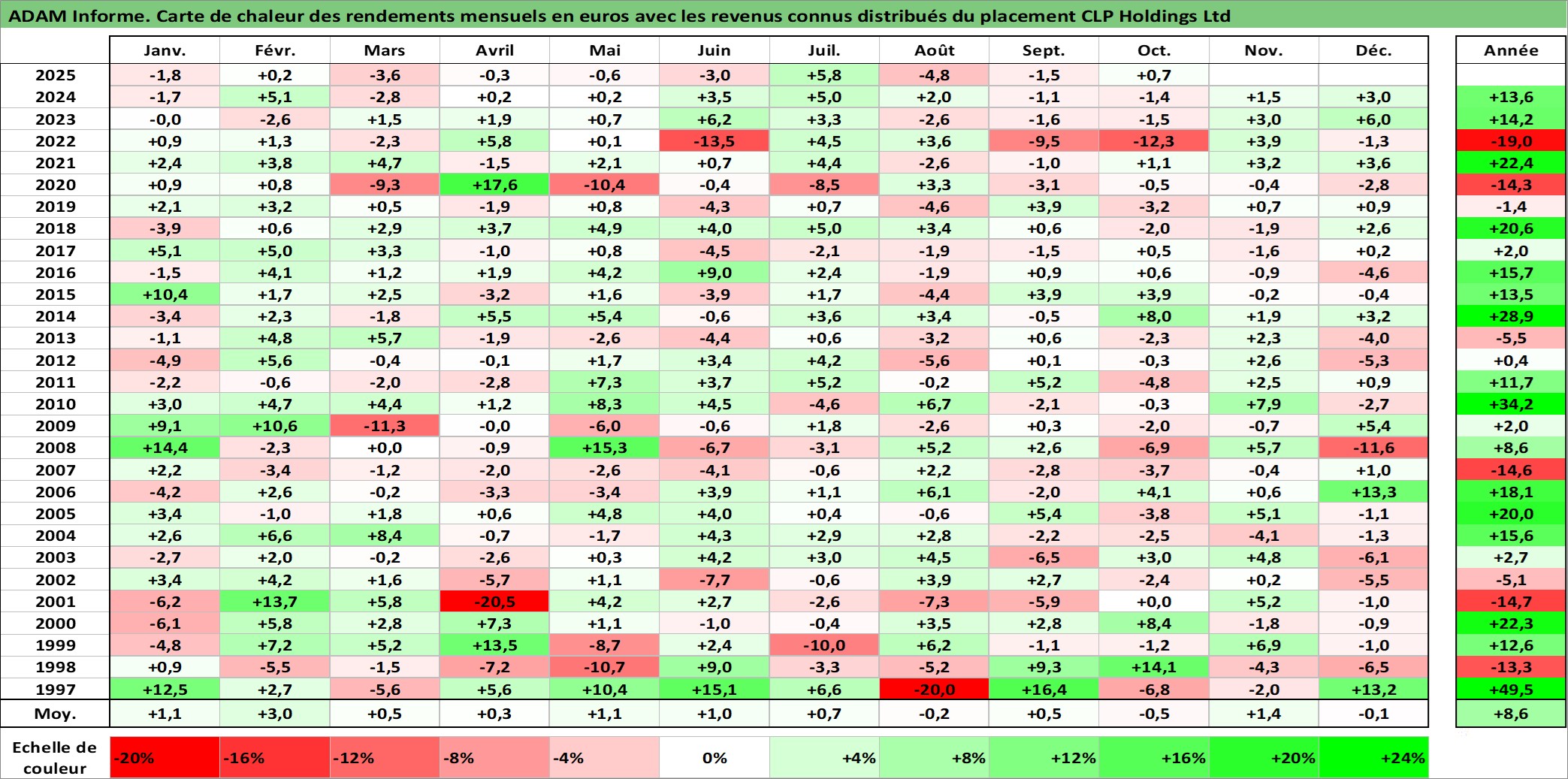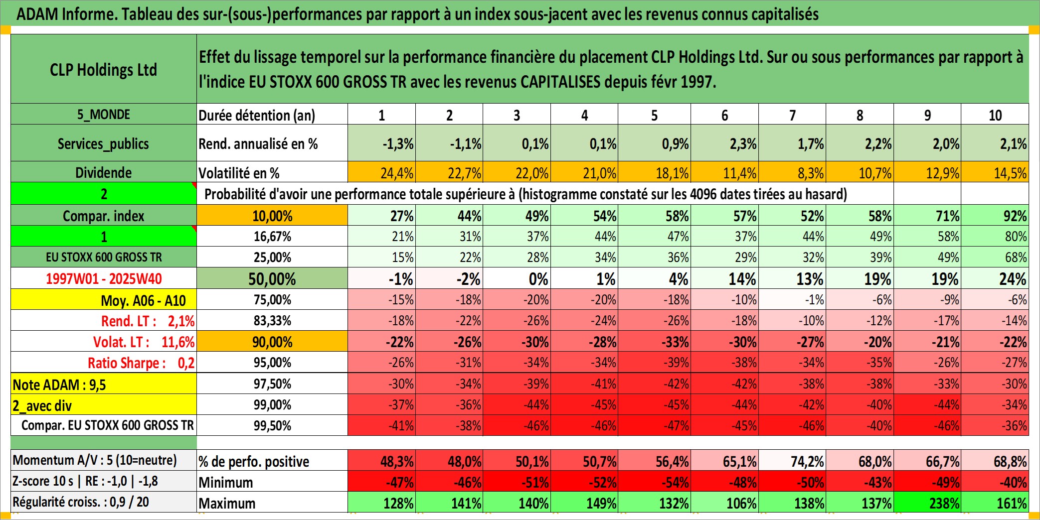 Site dédié aux investisseursPage dédiée sur site financeAnalyse des valorisations hebdomadaires de l'action CLP Holdings Ltd. Cet actif est cote en HKD. Les valorisations sont en contrevaleur EURO et couvrent les semaines 1997W01 a 2025W40. Les revenus de cet actif financier sont pris en compte depuis la semaine 1997W07. La note globale ESG de cet actif est estimee a 6.0 (apres rebasage entre 0 et 20).