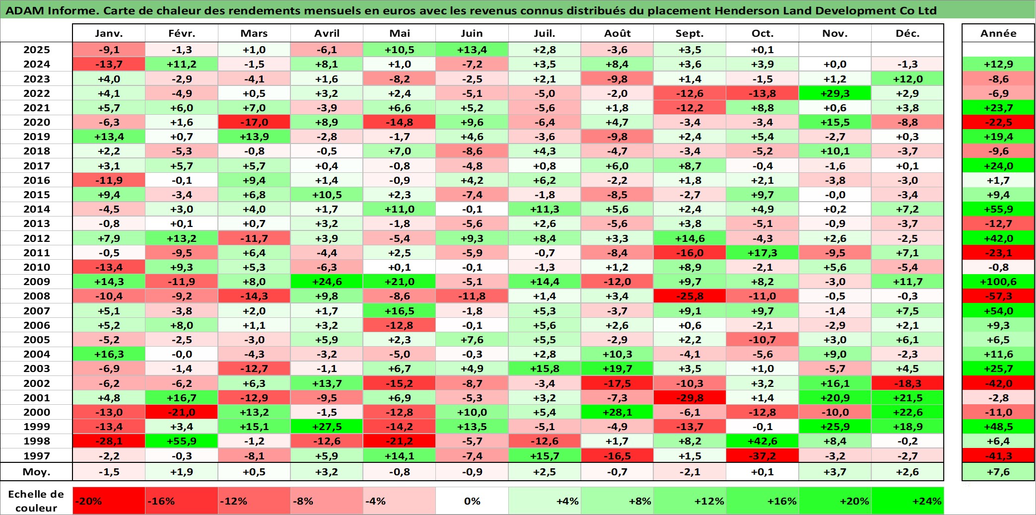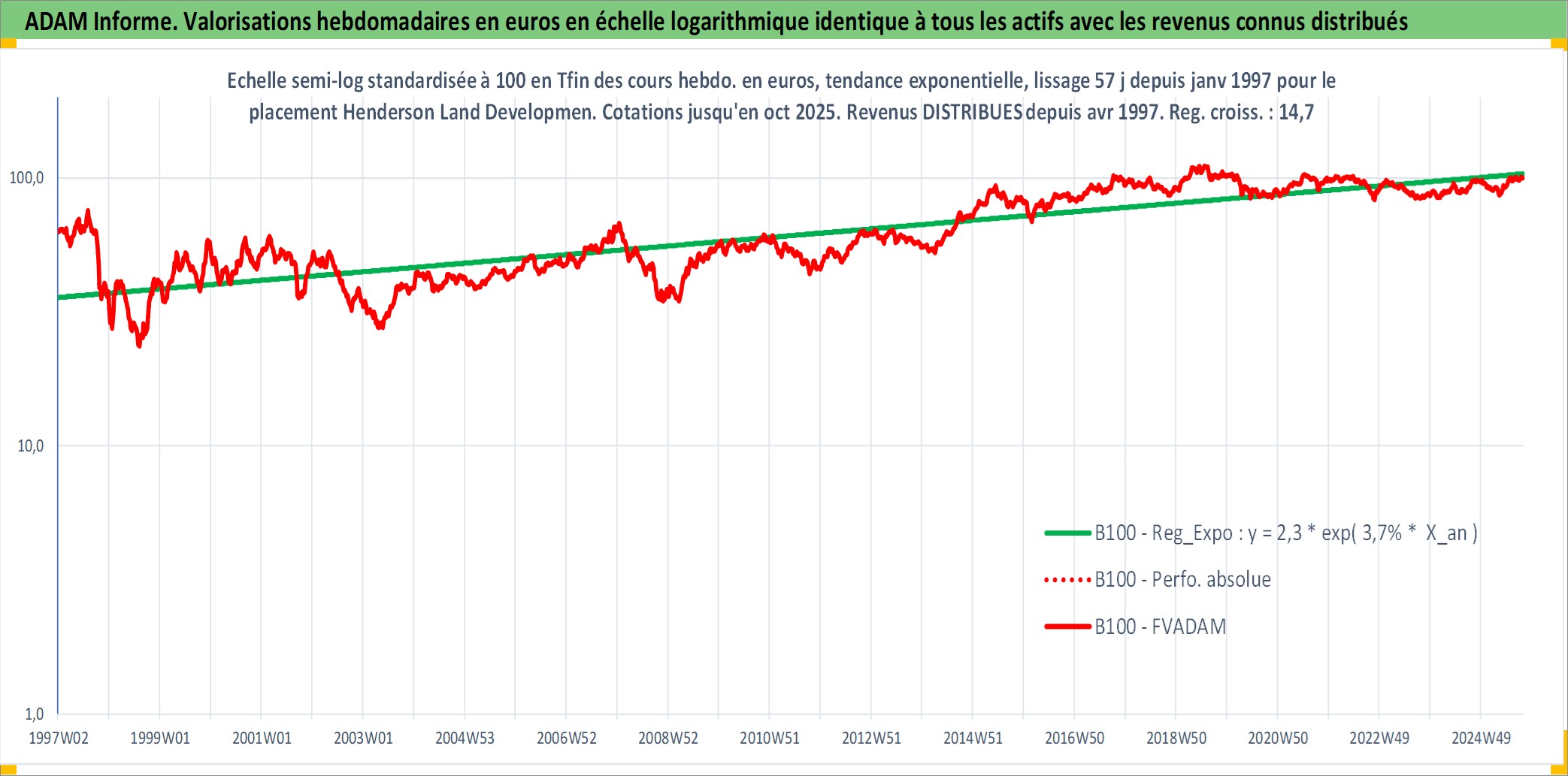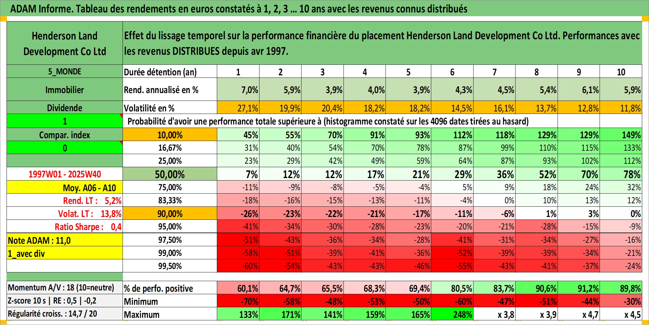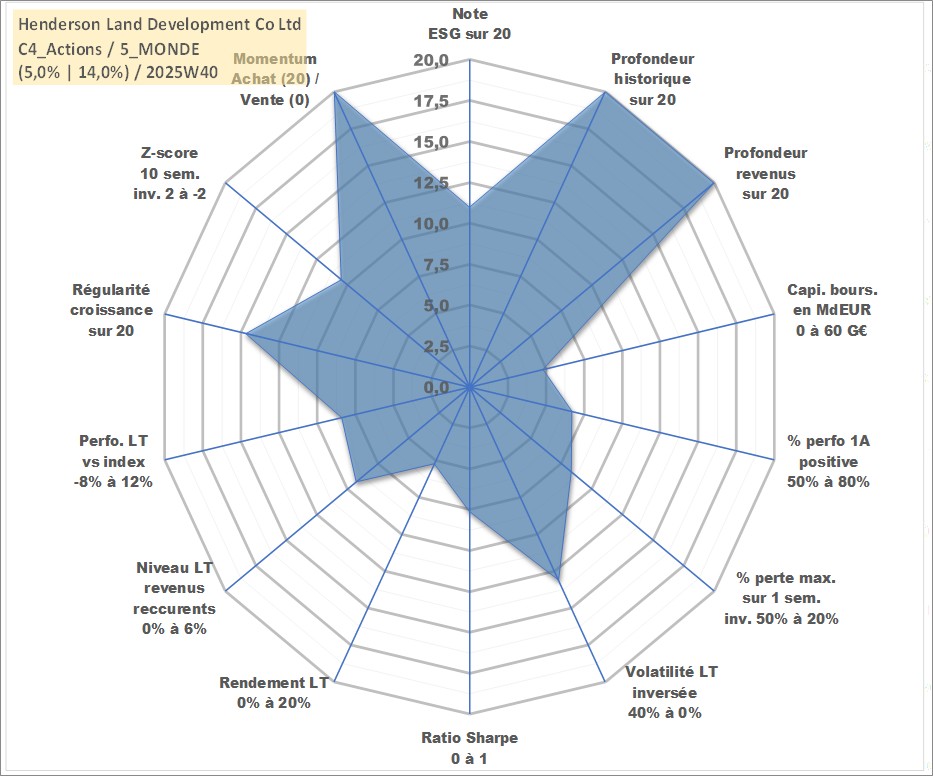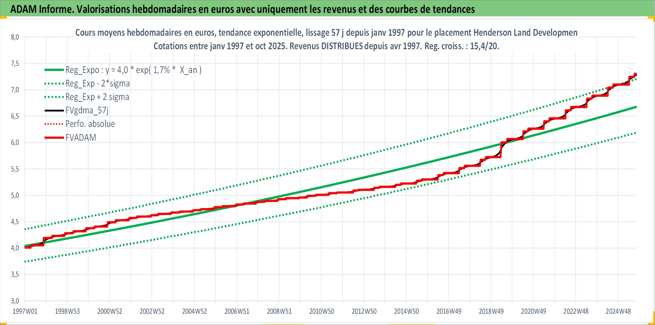 Site dédié aux investisseursPage dédiée sur site financeAnalyse des valorisations hebdomadaires de l'action Henderson Land Development Co Ltd. Cet actif est cote en HKD. Les valorisations sont en contrevaleur EURO et couvrent les semaines 1997W01 a 2025W40. Les revenus de cet actif financier sont pris en compte depuis la semaine 1997W16. La note globale ESG de cet actif est estimee a 11.0 (apres rebasage entre 0 et 20).