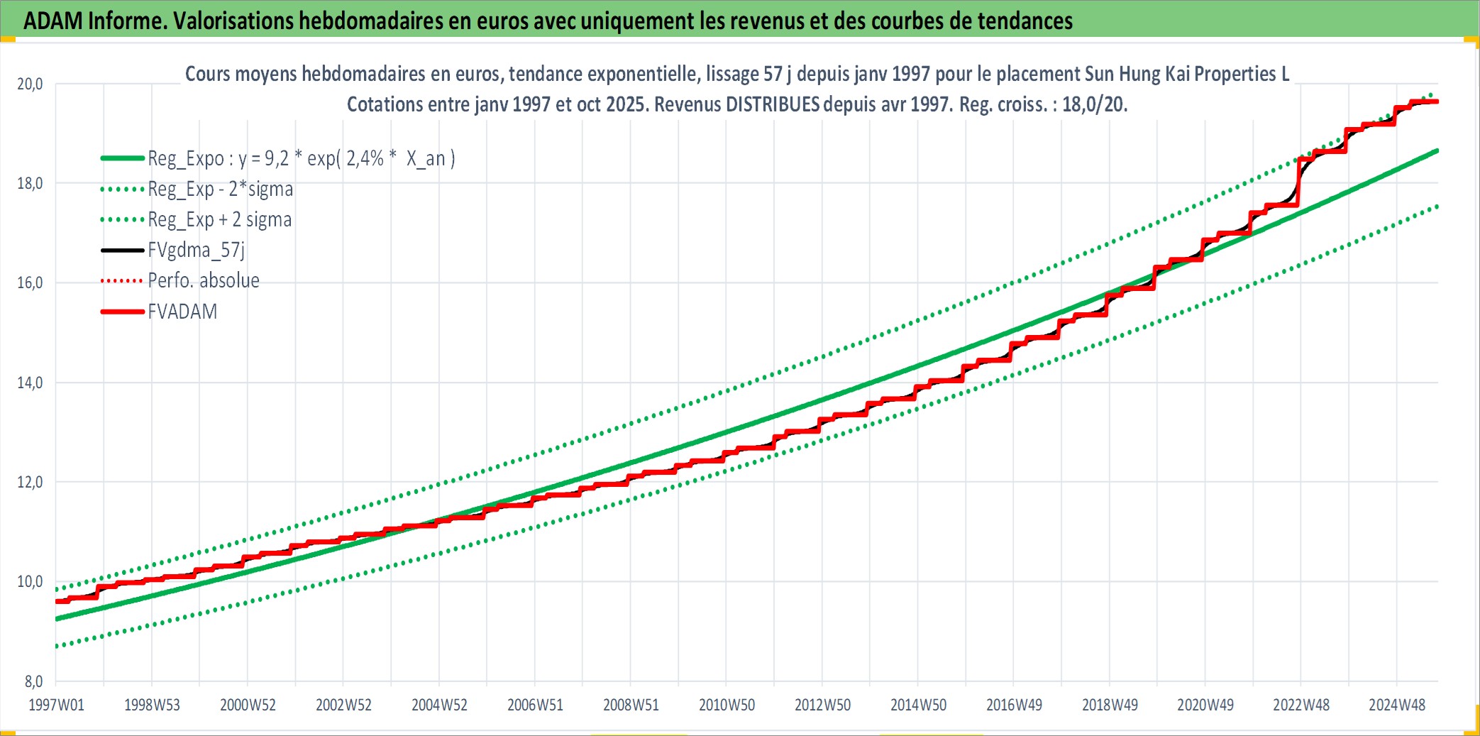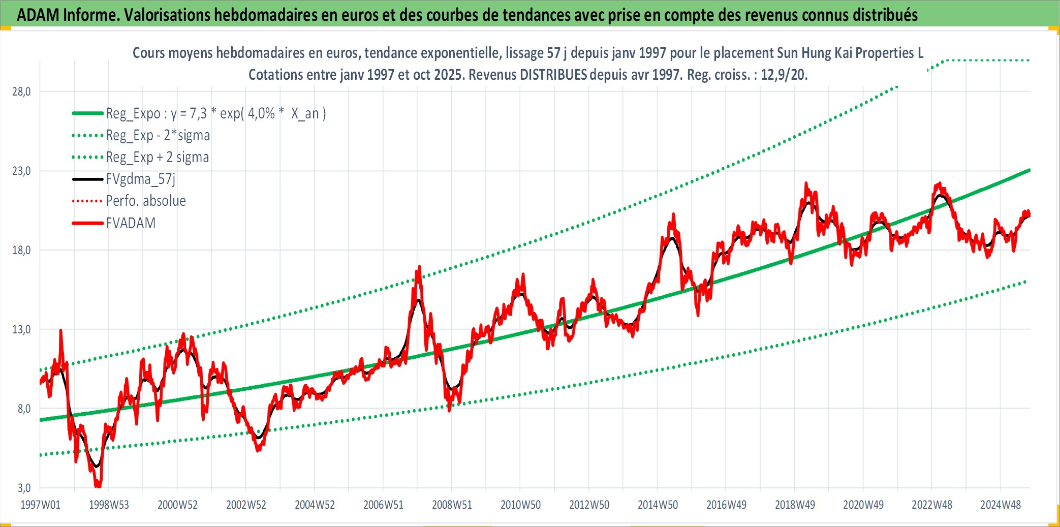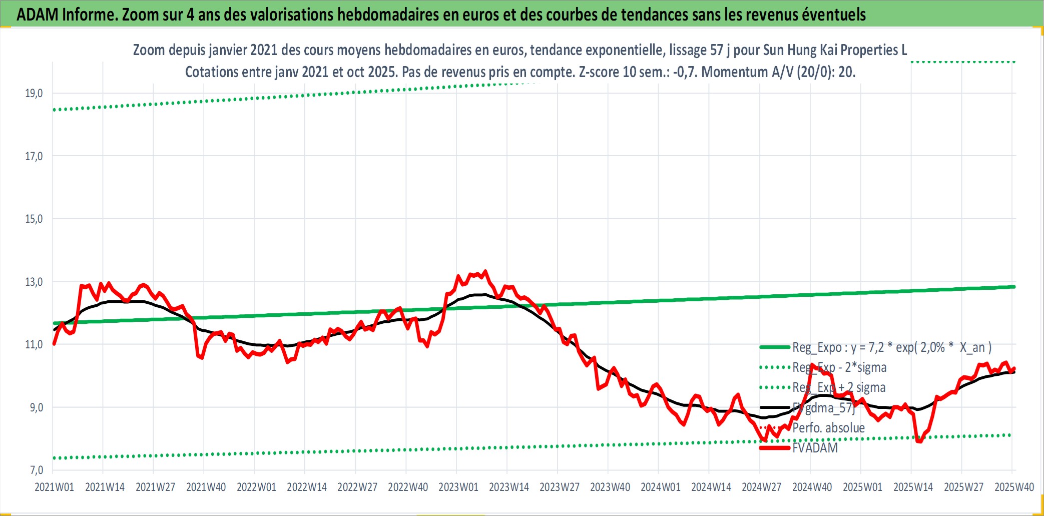 Site dédié aux investisseursPage dédiée sur site financeAnalyse des valorisations hebdomadaires de l'action Sun Hung Kai Properties Ltd. Cet actif est cote en HKD. Les valorisations sont en contrevaleur EURO et couvrent les semaines 1997W01 a 2025W40. Les revenus de cet actif financier sont pris en compte depuis la semaine 1997W15. La note globale ESG de cet actif est estimee a 11.0 (apres rebasage entre 0 et 20).