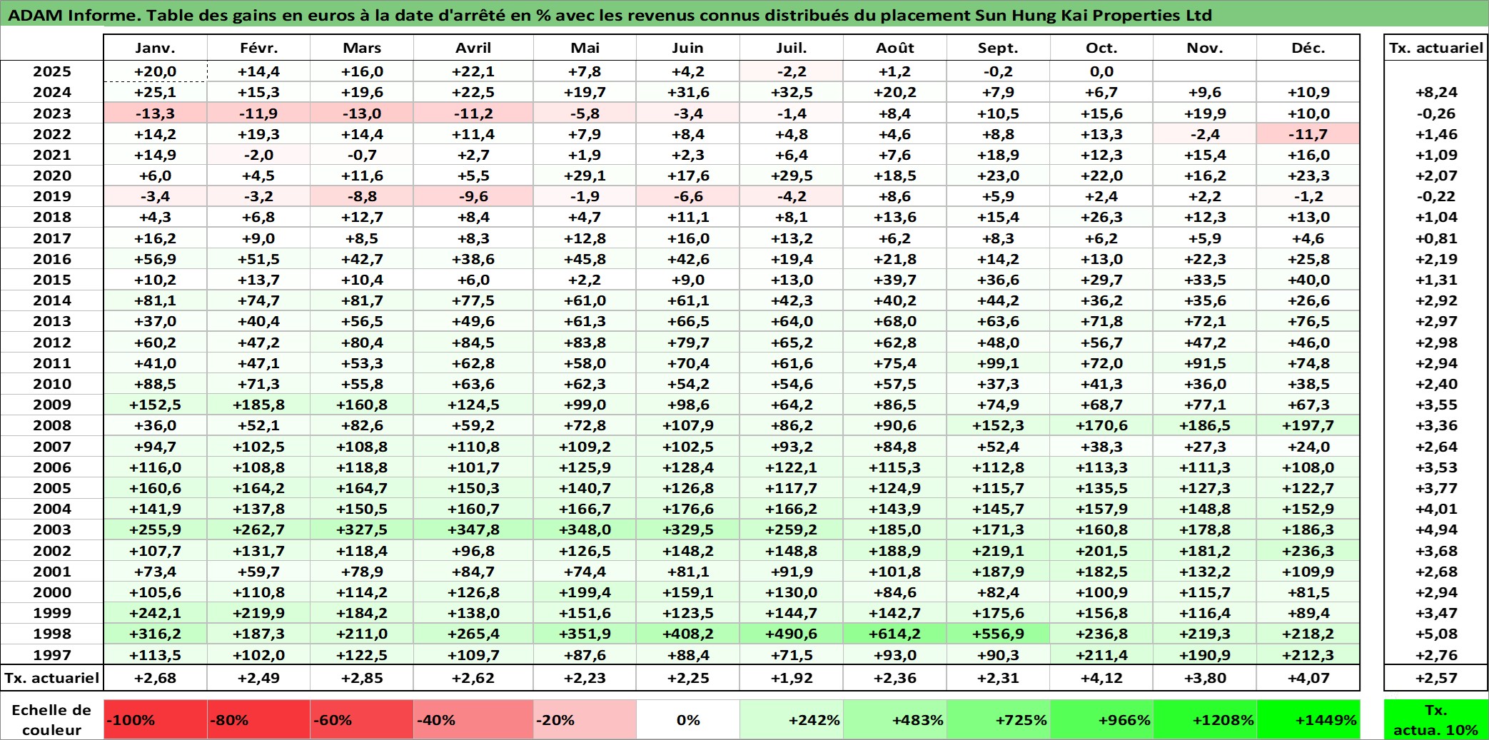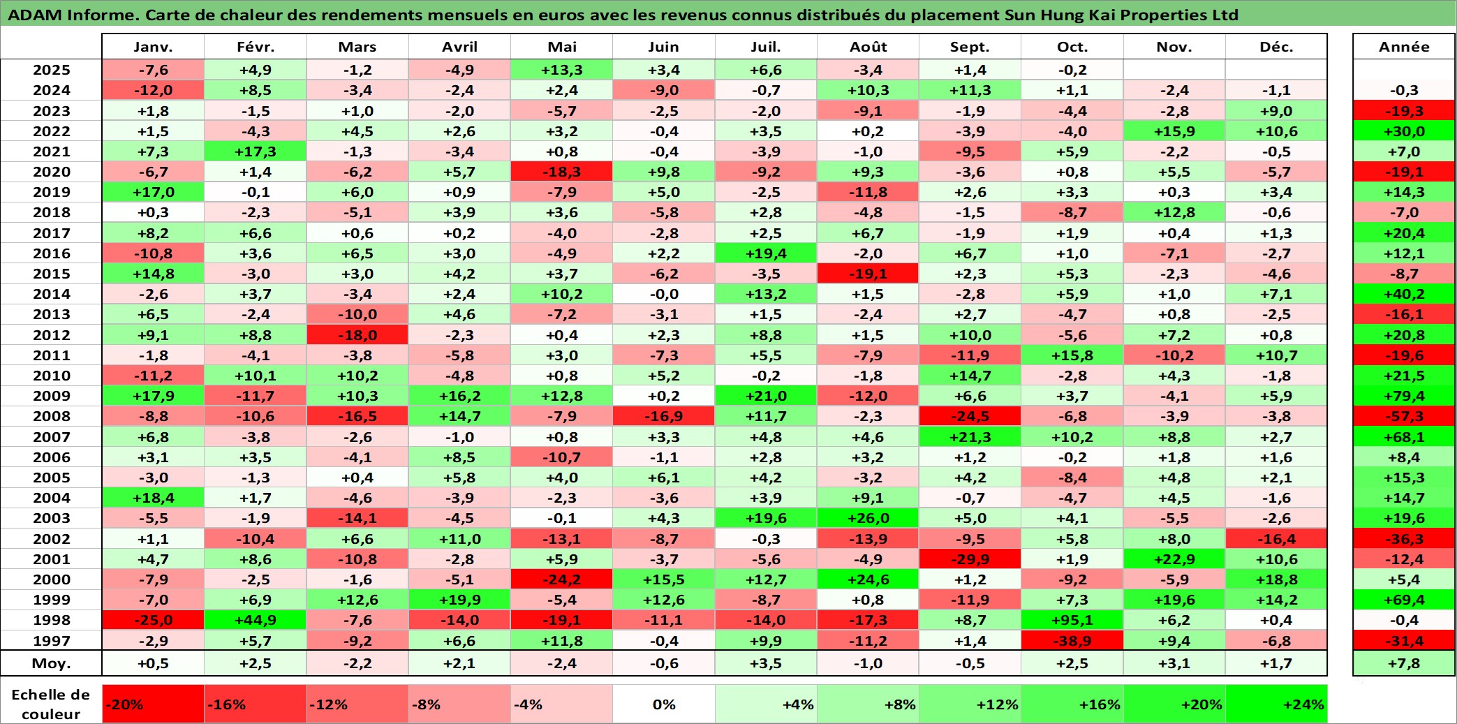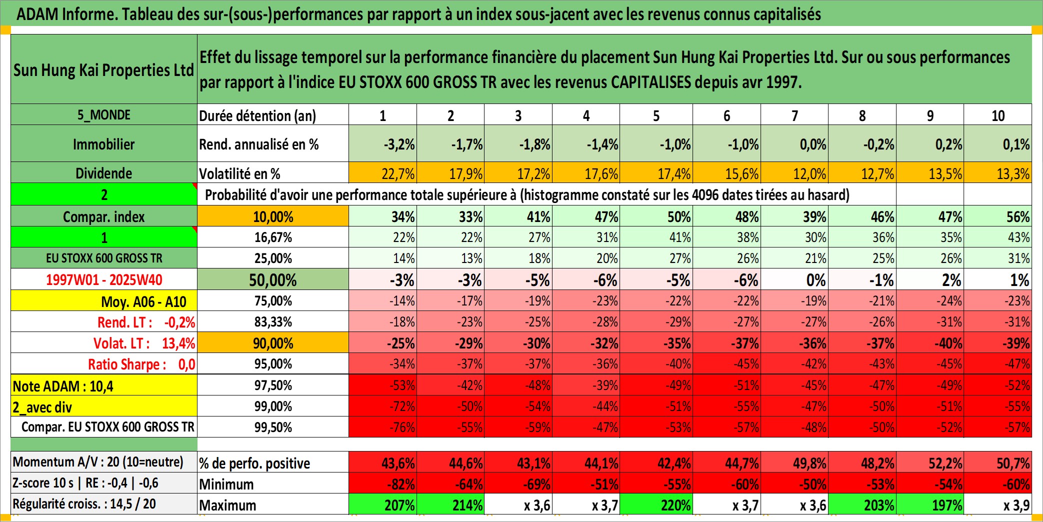 Site dédié aux investisseursPage dédiée sur site financeAnalyse des valorisations hebdomadaires de l'action Sun Hung Kai Properties Ltd. Cet actif est cote en HKD. Les valorisations sont en contrevaleur EURO et couvrent les semaines 1997W01 a 2025W40. Les revenus de cet actif financier sont pris en compte depuis la semaine 1997W15. La note globale ESG de cet actif est estimee a 11.0 (apres rebasage entre 0 et 20).