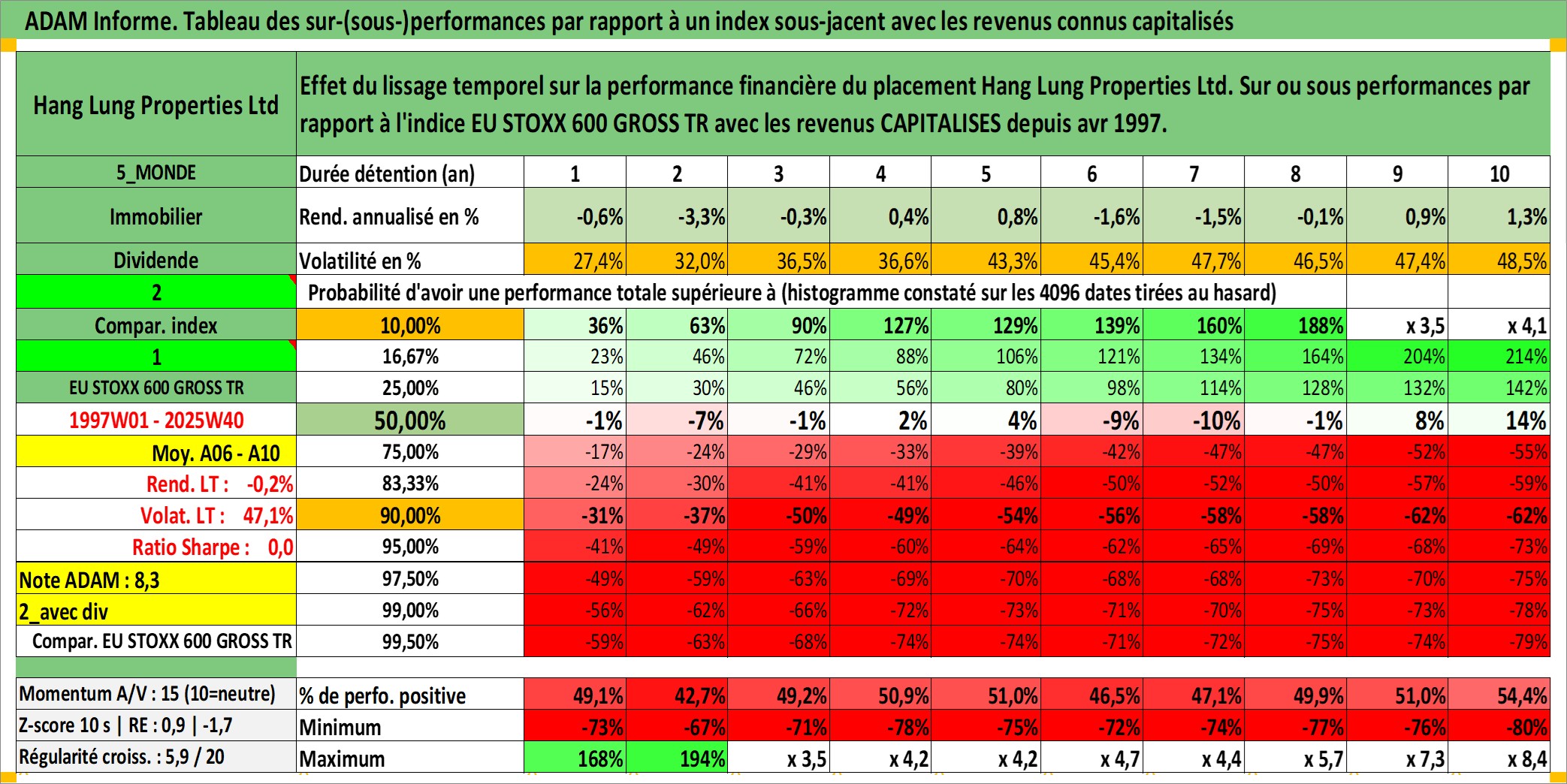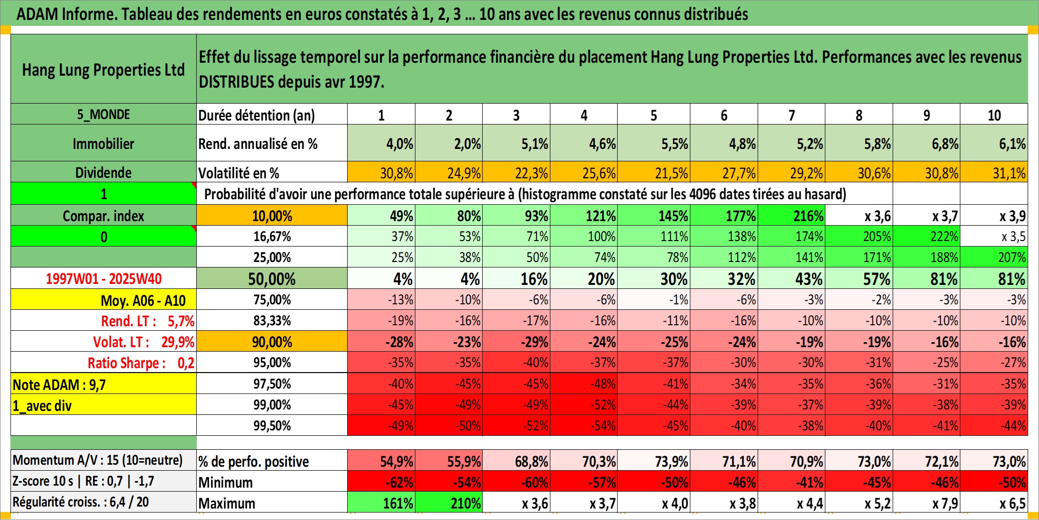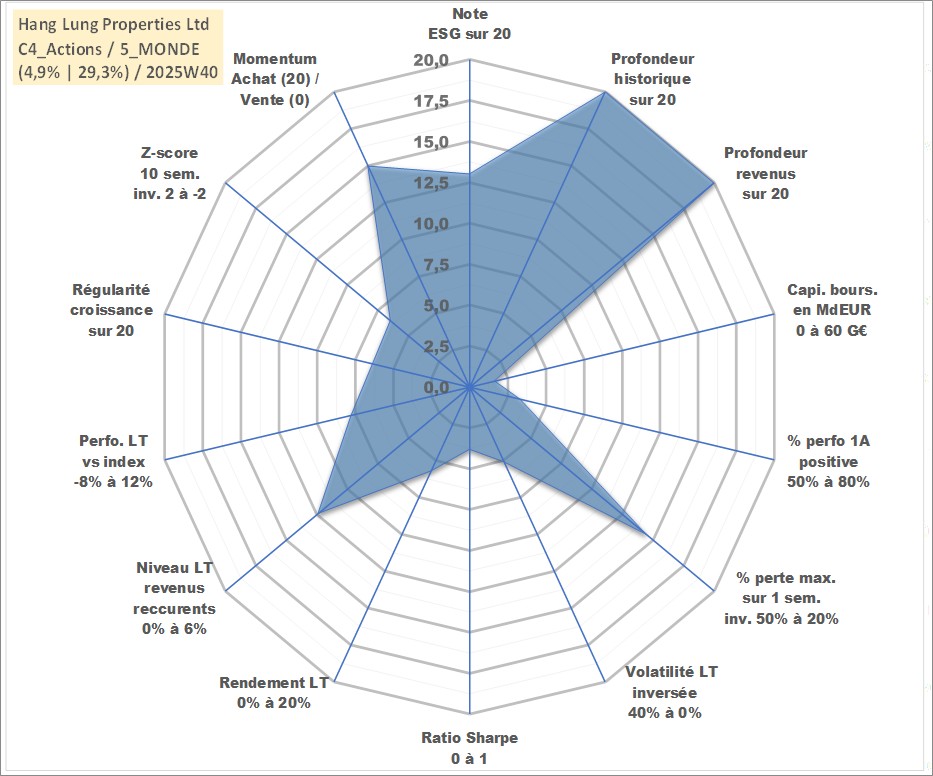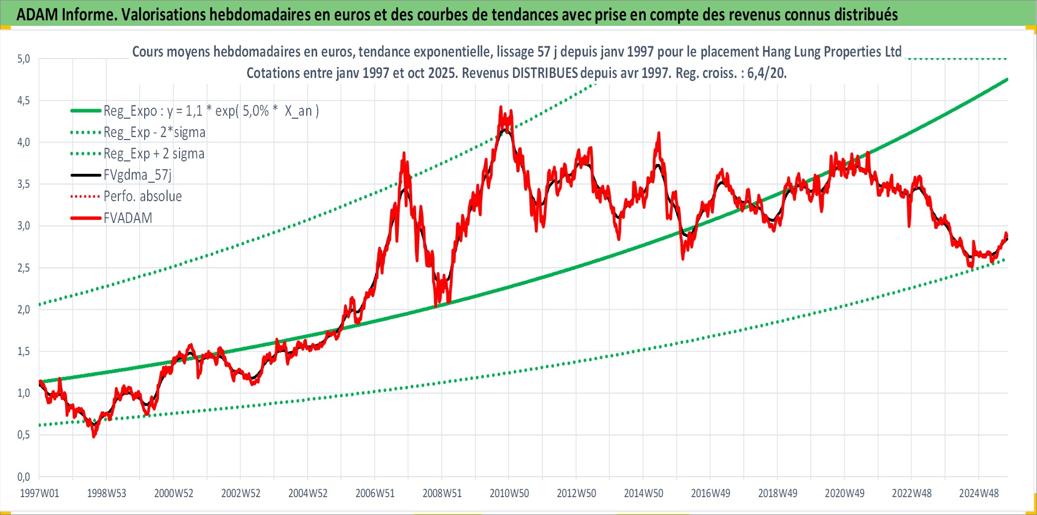 Site dédié aux investisseursPage dédiée sur site financeAnalyse des valorisations hebdomadaires de l'action Hang Lung Properties Ltd. Cet actif est cote en HKD. Les valorisations sont en contrevaleur EURO et couvrent les semaines 1997W01 a 2025W40. Les revenus de cet actif financier sont pris en compte depuis la semaine 1997W15. La note globale ESG de cet actif est estimee a 13.0 (apres rebasage entre 0 et 20).