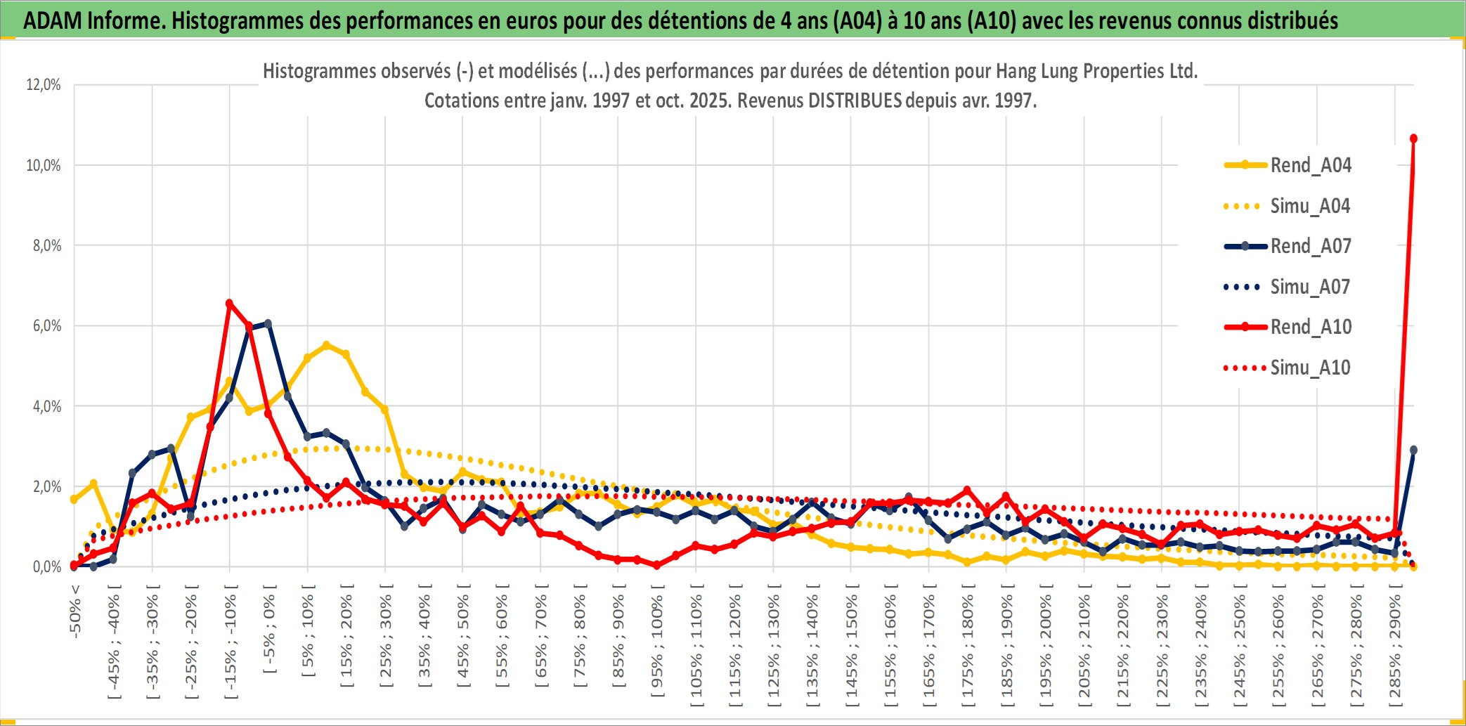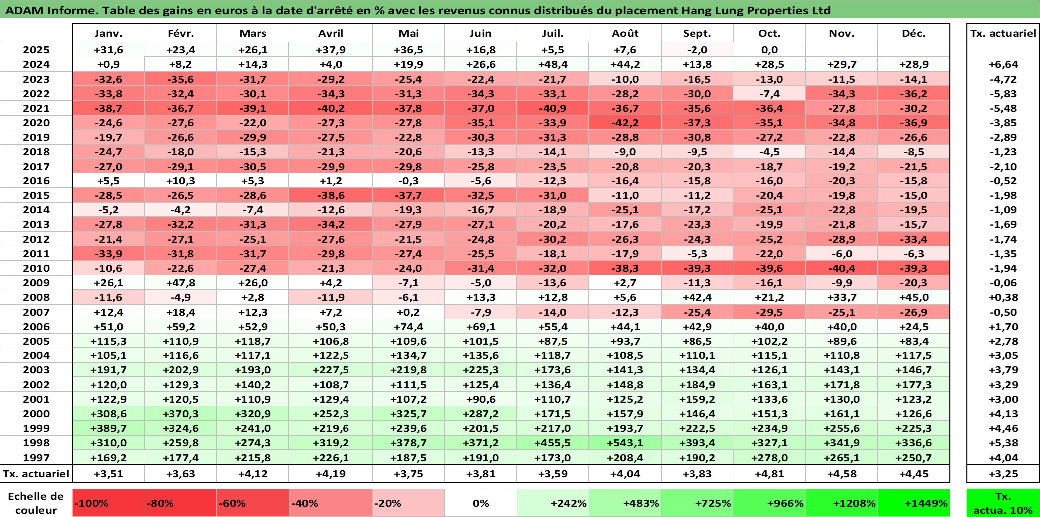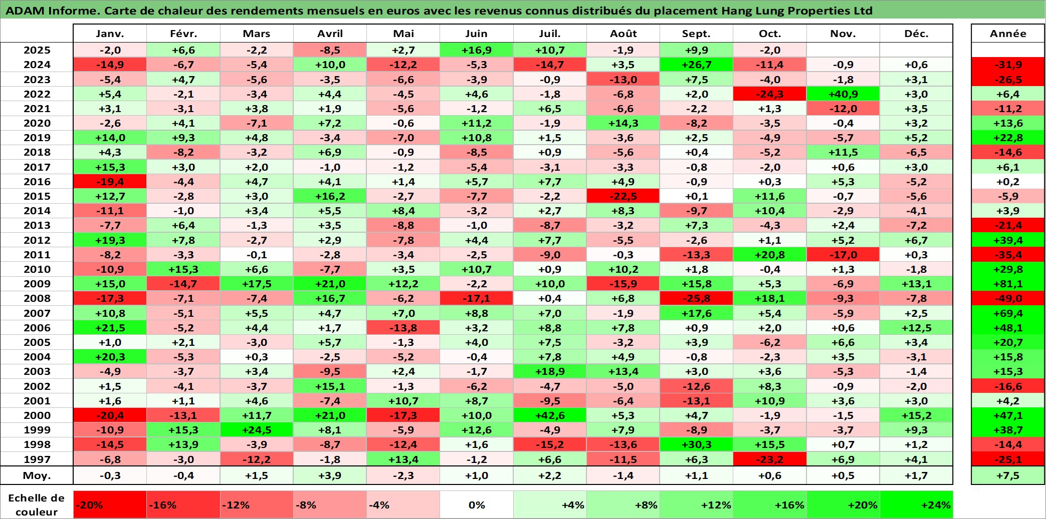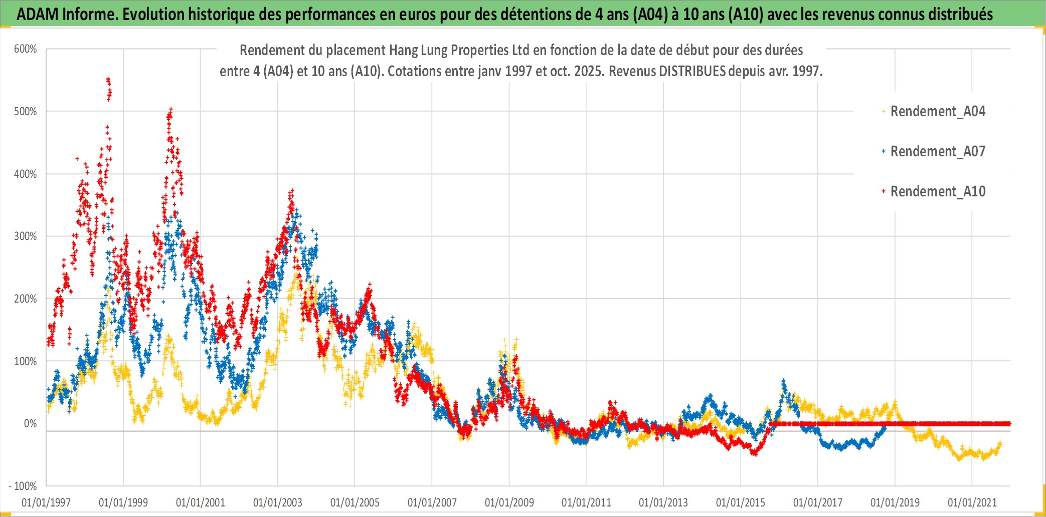 Site dédié aux investisseursPage dédiée sur site financeAnalyse des valorisations hebdomadaires de l'action Hang Lung Properties Ltd. Cet actif est cote en HKD. Les valorisations sont en contrevaleur EURO et couvrent les semaines 1997W01 a 2025W40. Les revenus de cet actif financier sont pris en compte depuis la semaine 1997W15. La note globale ESG de cet actif est estimee a 13.0 (apres rebasage entre 0 et 20).