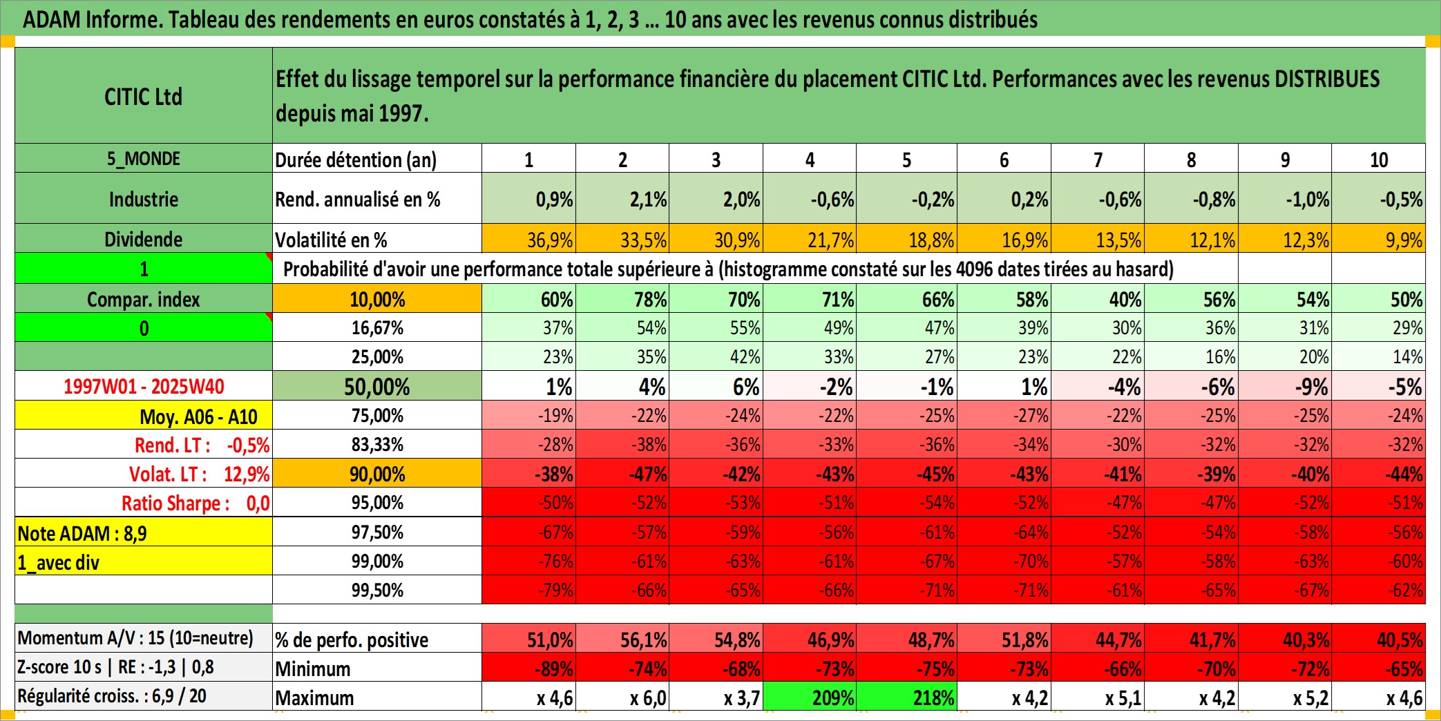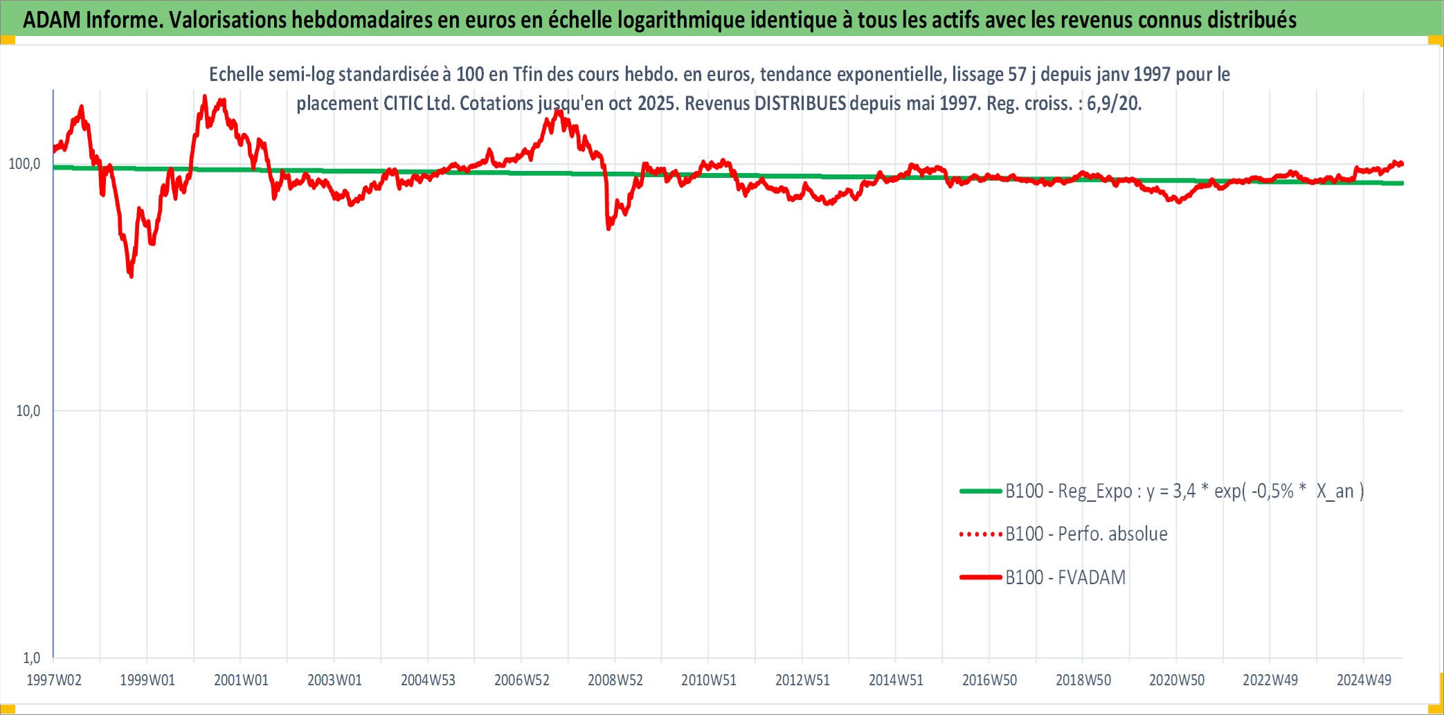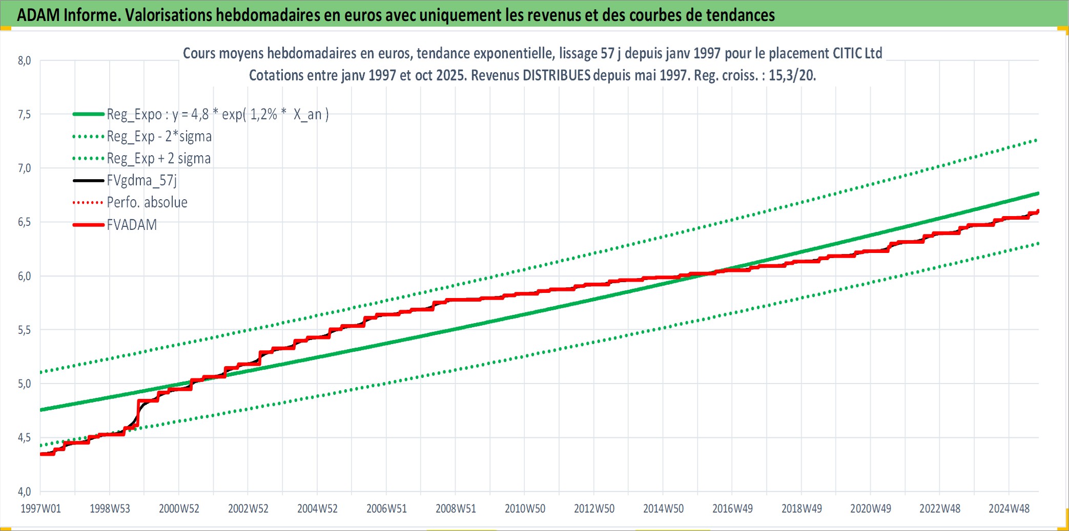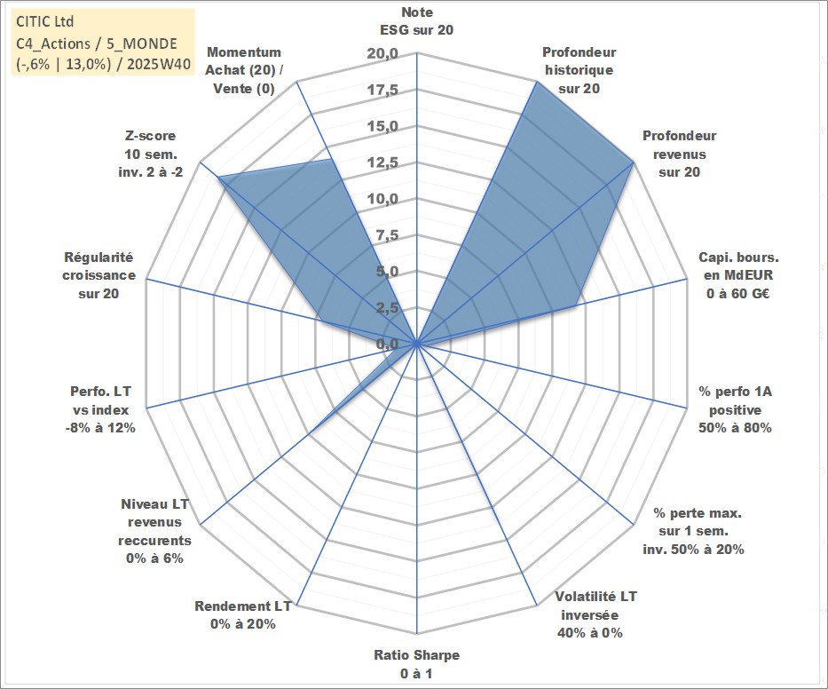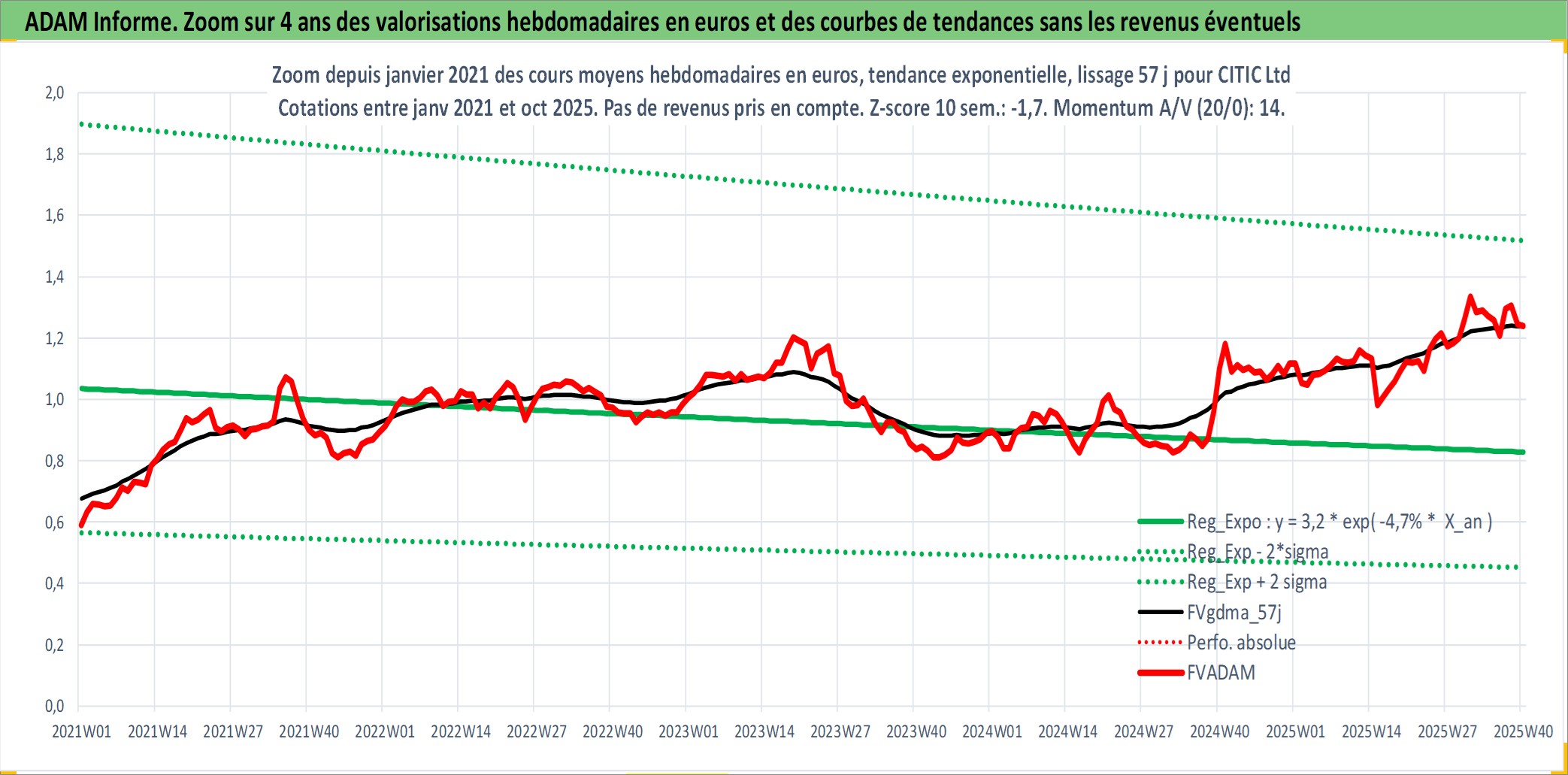 Site dédié aux investisseursPage dédiée sur site financeAnalyse des valorisations hebdomadaires de l'action CITIC Ltd. Cet actif est cote en HKD. Les valorisations sont en contrevaleur EURO et couvrent les semaines 1997W01 a 2025W40. Les revenus de cet actif financier sont pris en compte depuis la semaine 1997W22. La note ESG de cet actif n'est pas connue.