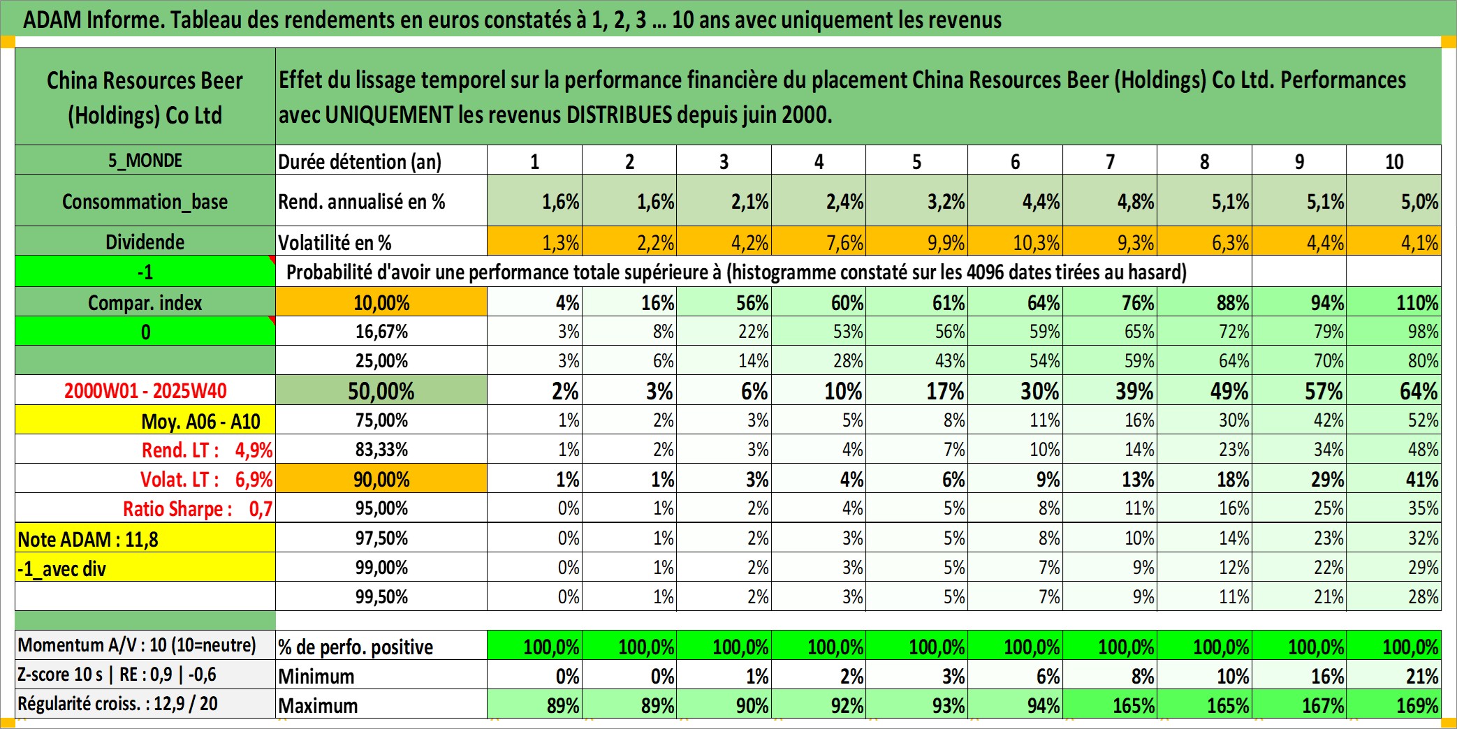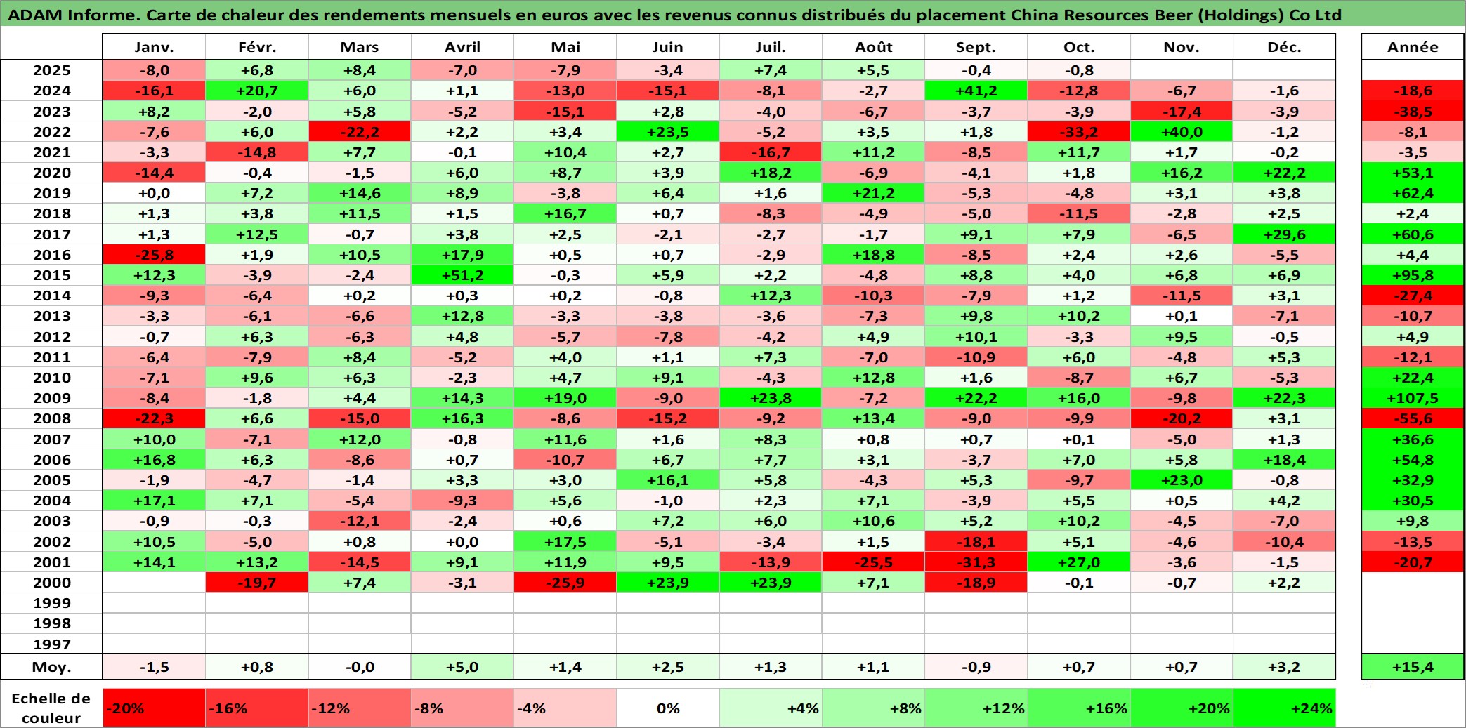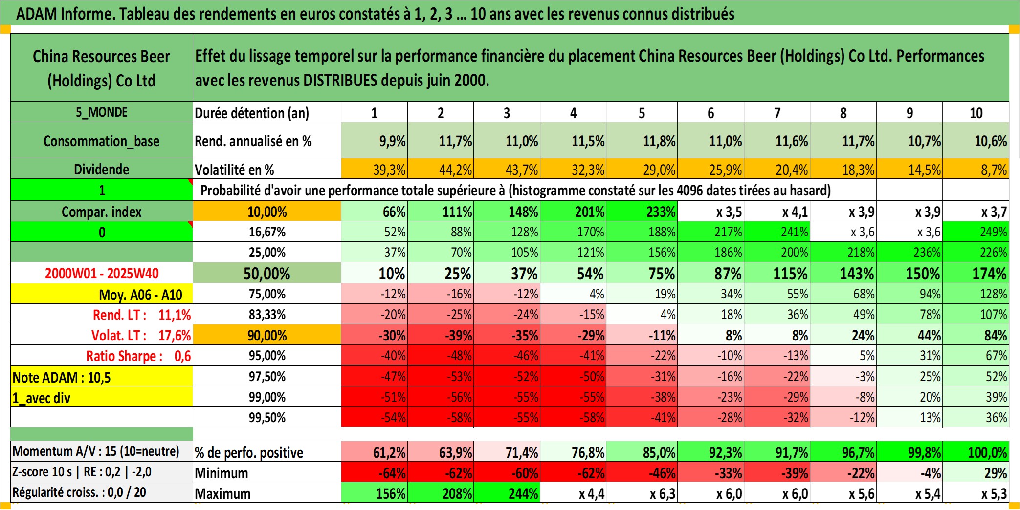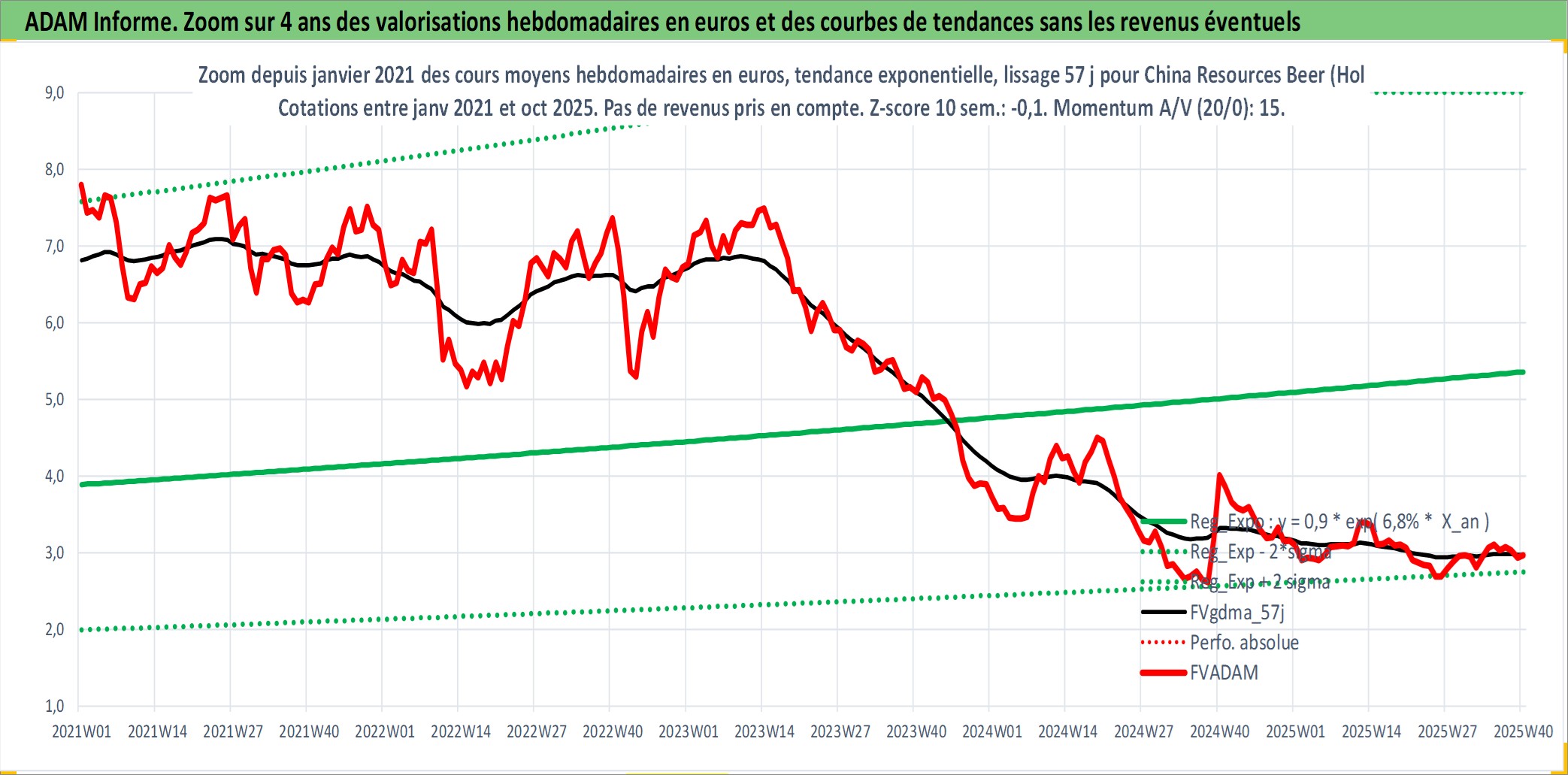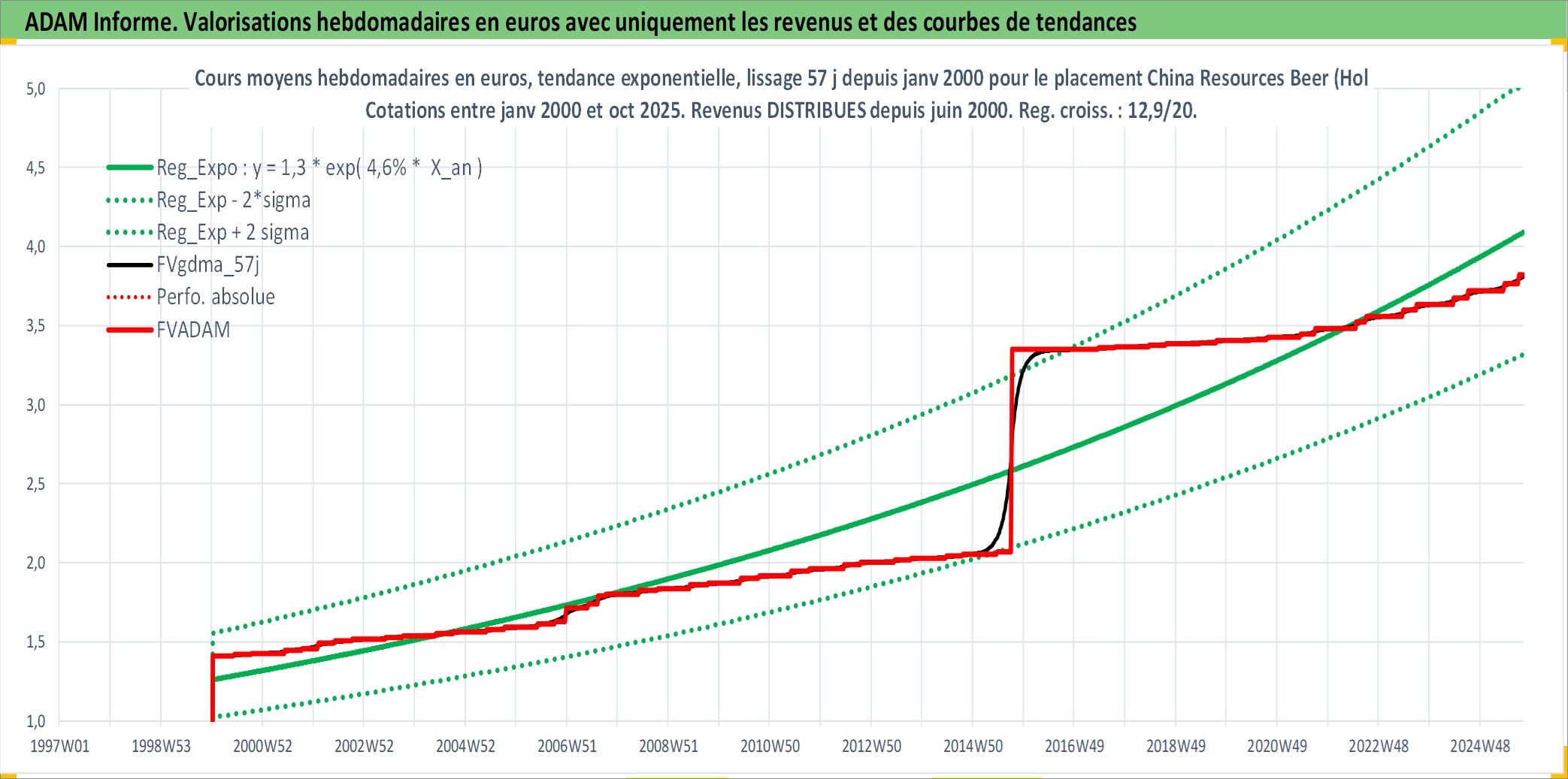 Site dédié aux investisseursPage dédiée sur site financeAnalyse des valorisations hebdomadaires de l'action China Resources Beer (Holdings) Co Ltd. Cet actif est cote en HKD. Les valorisations sont en contrevaleur EURO et couvrent les semaines 2000W01 a 2025W40. Les revenus de cet actif financier sont pris en compte depuis la semaine 2000W23. La note globale ESG de cet actif est estimee a 5.0 (apres rebasage entre 0 et 20).
