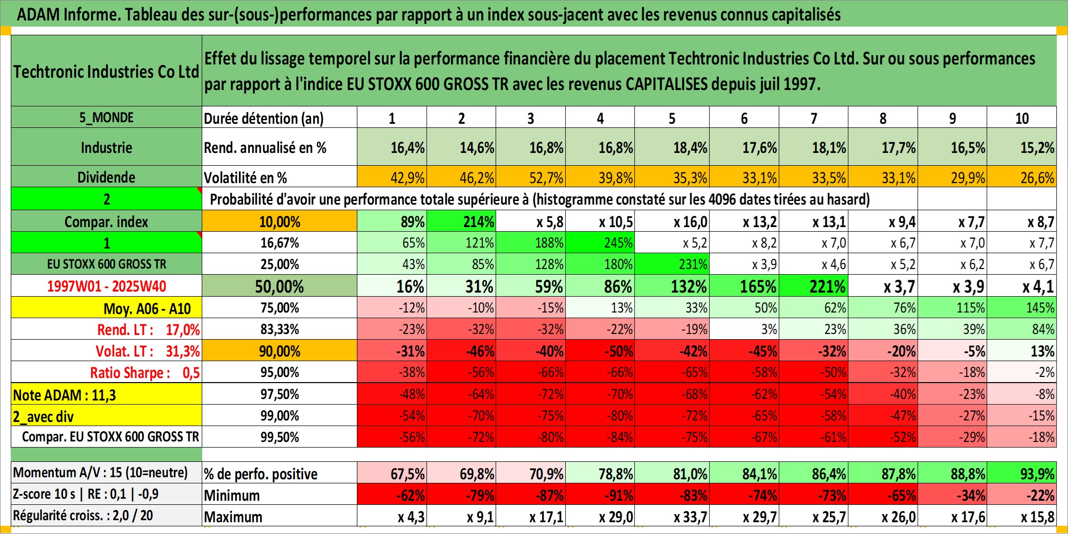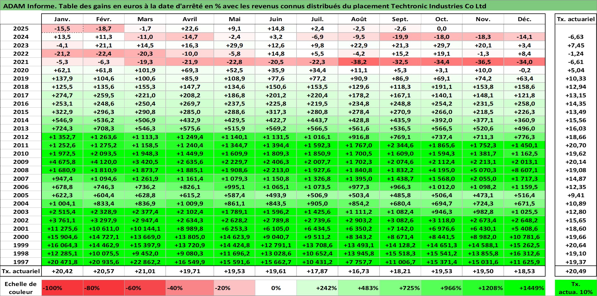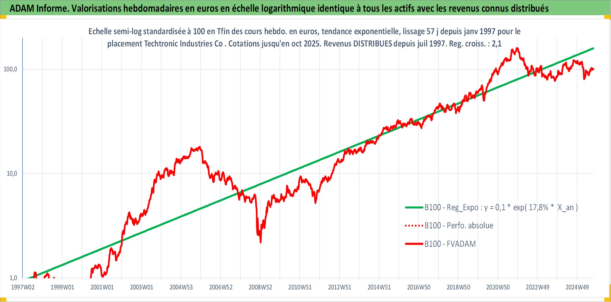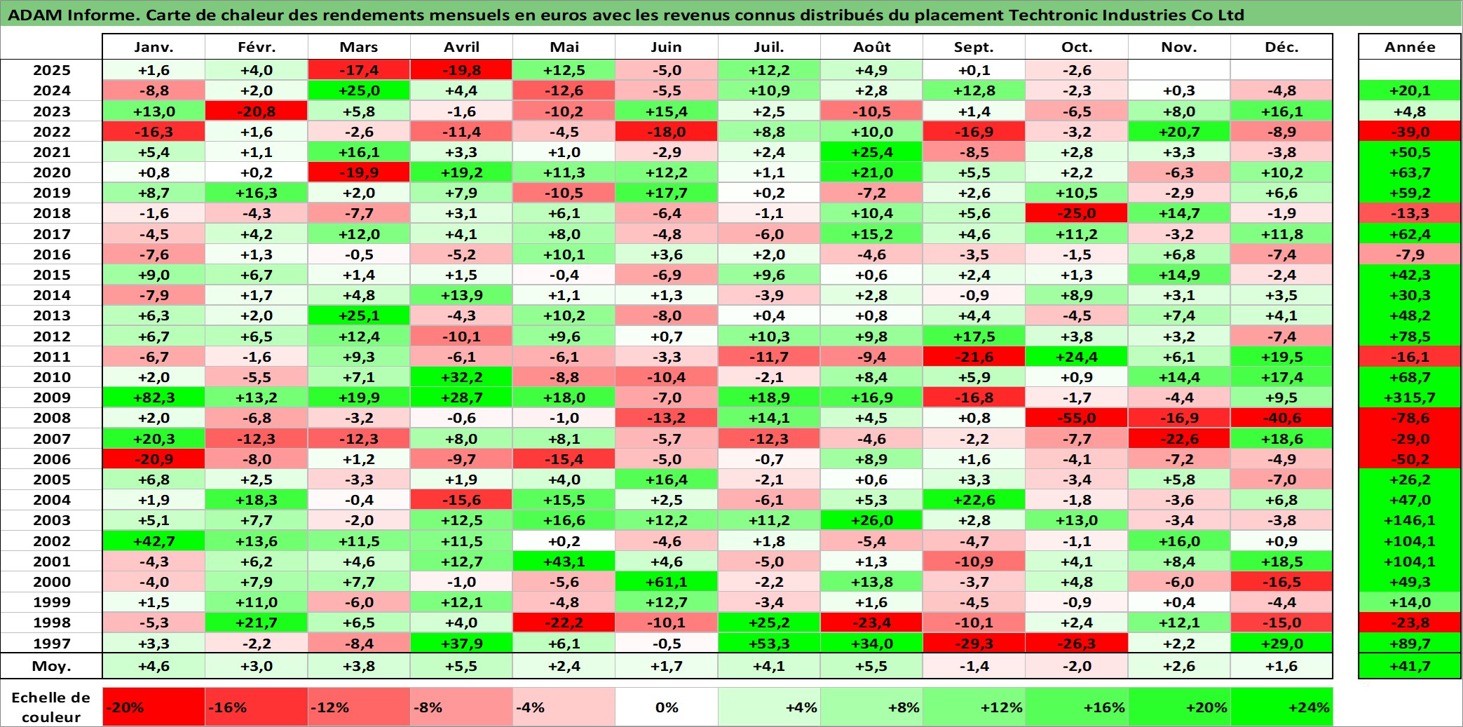Site dédié aux investisseursPage dédiée sur site financeAnalyse des valorisations hebdomadaires de l'action Techtronic Industries Co Ltd. Cet actif est cote en HKD. Les valorisations sont en contrevaleur EURO et couvrent les semaines 1997W01 a 2025W40. Les revenus de cet actif financier sont pris en compte depuis la semaine 1997W28. La note globale ESG de cet actif est estimee a 9.0 (apres rebasage entre 0 et 20).