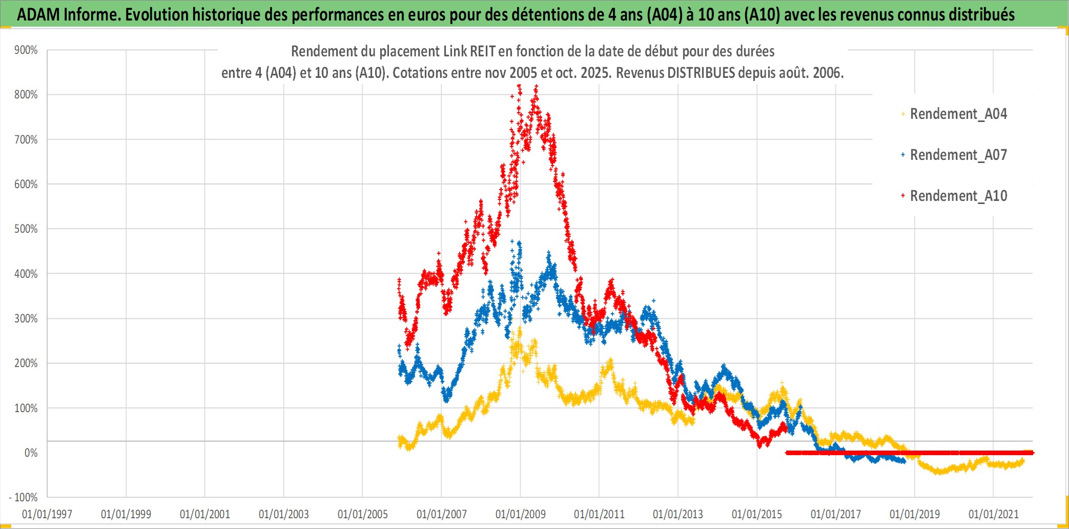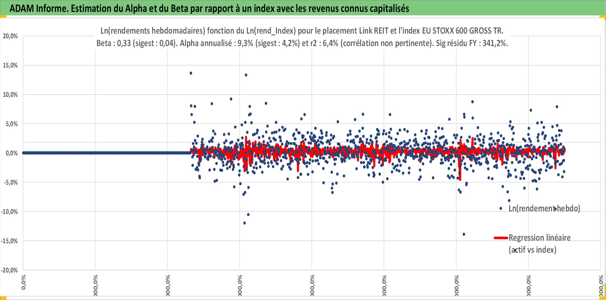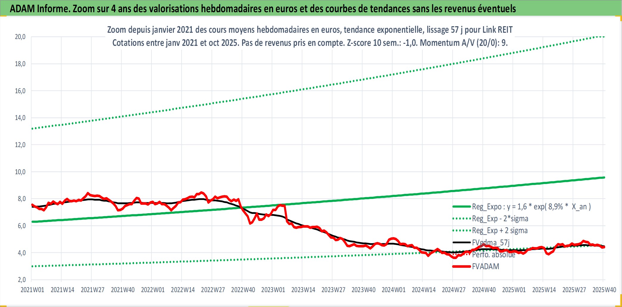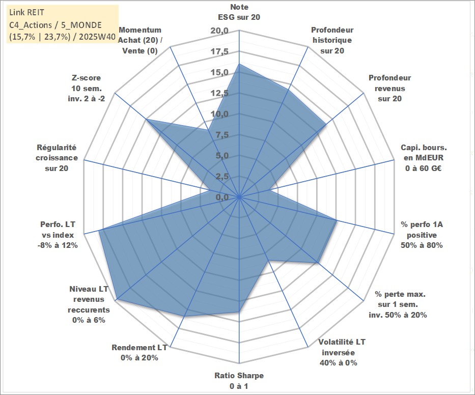 Site dédié aux investisseursPage dédiée sur site financeAnalyse des valorisations hebdomadaires de l'action Link REIT. Cet actif est cote en HKD. Les valorisations sont en contrevaleur EURO et couvrent les semaines 2005W47 a 2025W40. Les revenus de cet actif financier sont pris en compte depuis la semaine 2006W33. La note globale ESG de cet actif est estimee a 16.0 (apres rebasage entre 0 et 20).