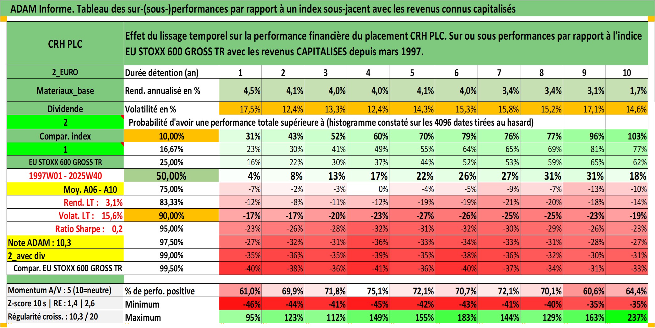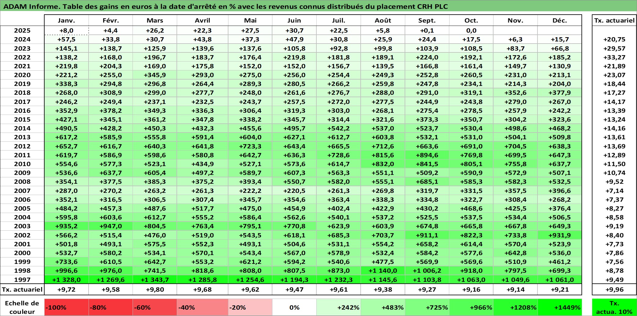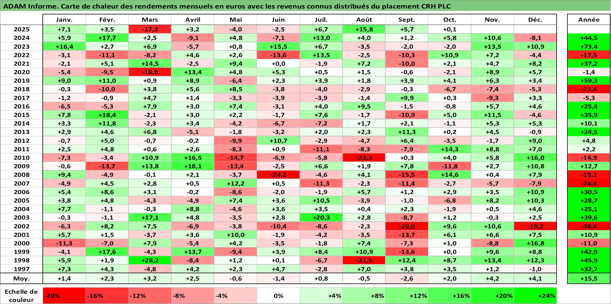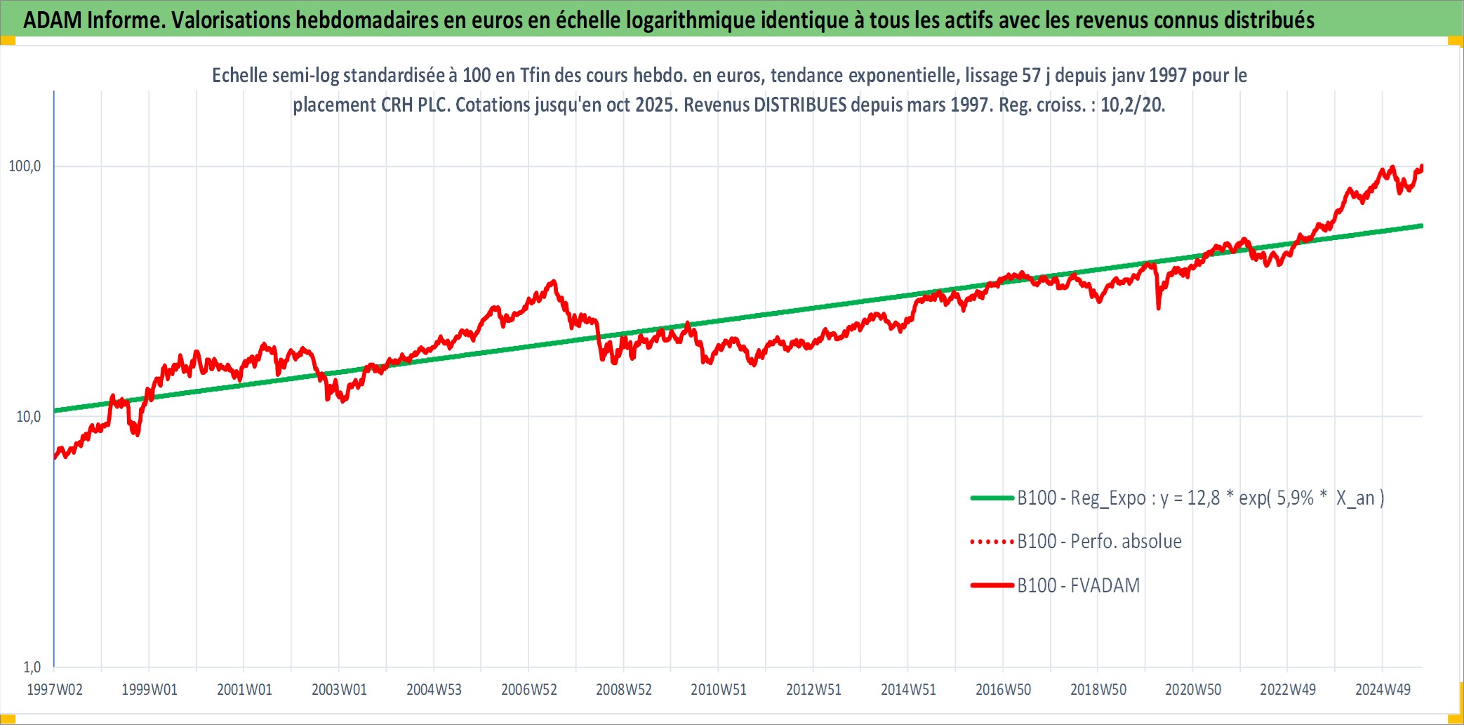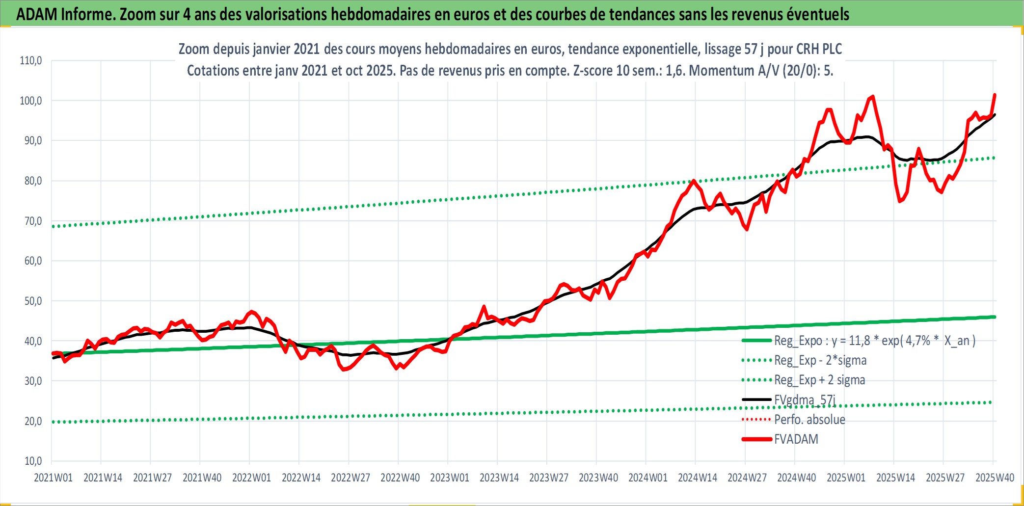 Site dédié aux investisseursPage dédiée sur site financeAnalyse des valorisations hebdomadaires de l'action CRH PLC. Cet actif est cote en USD. Les valorisations sont en contrevaleur EURO et couvrent les semaines 1997W01 a 2025W40. Les revenus de cet actif financier sont pris en compte depuis la semaine 1997W11. La note ESG de cet actif n'est pas connue.