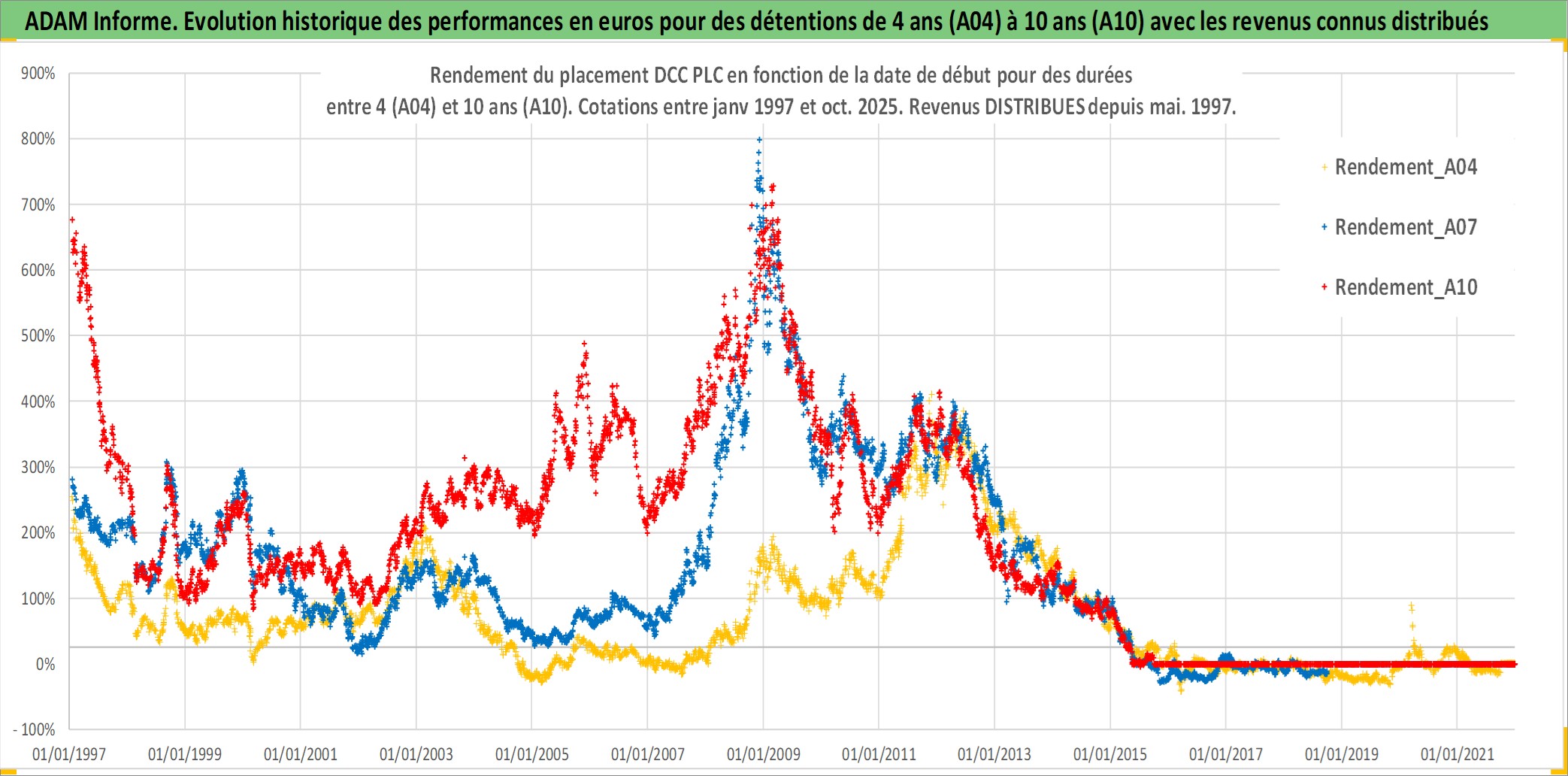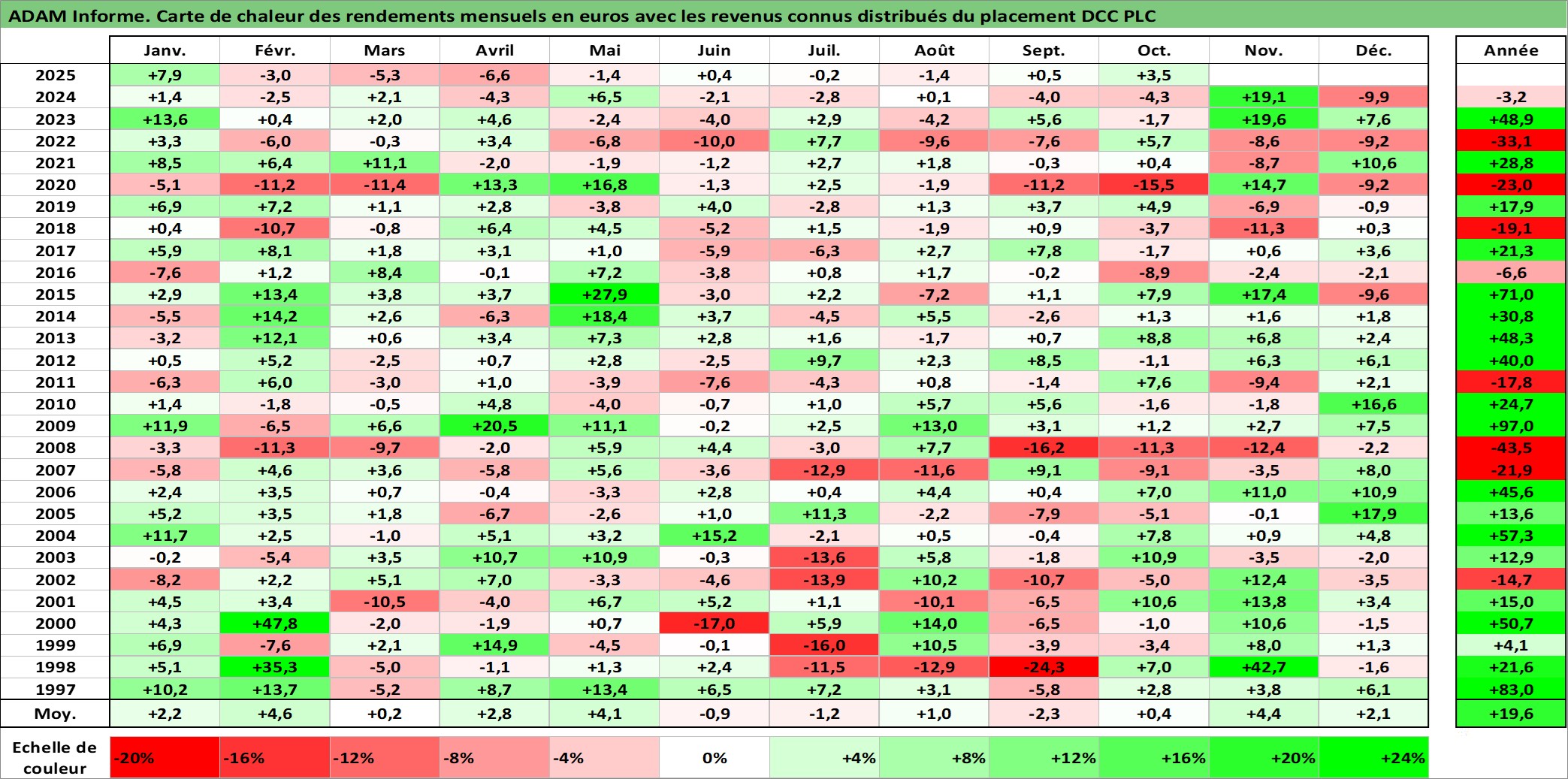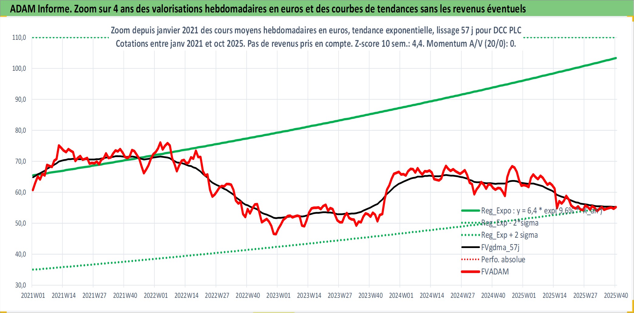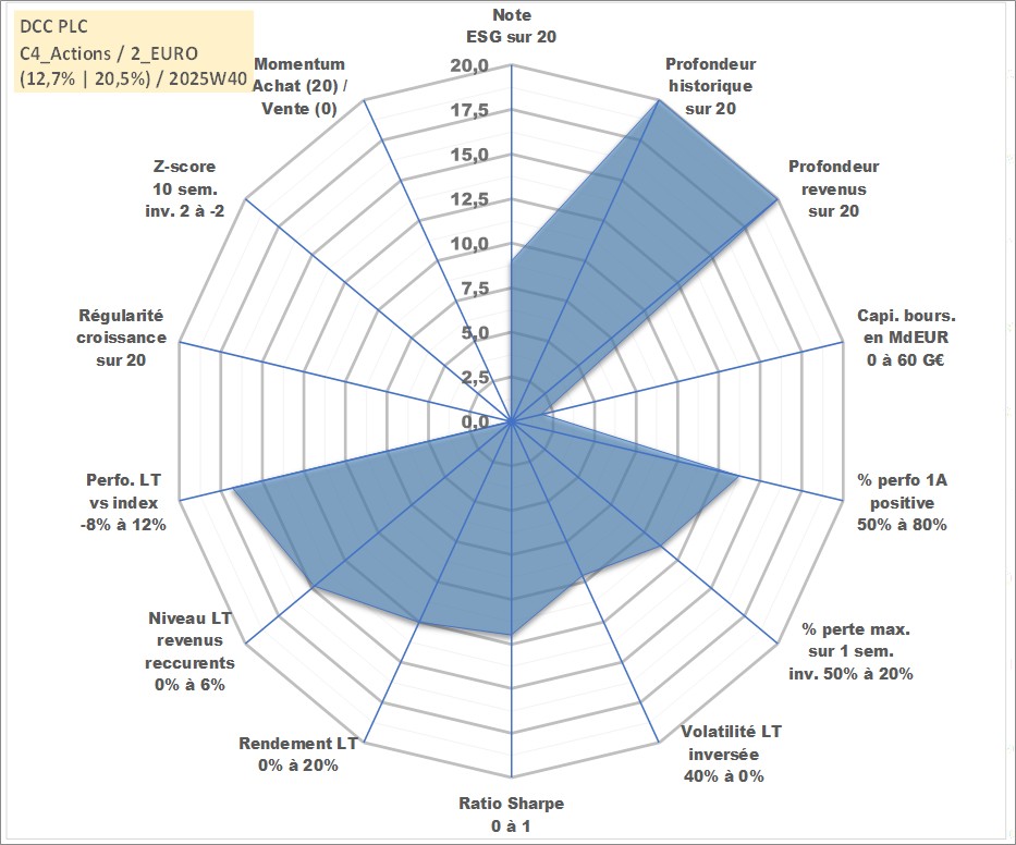 Site dédié aux investisseursPage dédiée sur site financeAnalyse des valorisations hebdomadaires de l'action DCC PLC. Cet actif est cote en GBX. Les valorisations sont en contrevaleur EURO et couvrent les semaines 1997W01 a 2025W40. Les revenus de cet actif financier sont pris en compte depuis la semaine 1997W21. La note globale ESG de cet actif est estimee a 9.0 (apres rebasage entre 0 et 20).