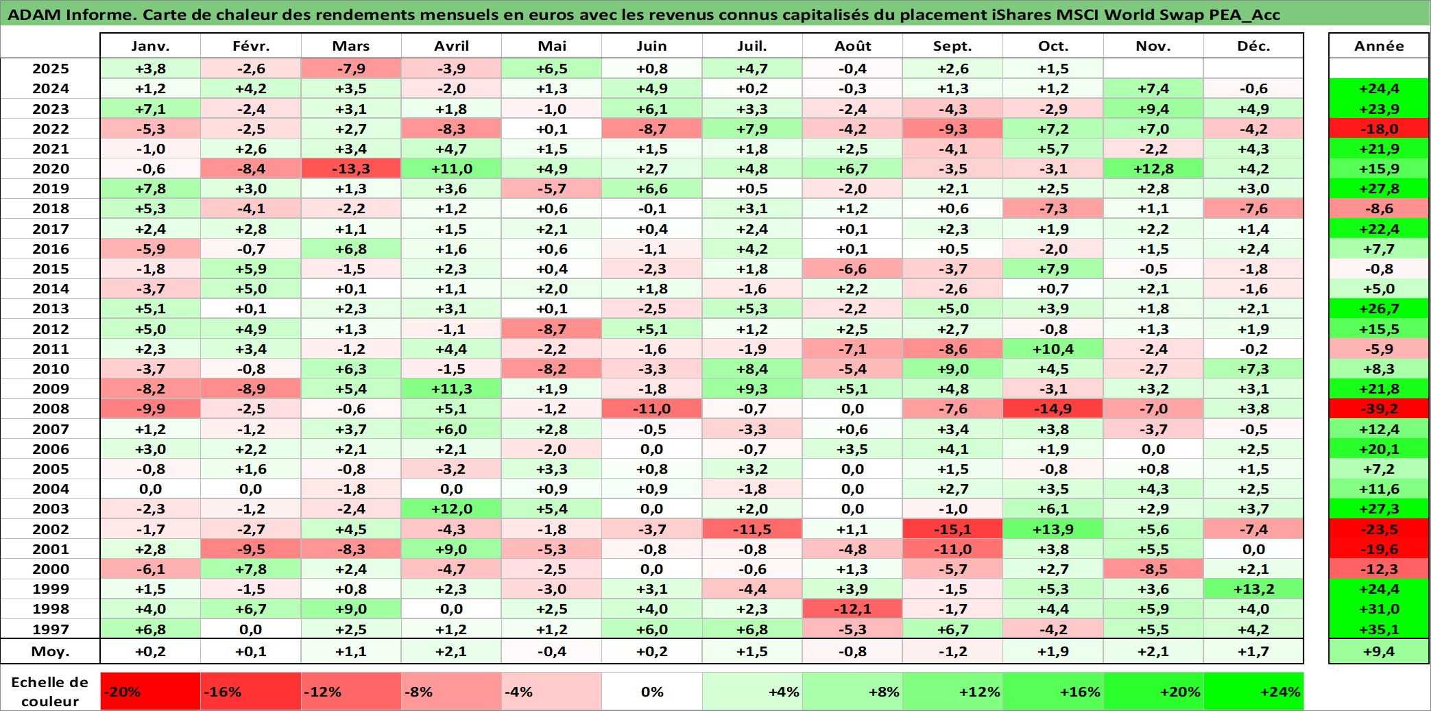 Site dédié aux investisseursPage dédiée sur site financeAnalyse des valorisations hebdomadaires du fonds iShares MSCI World Swap PEA_Acc. Cet actif est cote en EUR. Les valorisations couvrent les semaines 1997W01 a 2025W40. Les revenus de cet actif financier sont pris en compte depuis la semaine 1997W01. La note ESG de cet actif n'est pas connue.