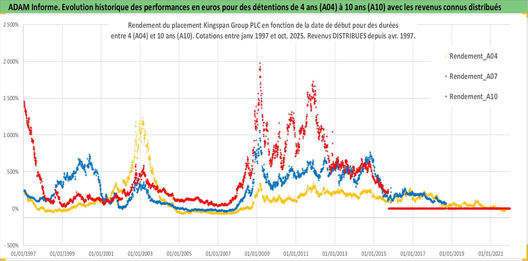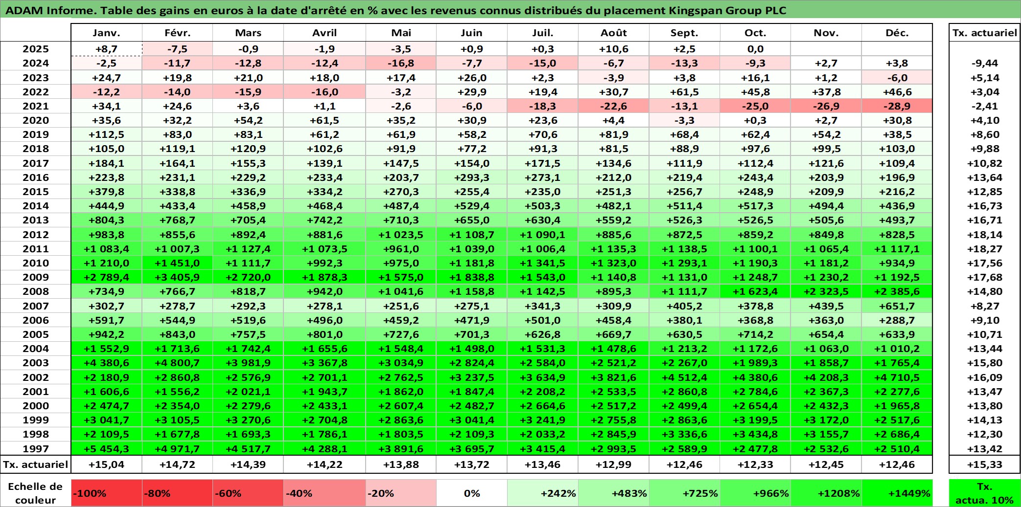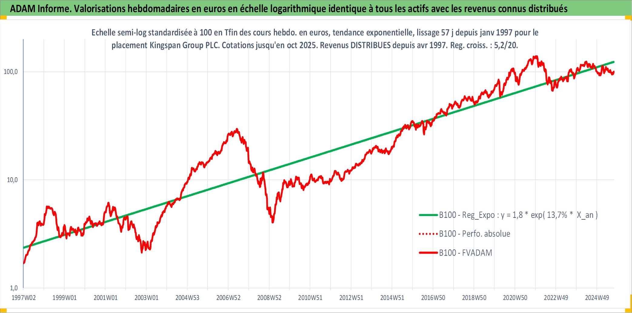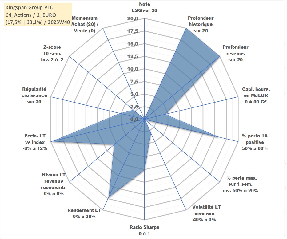Site dédié aux investisseursPage dédiée sur site financeAnalyse des valorisations hebdomadaires de l'action Kingspan Group PLC. Cet actif est cote en EUR. Les valorisations couvrent les semaines 1997W01 a 2025W40. Les revenus de cet actif financier sont pris en compte depuis la semaine 1997W18. La note ESG de cet actif n'est pas connue.