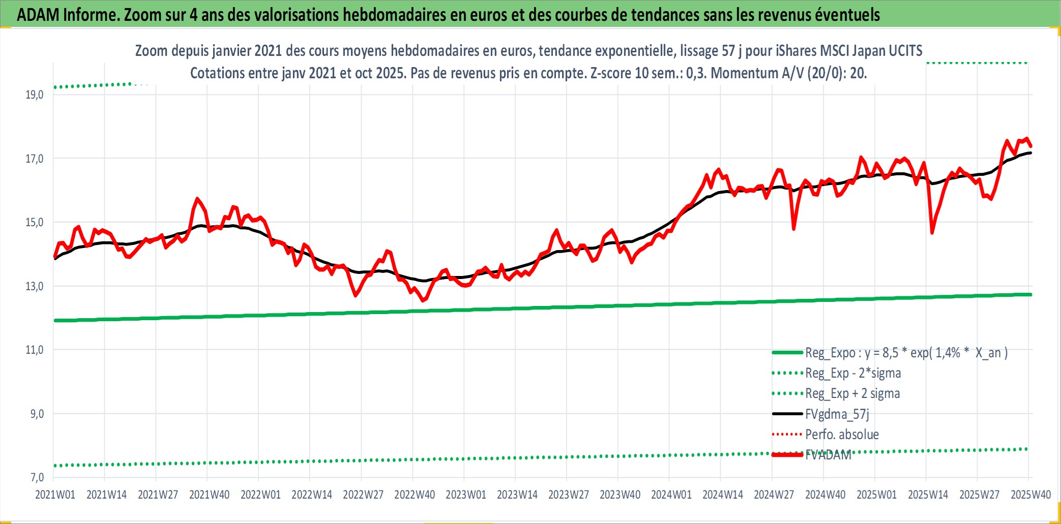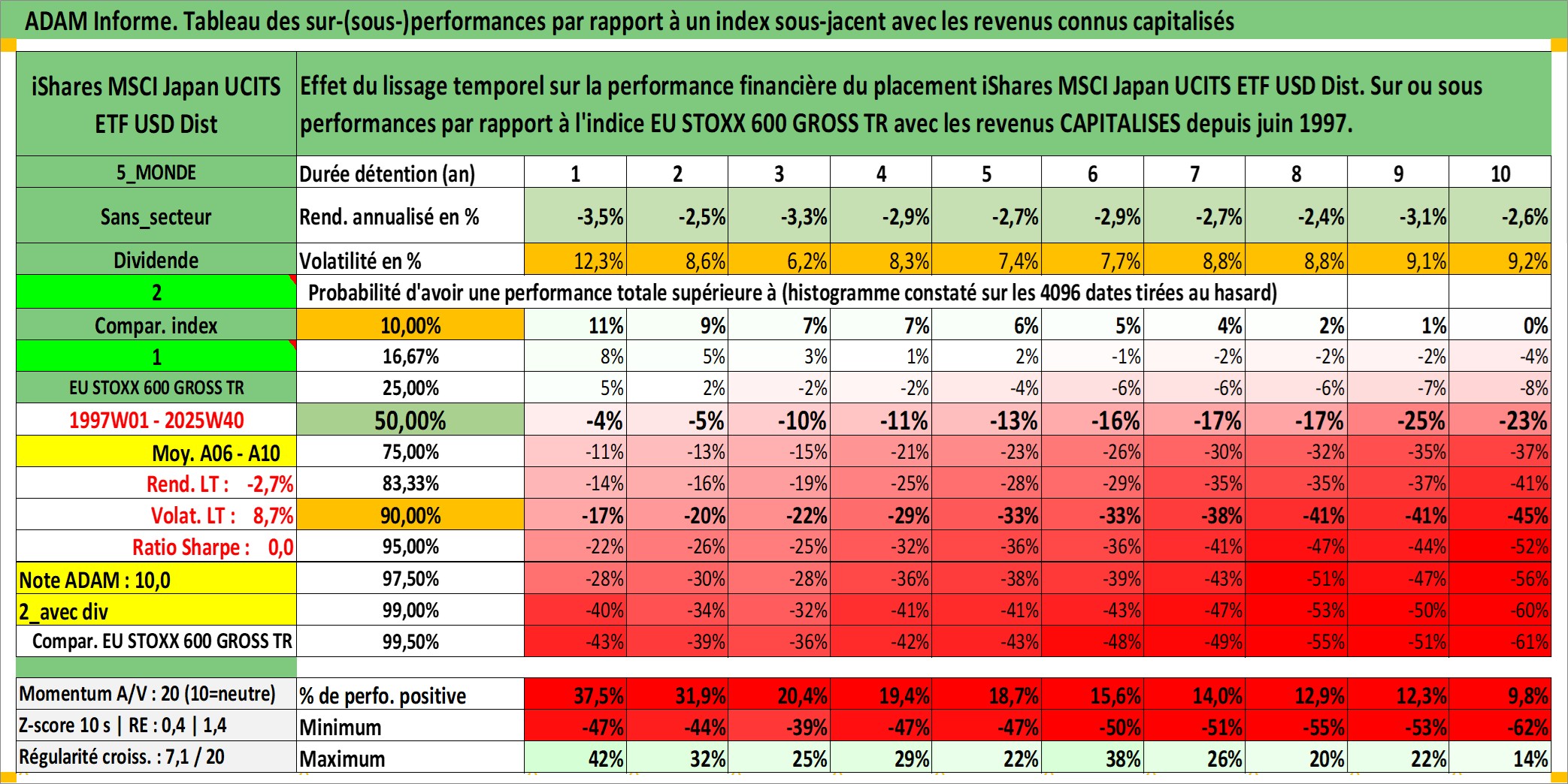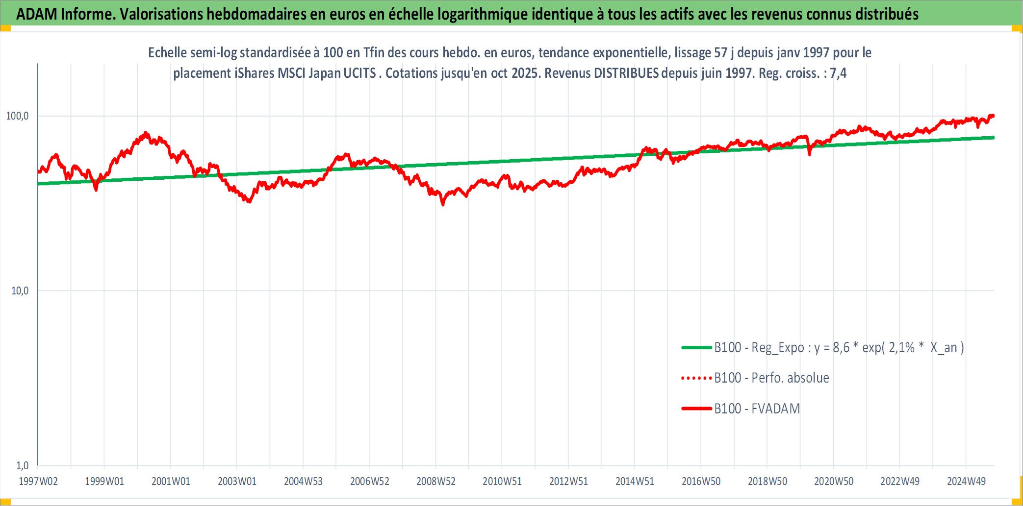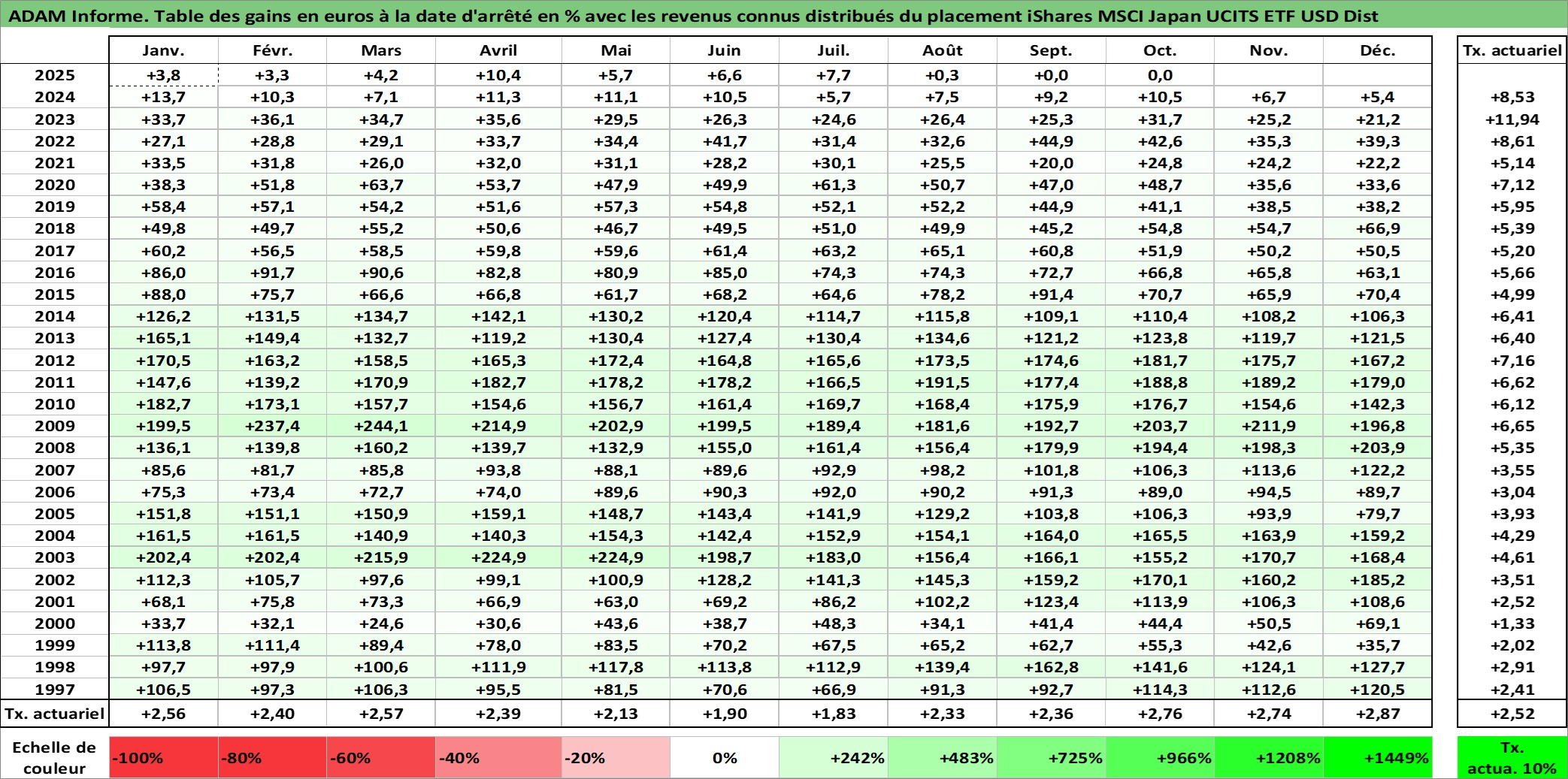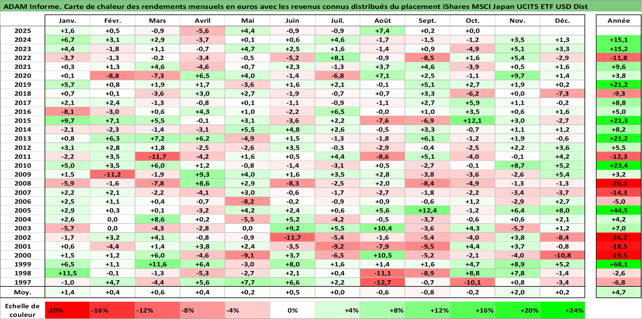 Site dédié aux investisseursPage dédiée sur site financeAnalyse des valorisations hebdomadaires du fonds iShares MSCI Japan UCITS ETF USD Dist. Cet actif est cote en USD. Les valorisations sont en contrevaleur EURO et couvrent les semaines 1997W01 a 2025W40. Les revenus de cet actif financier sont pris en compte depuis la semaine 1997W26. La note ESG de cet actif n'est pas connue.