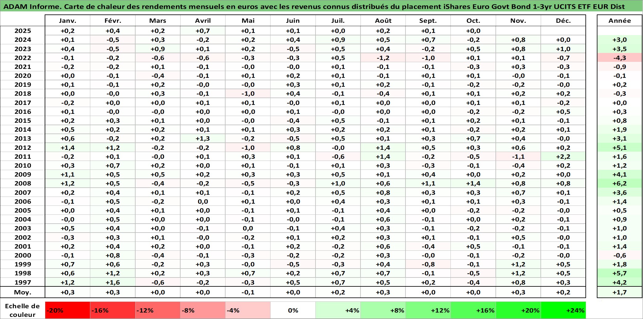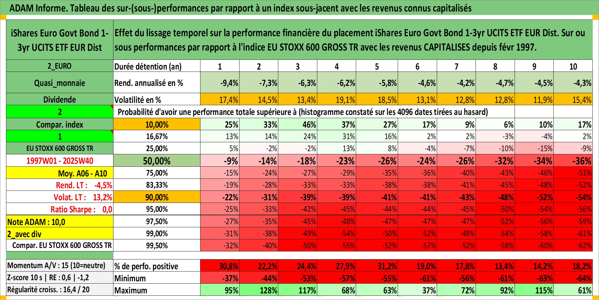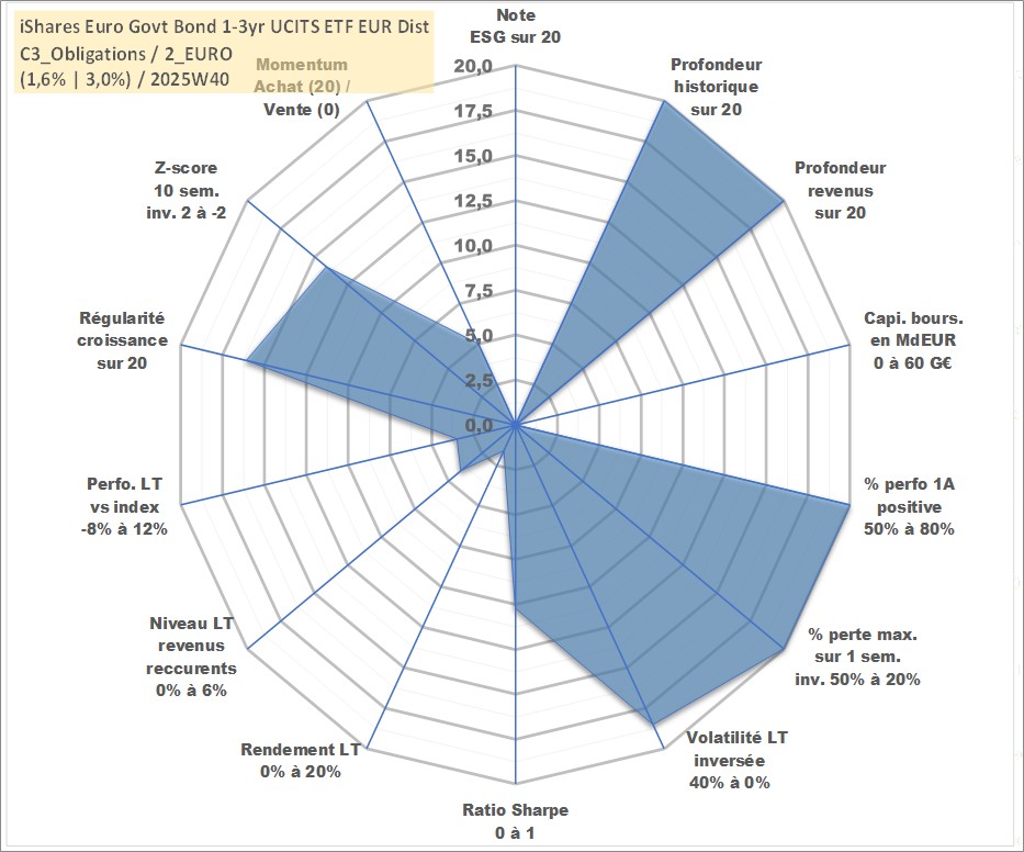 Site dédié aux investisseursPage dédiée sur site financeAnalyse des valorisations hebdomadaires du fonds iShares Euro Govt Bond 1-3yr UCITS ETF EUR Dist. Cet actif est cote en EUR. Les valorisations couvrent les semaines 1997W01 a 2025W40. Les revenus de cet actif financier sont pris en compte depuis la semaine 1997W09. La note ESG de cet actif n'est pas connue.