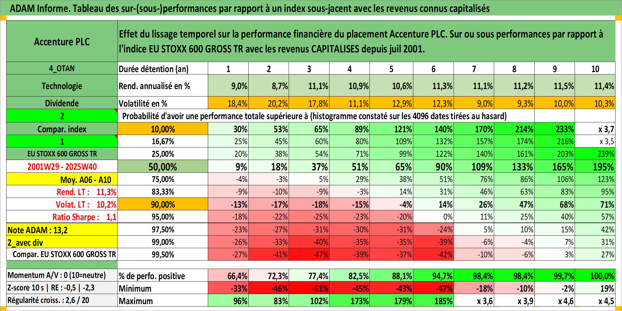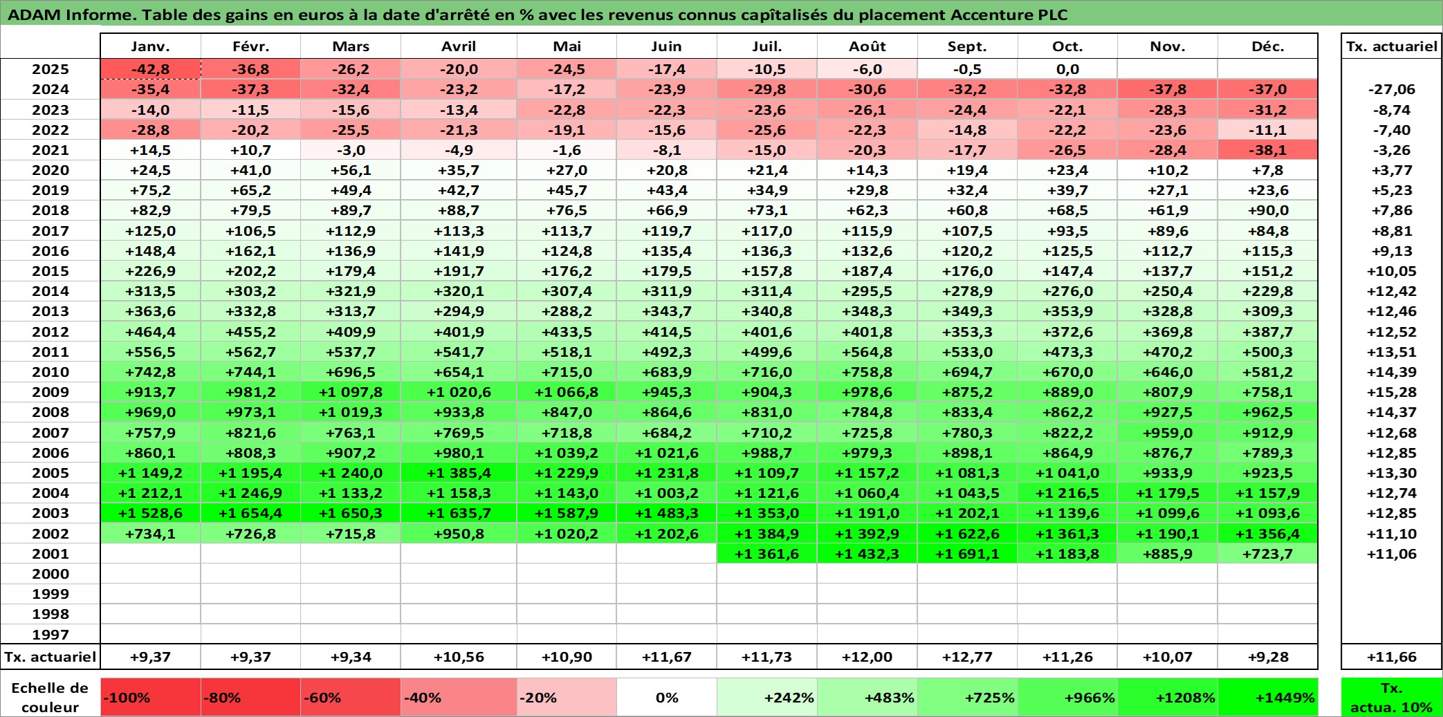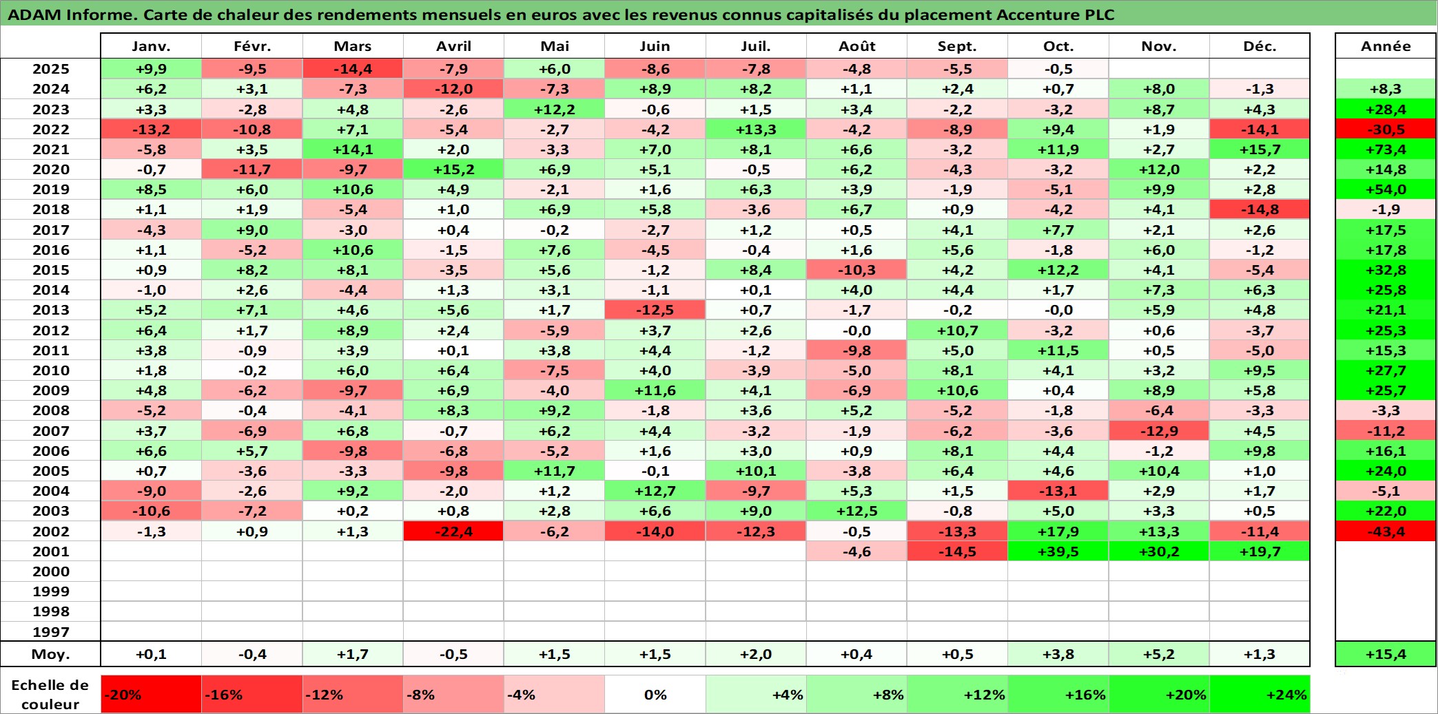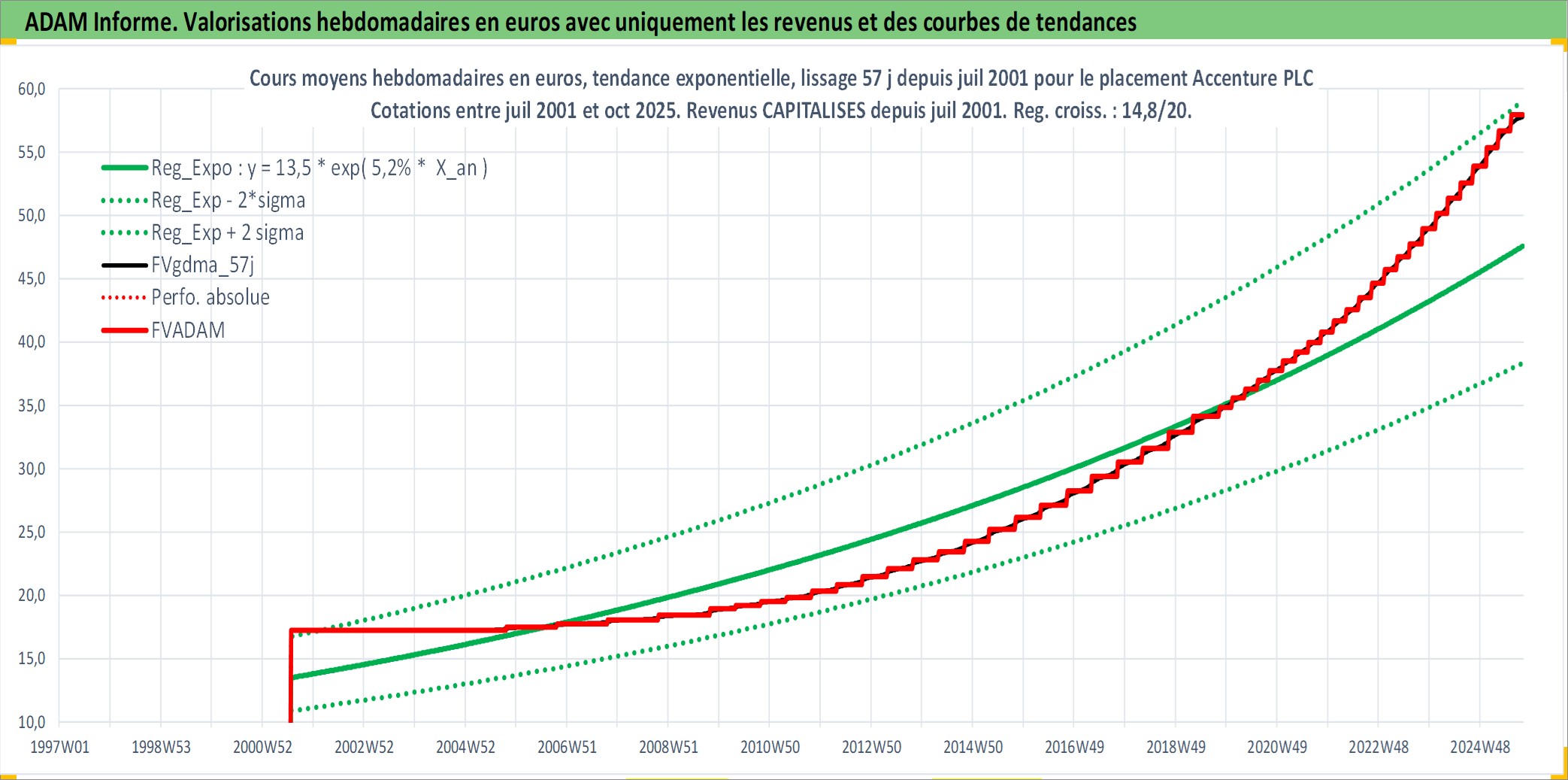 Site dédié aux investisseursPage dédiée sur site financeAnalyse des valorisations hebdomadaires de l'action Accenture PLC. Cet actif est cote en USD. Les valorisations sont en contrevaleur EURO et couvrent les semaines 2001W29 a 2025W40. Les revenus de cet actif financier sont pris en compte depuis la semaine 2001W29. La note globale ESG de cet actif est estimee a 17.0 (apres rebasage entre 0 et 20).