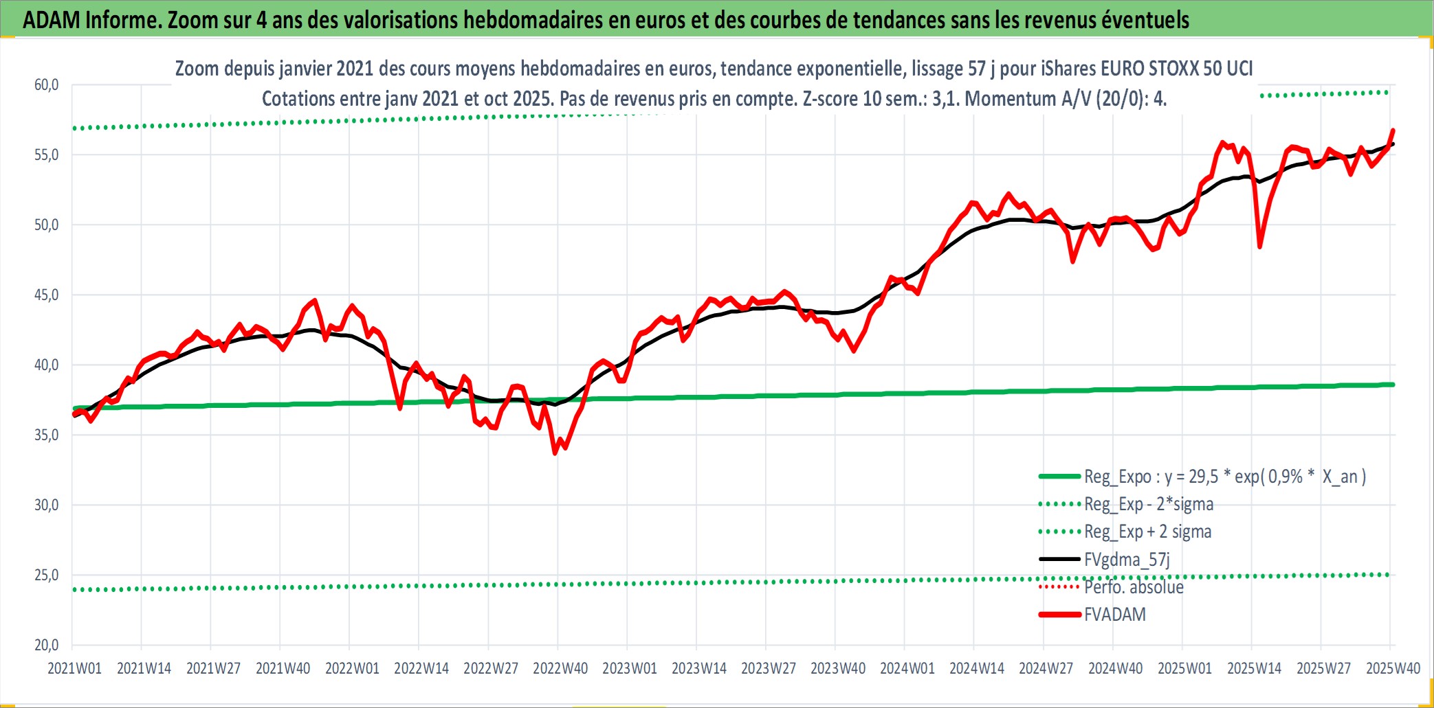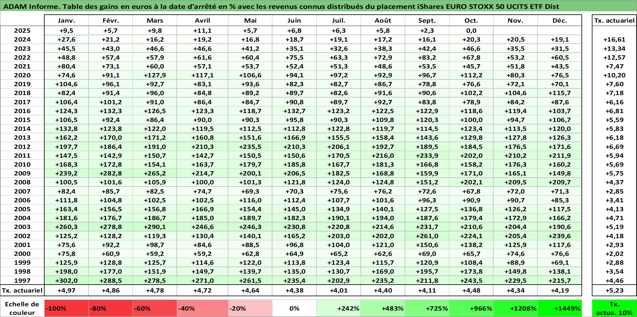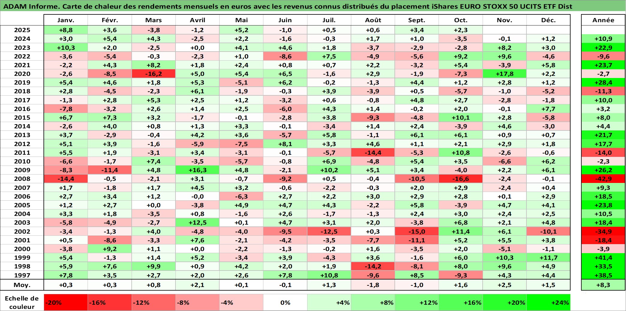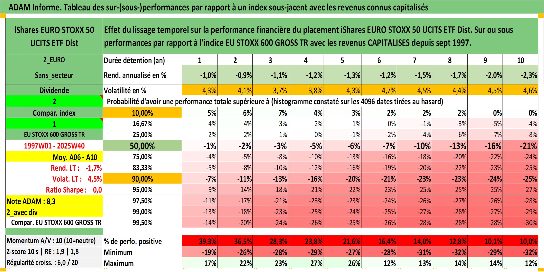 Site dédié aux investisseursPage dédiée sur site financeAnalyse des valorisations hebdomadaires du fonds iShares EURO STOXX 50 UCITS ETF Dist. Cet actif est cote en EUR. Les valorisations couvrent les semaines 1997W01 a 2025W40. Les revenus de cet actif financier sont pris en compte depuis la semaine 1997W40. La note ESG de cet actif n'est pas connue.
