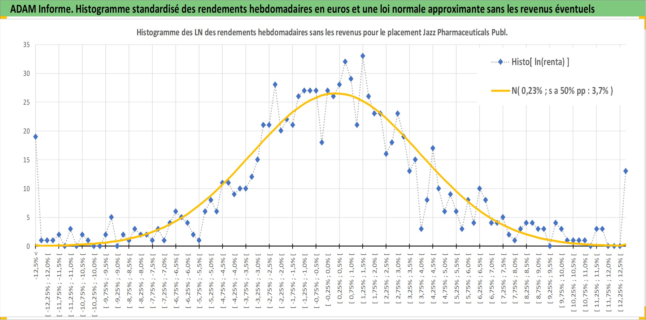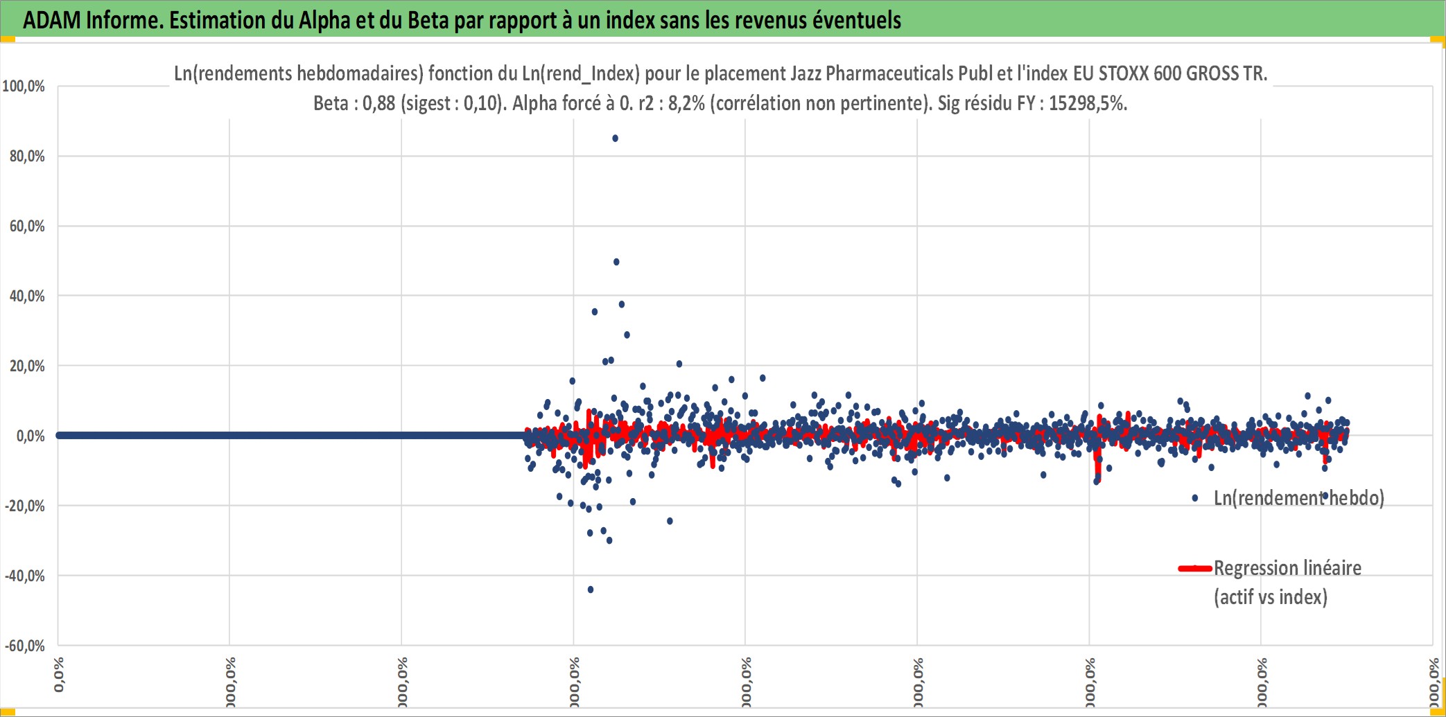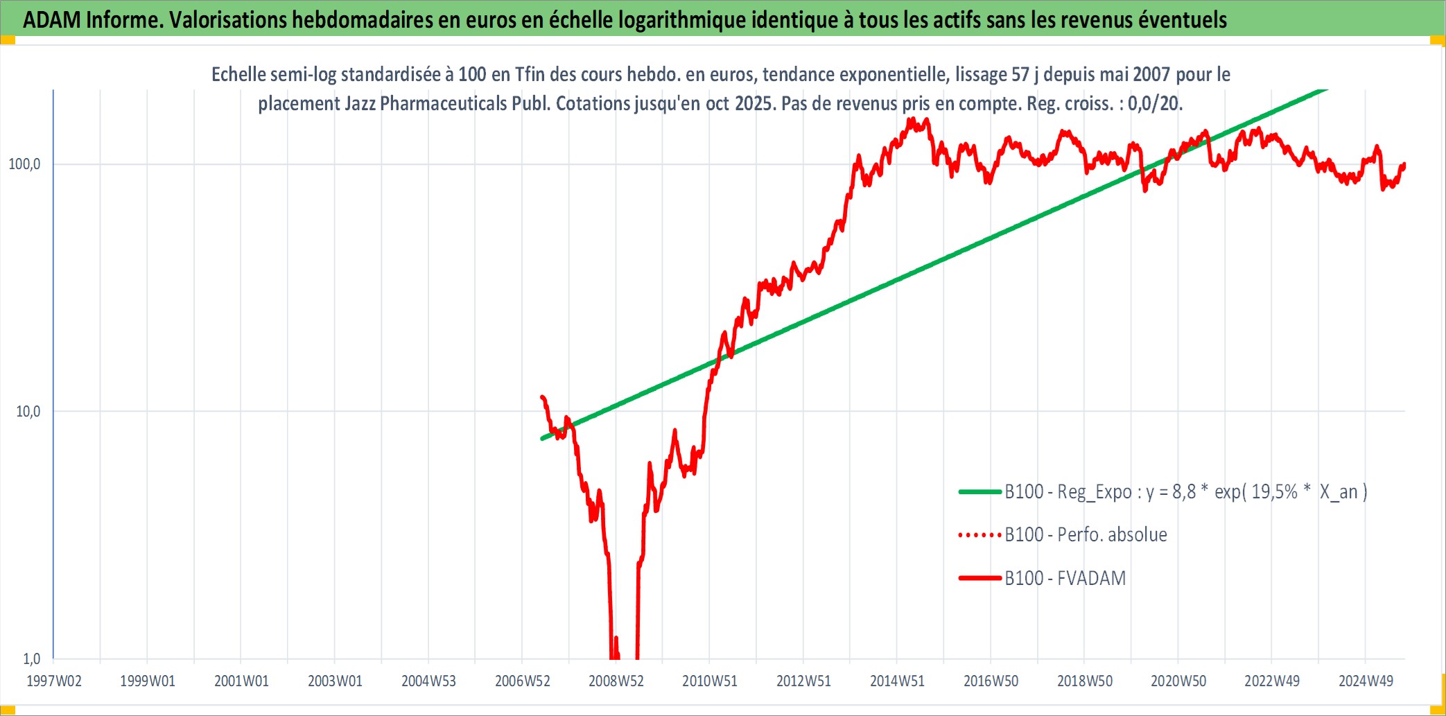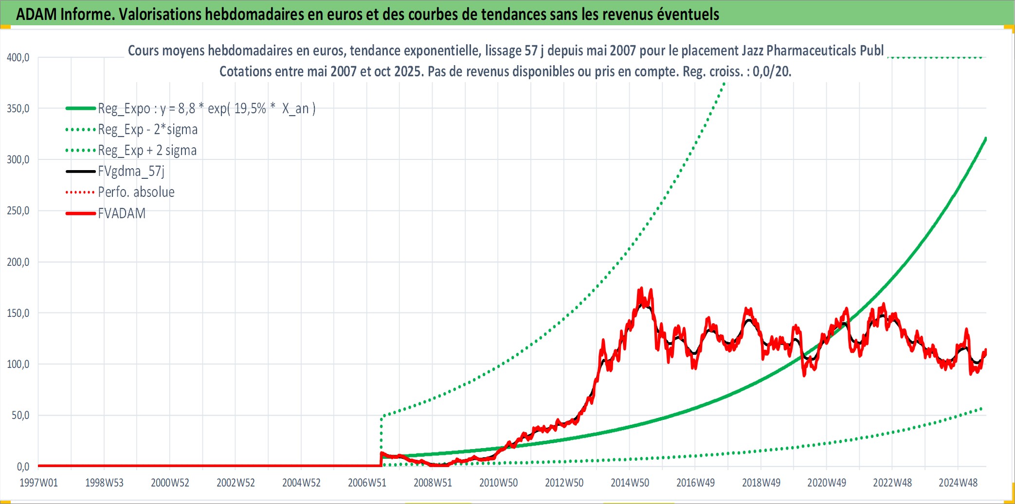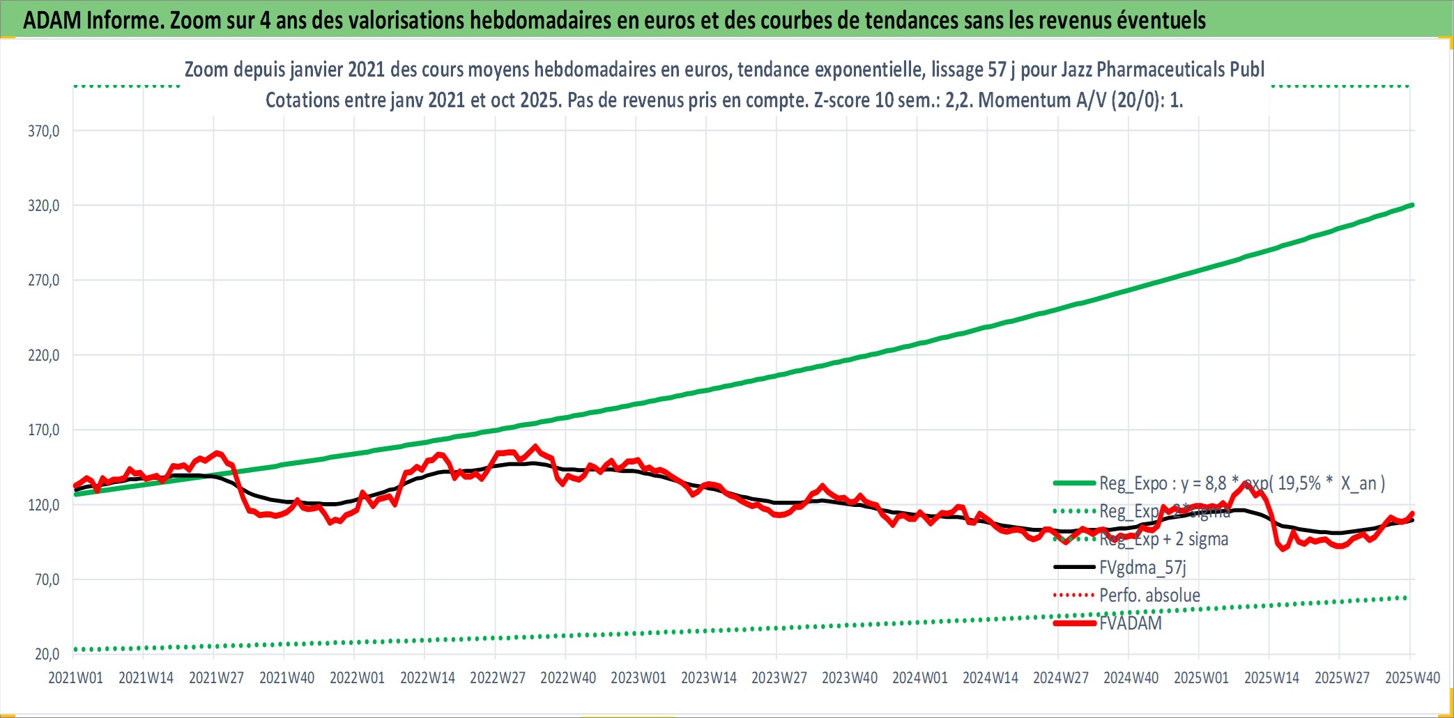 Site dédié aux investisseursPage dédiée sur site financeAnalyse des valorisations hebdomadaires de l'action Jazz Pharmaceuticals Public Limited Company. Cet actif est cote en USD. Les valorisations sont en contrevaleur EURO et couvrent les semaines 2007W22 a 2025W40. Les revenus de cet actif financier ne sont pas connus car non existants ou non disponibles sur le site Yahoo Finance. La note globale ESG de cet actif est estimee a 7.0 (apres rebasage entre 0 et 20).