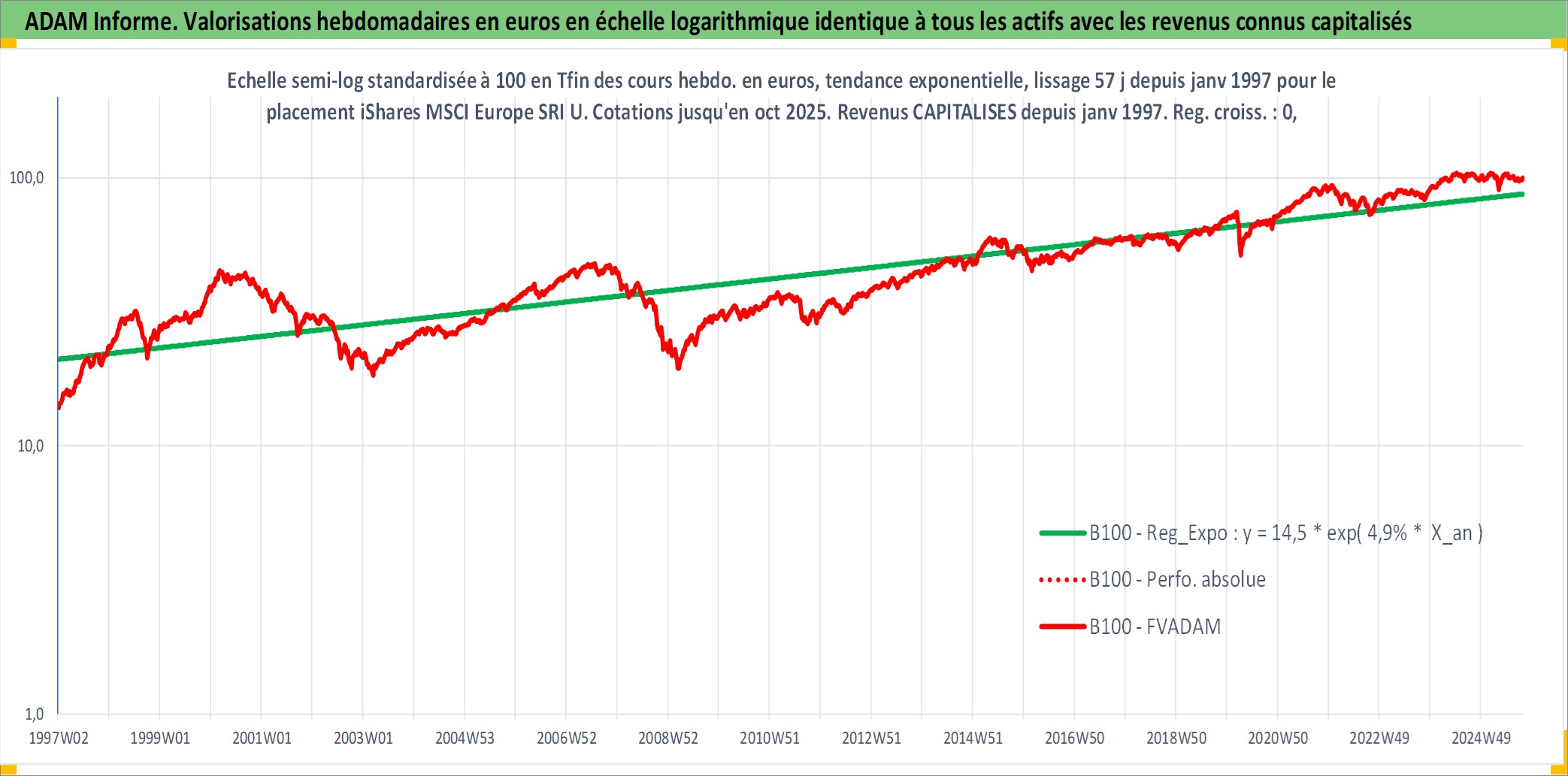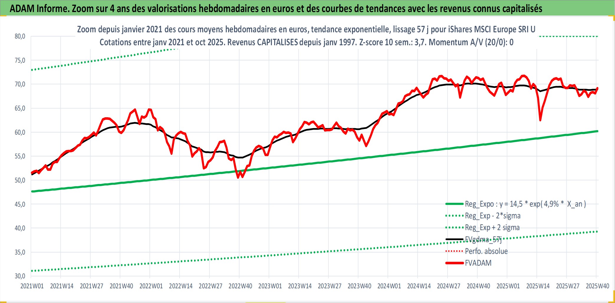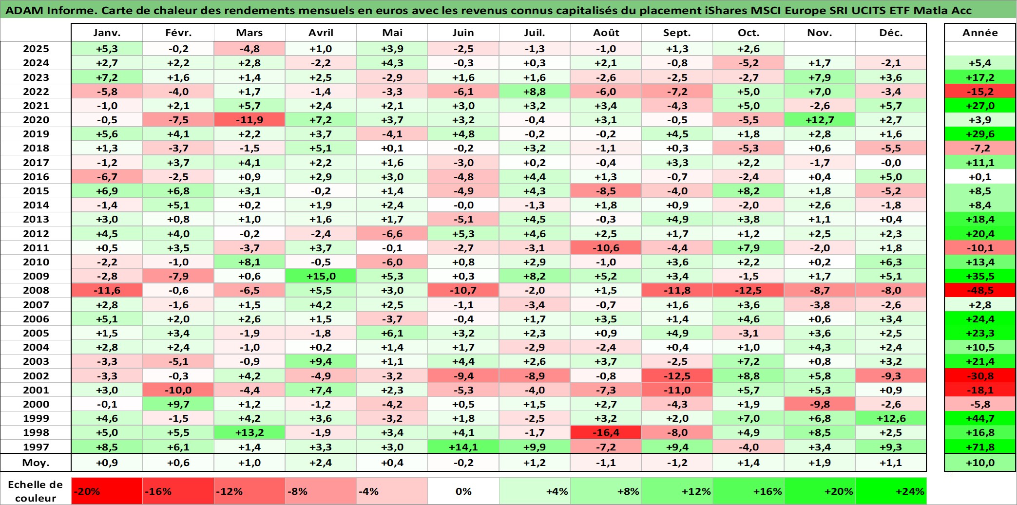 Site dédié aux investisseursPage dédiée sur site financeAnalyse des valorisations hebdomadaires du fonds iShares MSCI Europe SRI UCITS ETF Matla Acc. Cet actif est cote en EUR. Les valorisations couvrent les semaines 1997W01 a 2025W40. Les revenus de cet actif financier sont pris en compte depuis la semaine 1997W01. La note globale ESG de cet actif est estimee a 9.1 (apres rebasage entre 0 et 20).