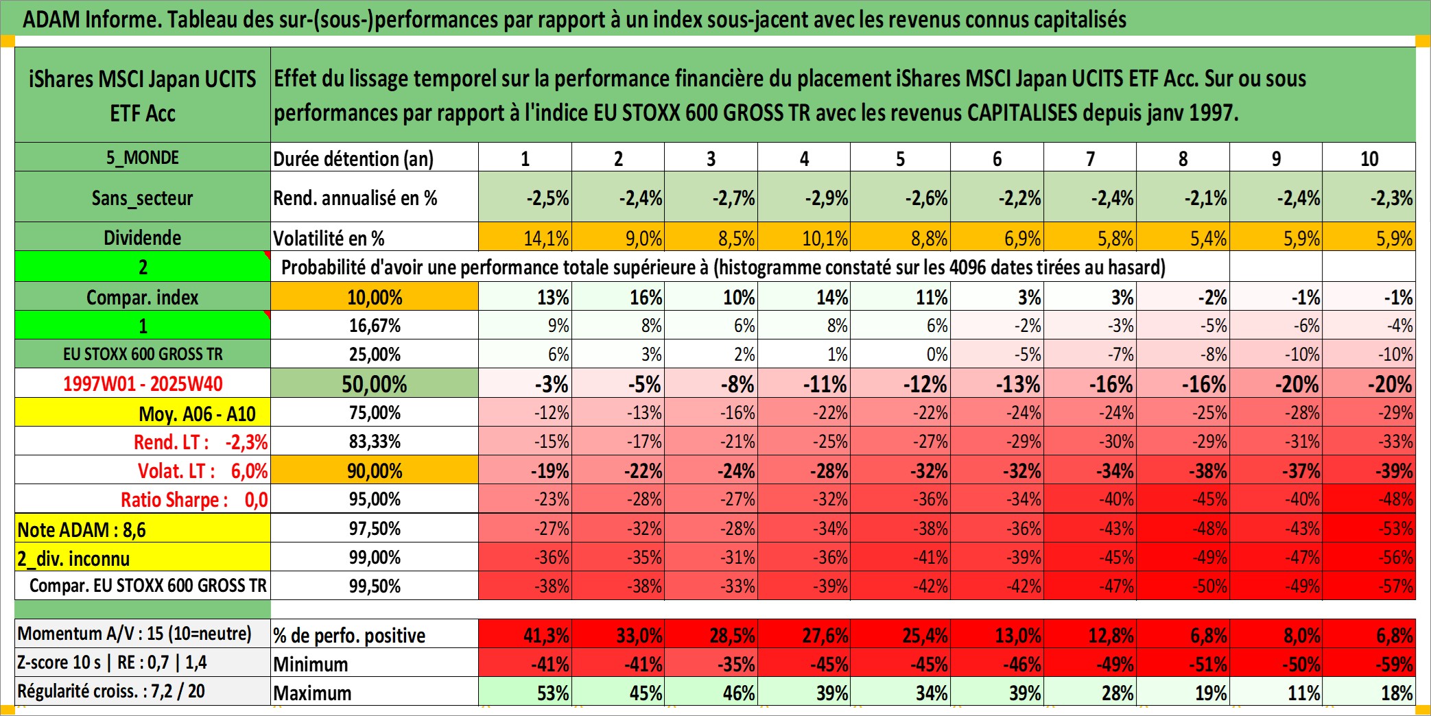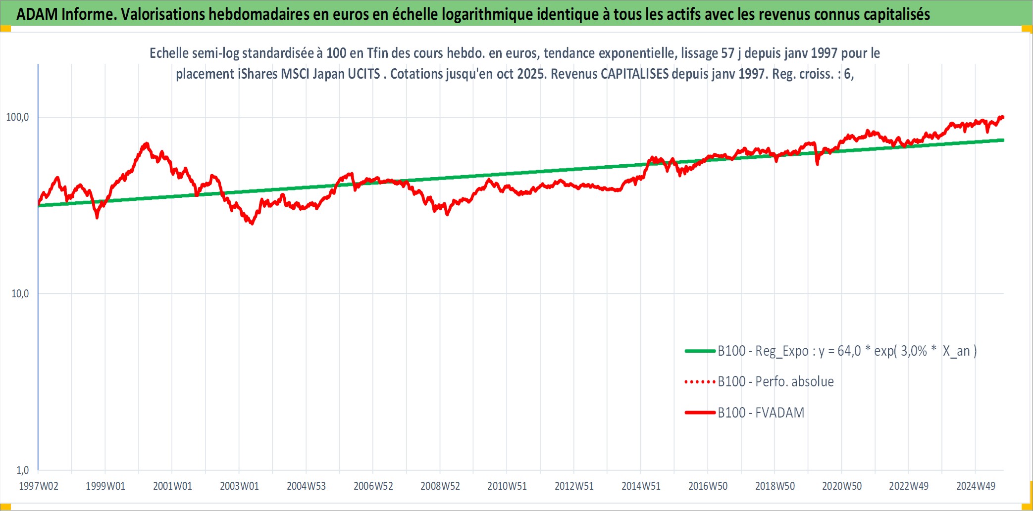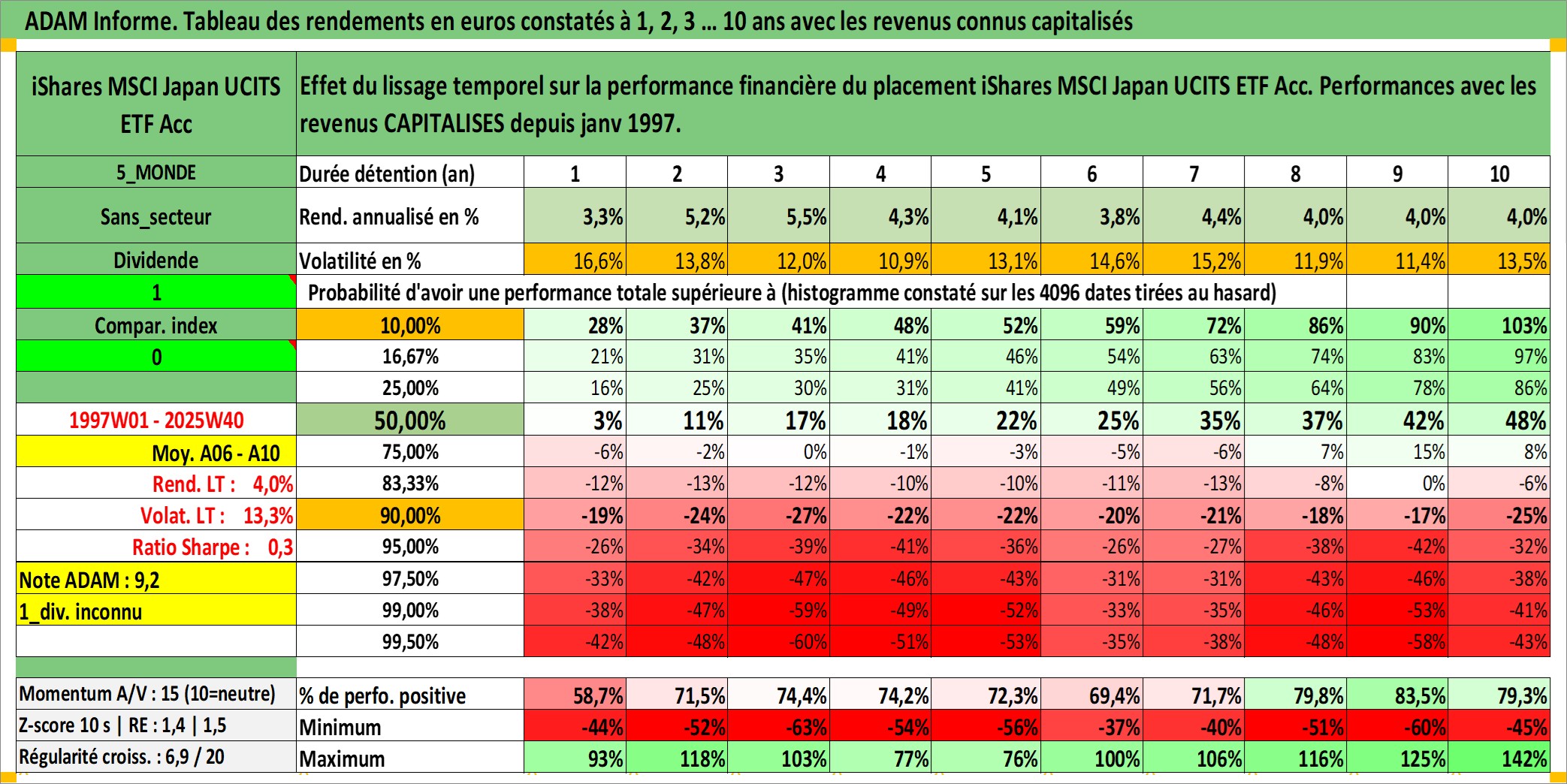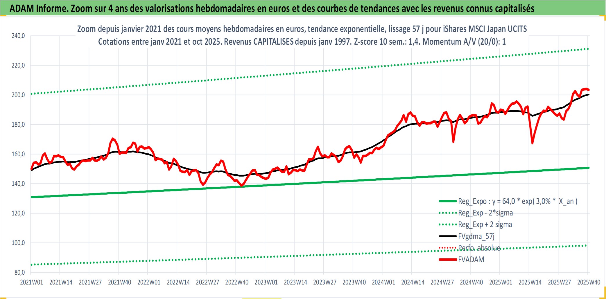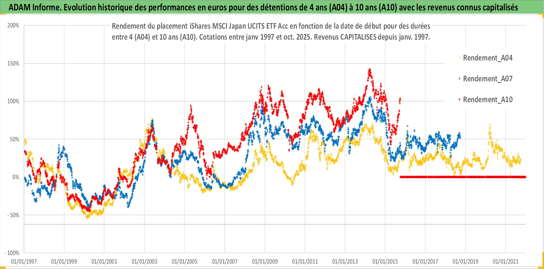 Site dédié aux investisseursPage dédiée sur site financeAnalyse des valorisations hebdomadaires du fonds iShares MSCI Japan UCITS ETF Acc. Cet actif est cote en USD. Les valorisations sont en contrevaleur EURO et couvrent les semaines 1997W01 a 2025W40. Les revenus de cet actif financier sont pris en compte depuis la semaine 1997W01. La note ESG de cet actif n'est pas connue.