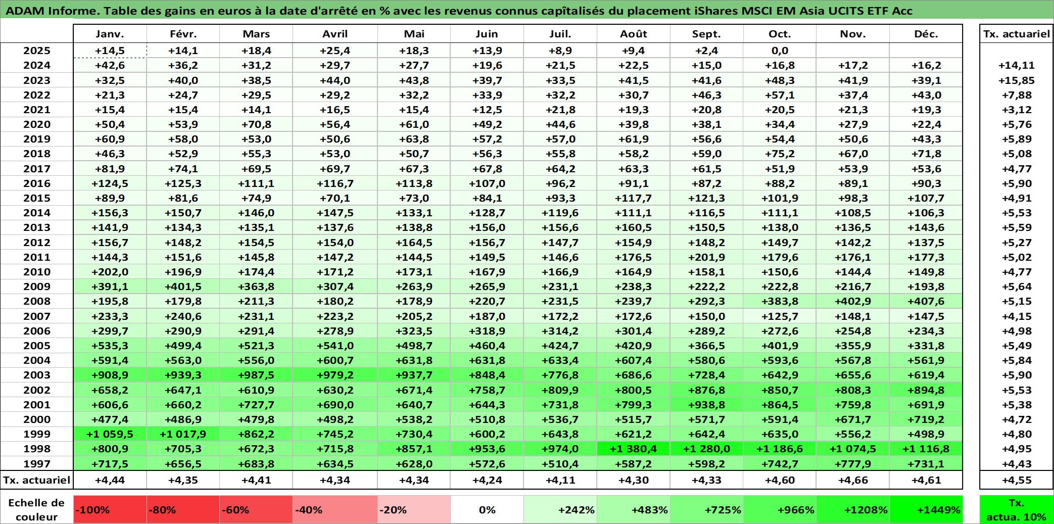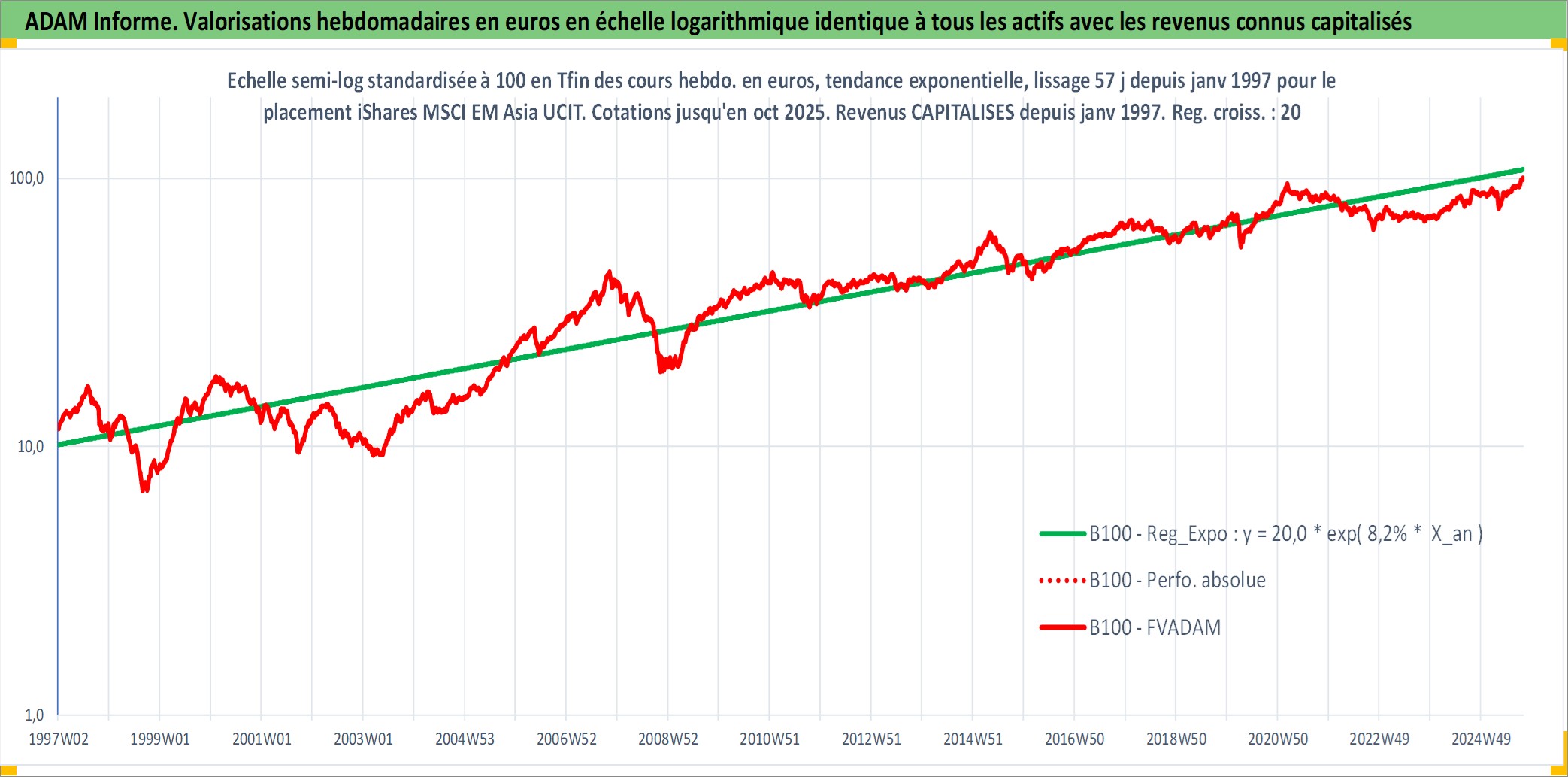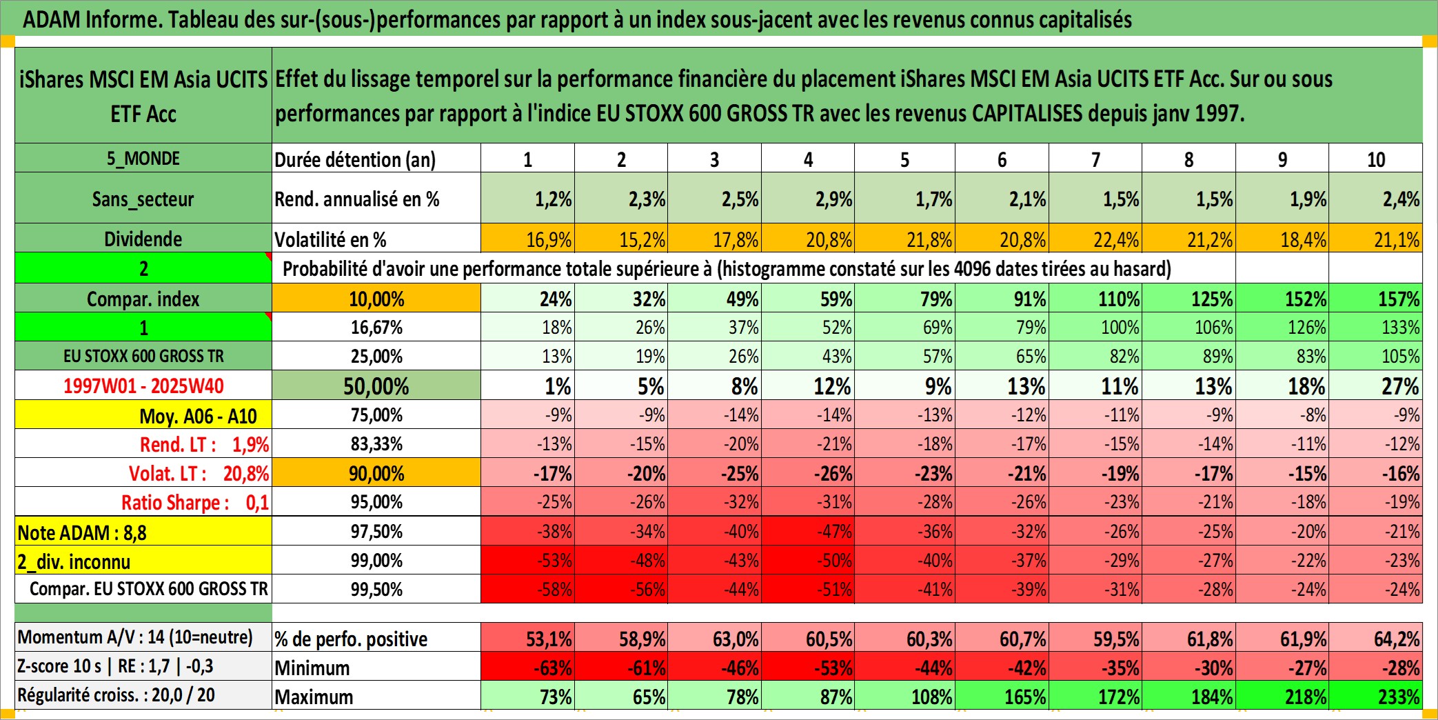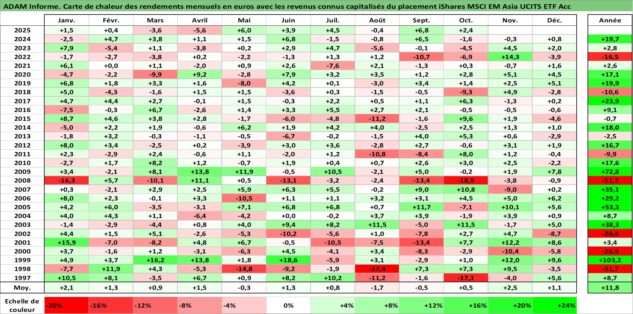Site dédié aux investisseursPage dédiée sur site financeAnalyse des valorisations hebdomadaires du fonds iShares MSCI EM Asia UCITS ETF Acc. Cet actif est cote en USD. Les valorisations sont en contrevaleur EURO et couvrent les semaines 1997W01 a 2025W40. Les revenus de cet actif financier sont pris en compte depuis la semaine 1997W01. La note ESG de cet actif n'est pas connue.