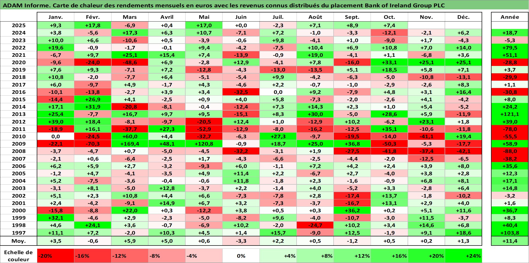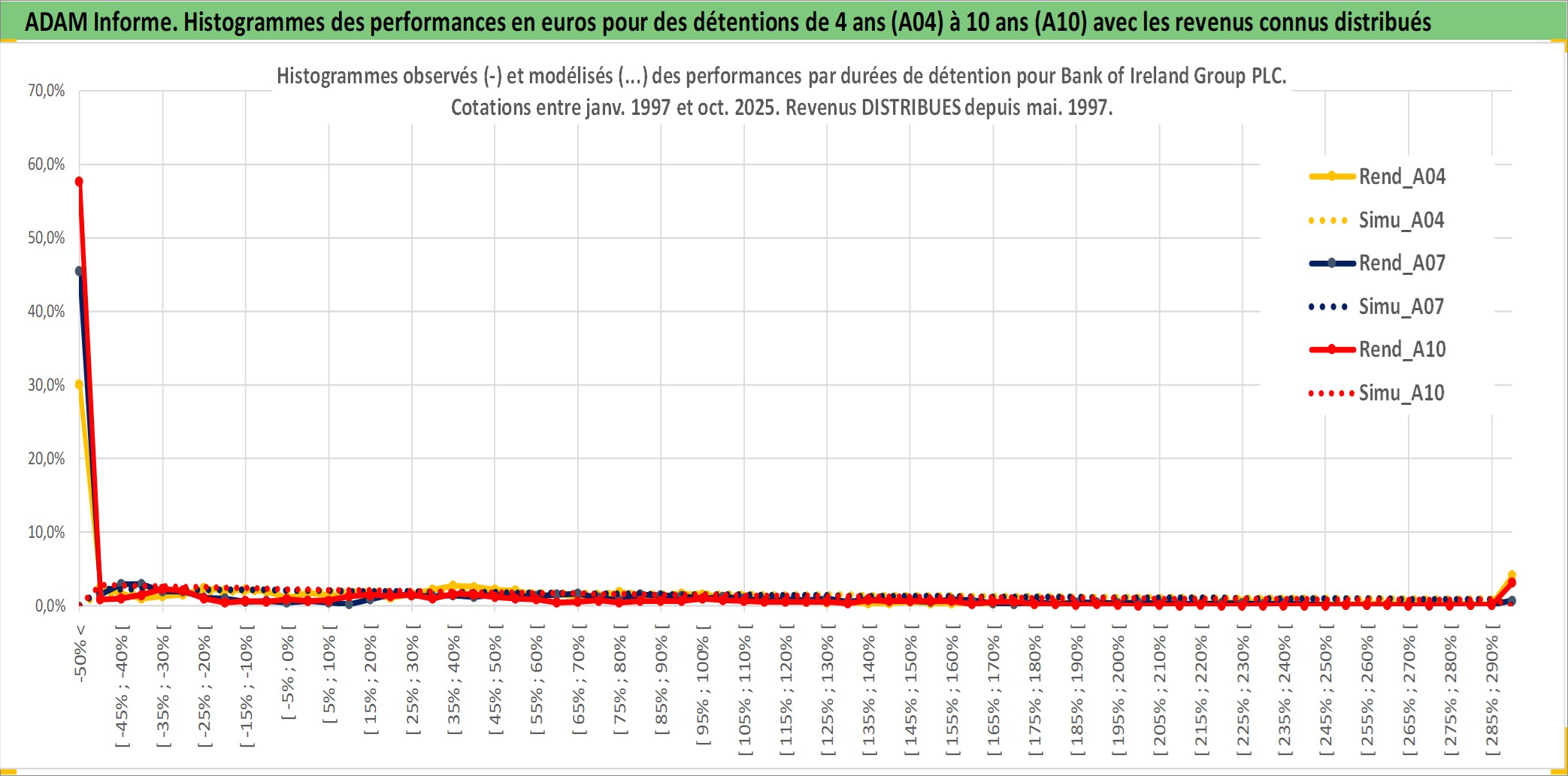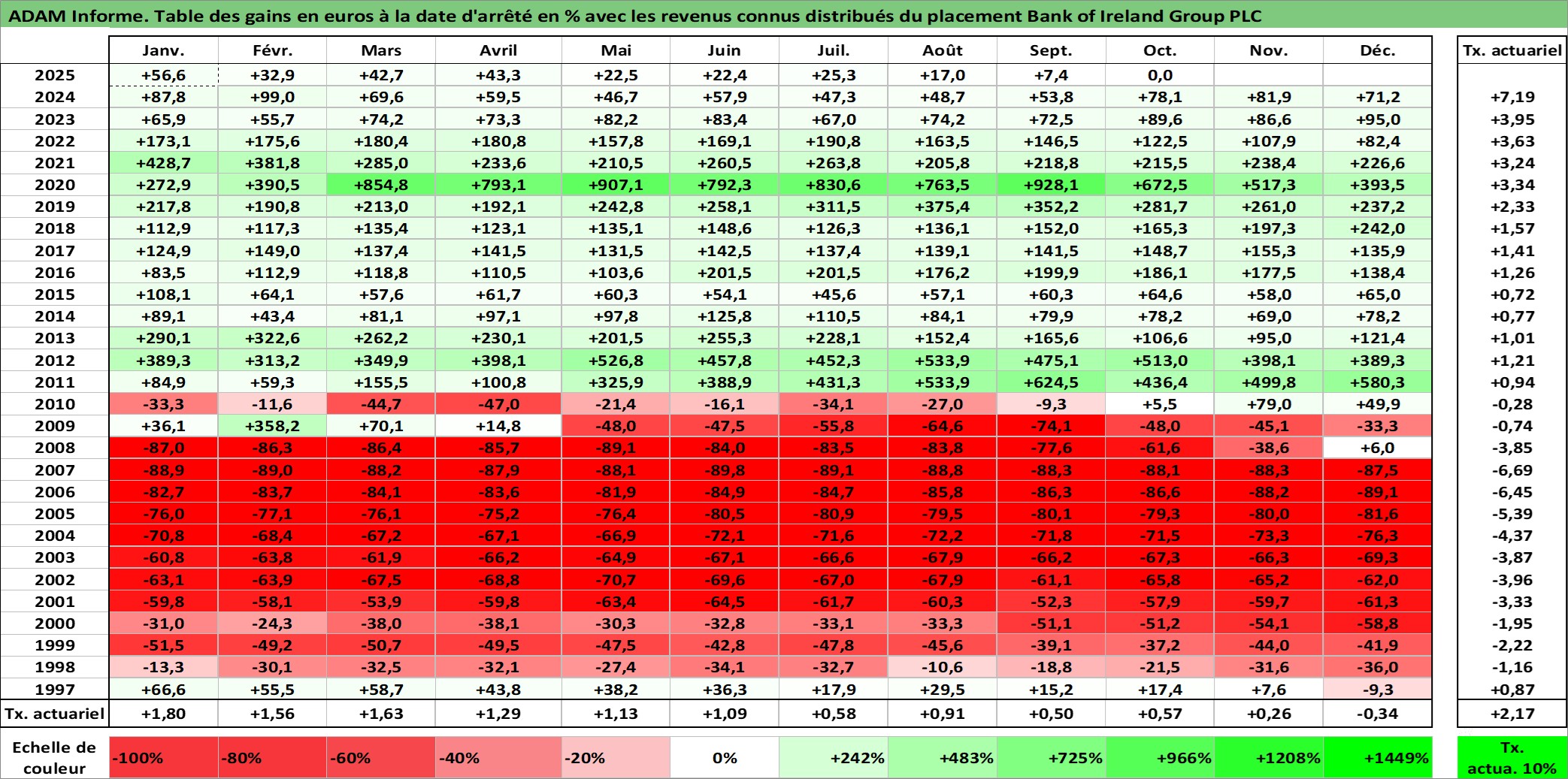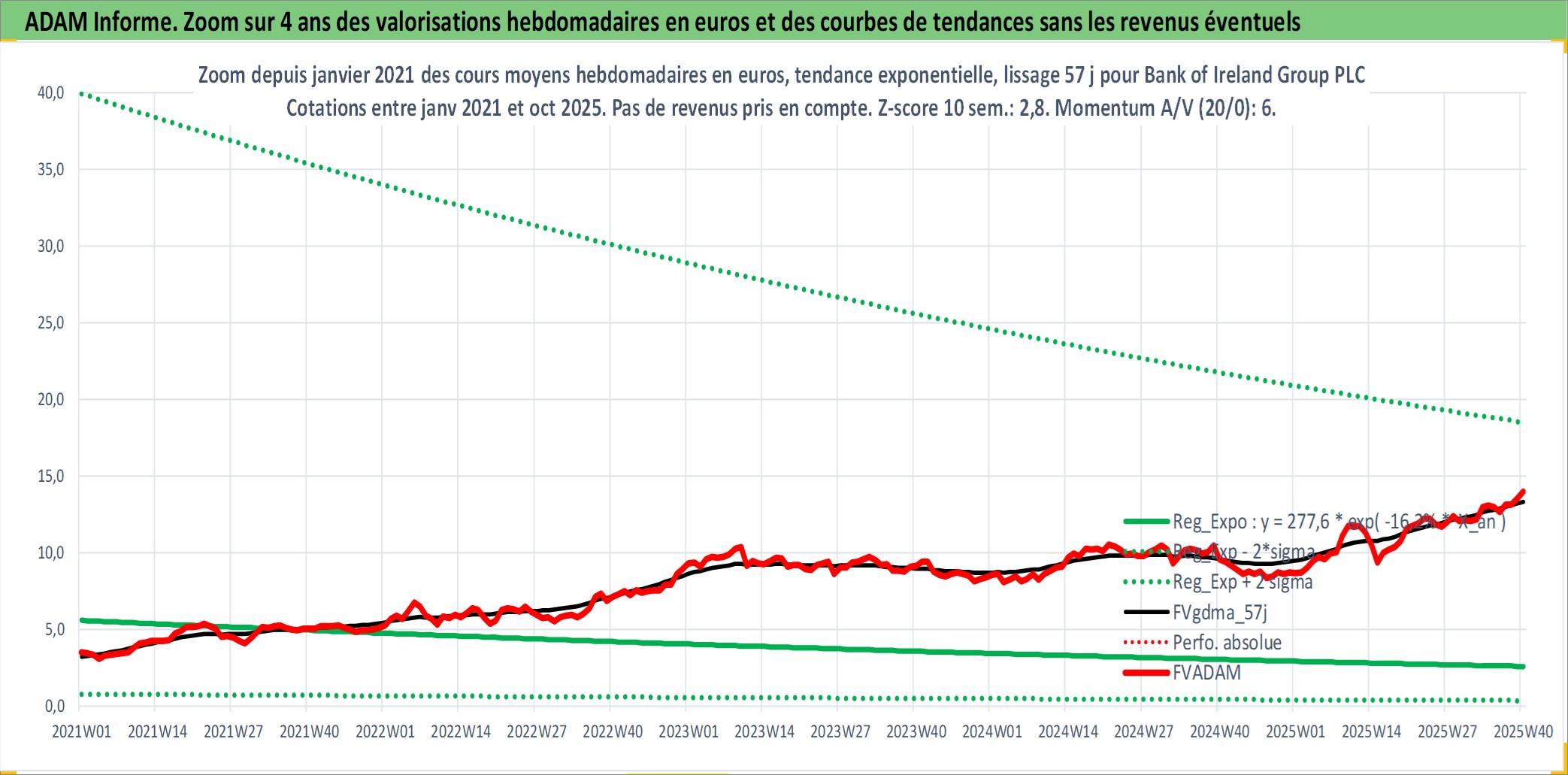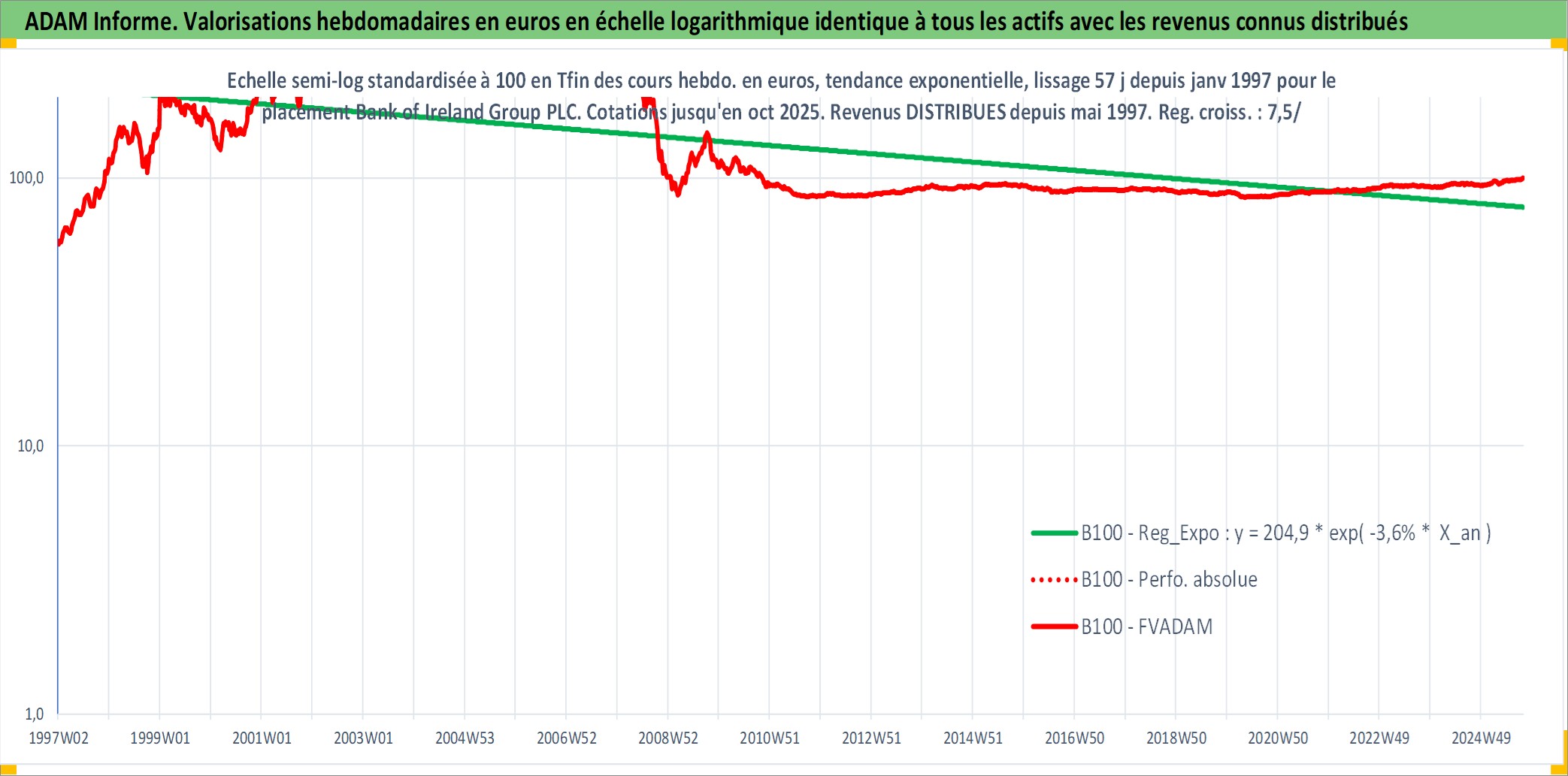 Site dédié aux investisseursPage dédiée sur site financeAnalyse des valorisations hebdomadaires de l'action Bank of Ireland Group PLC. Cet actif est cote en EUR. Les valorisations couvrent les semaines 1997W01 a 2025W40. Les revenus de cet actif financier sont pris en compte depuis la semaine 1997W22. La note globale ESG de cet actif est estimee a 10.0 (apres rebasage entre 0 et 20).