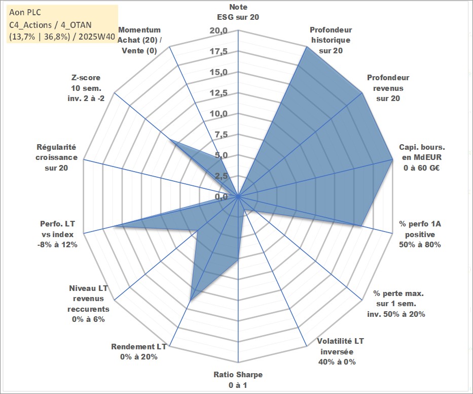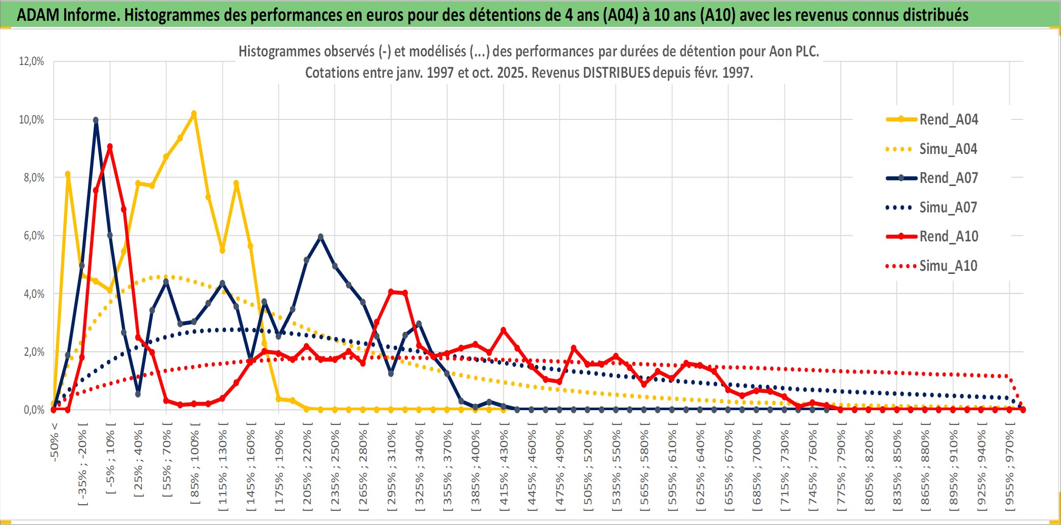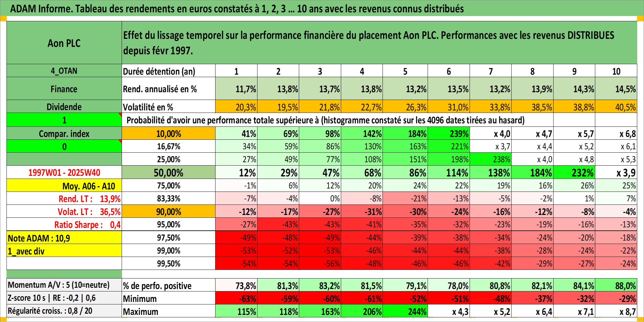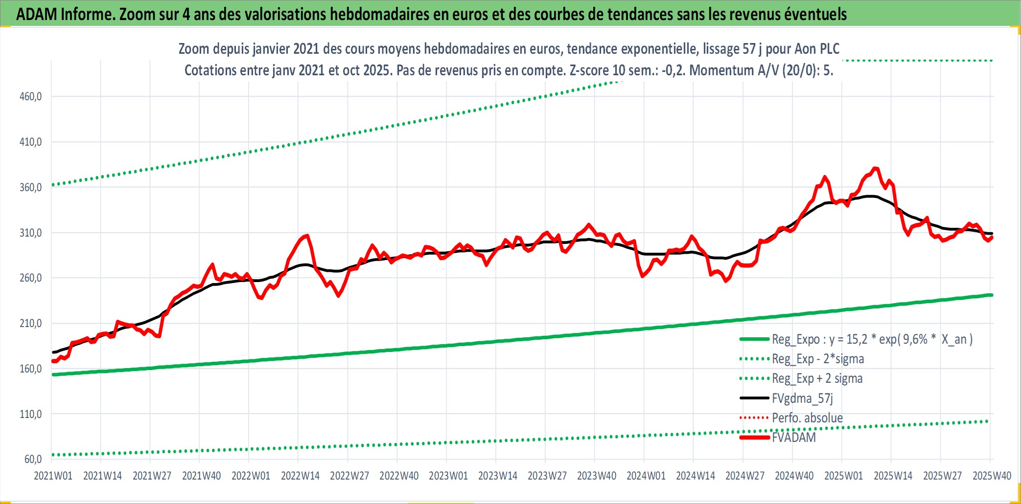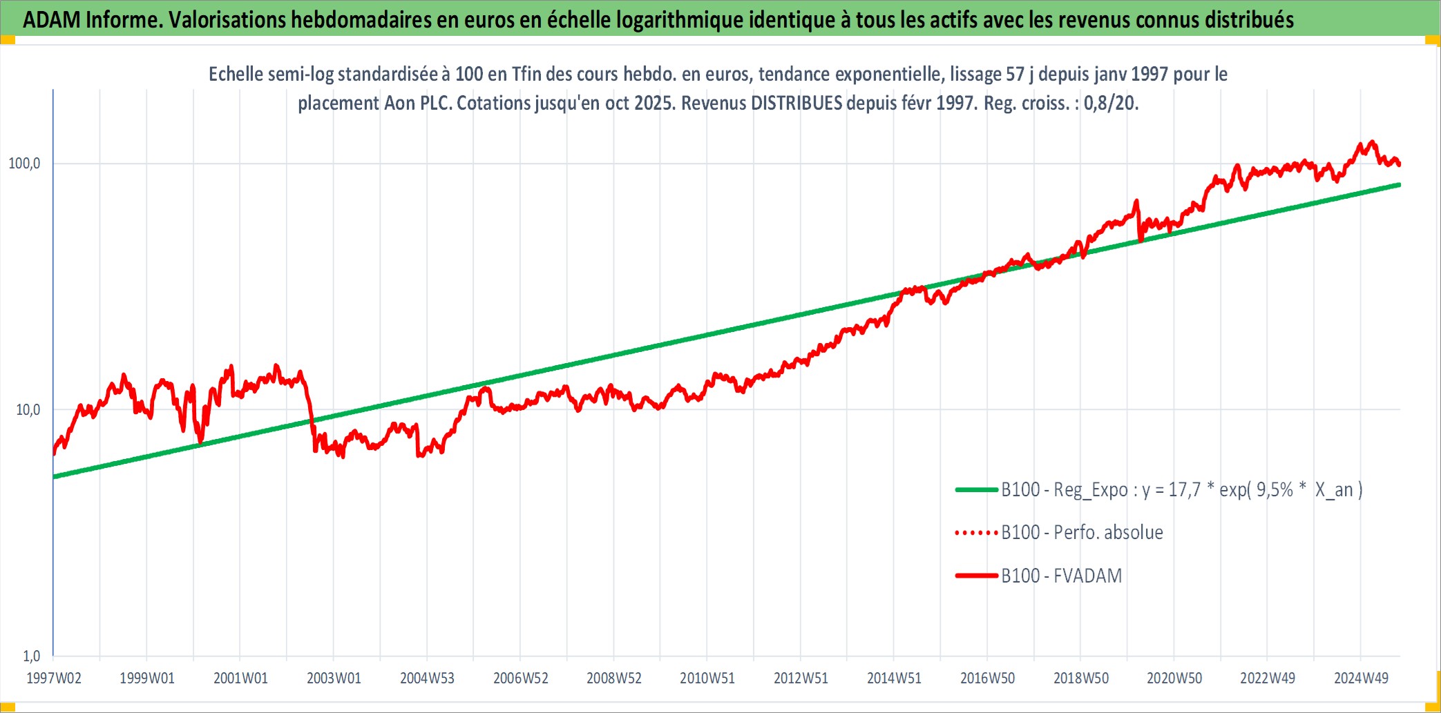 Site dédié aux investisseursPage dédiée sur site financeAnalyse des valorisations hebdomadaires de l'action Aon PLC. Cet actif est cote en USD. Les valorisations sont en contrevaleur EURO et couvrent les semaines 1997W01 a 2025W40. Les revenus de cet actif financier sont pris en compte depuis la semaine 1997W06. La note ESG de cet actif n'est pas connue.