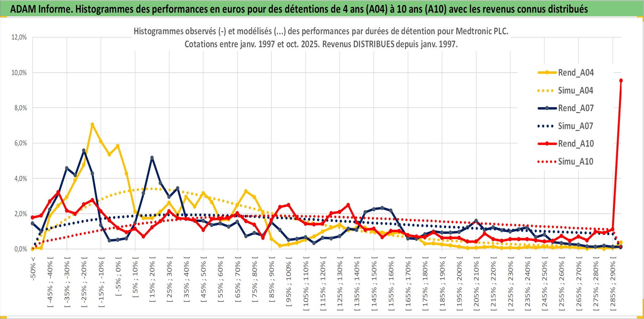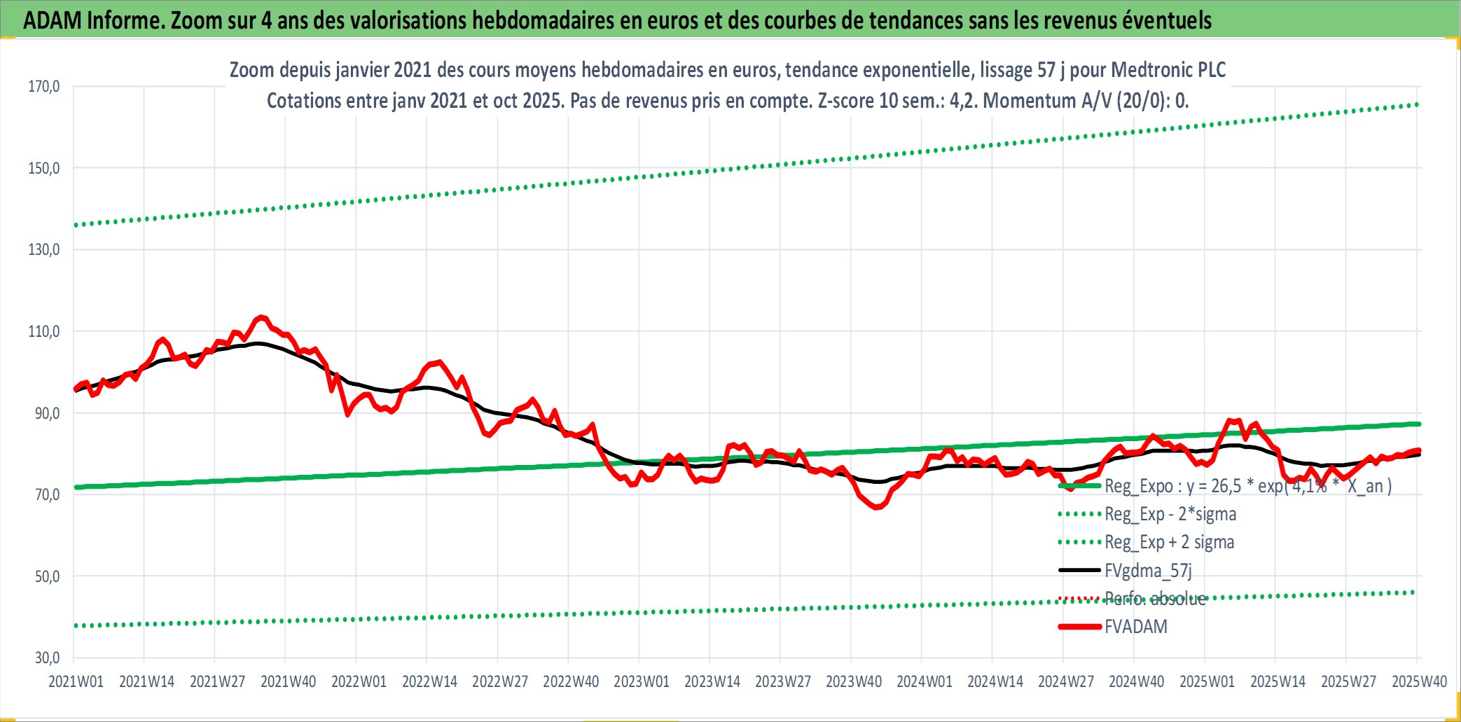 Site dédié aux investisseursPage dédiée sur site financeAnalyse des valorisations hebdomadaires de l'action Medtronic PLC. Cet actif est cote en USD. Les valorisations sont en contrevaleur EURO et couvrent les semaines 1997W01 a 2025W40. Les revenus de cet actif financier sont pris en compte depuis la semaine 1997W02. La note globale ESG de cet actif est estimee a 9.0 (apres rebasage entre 0 et 20).