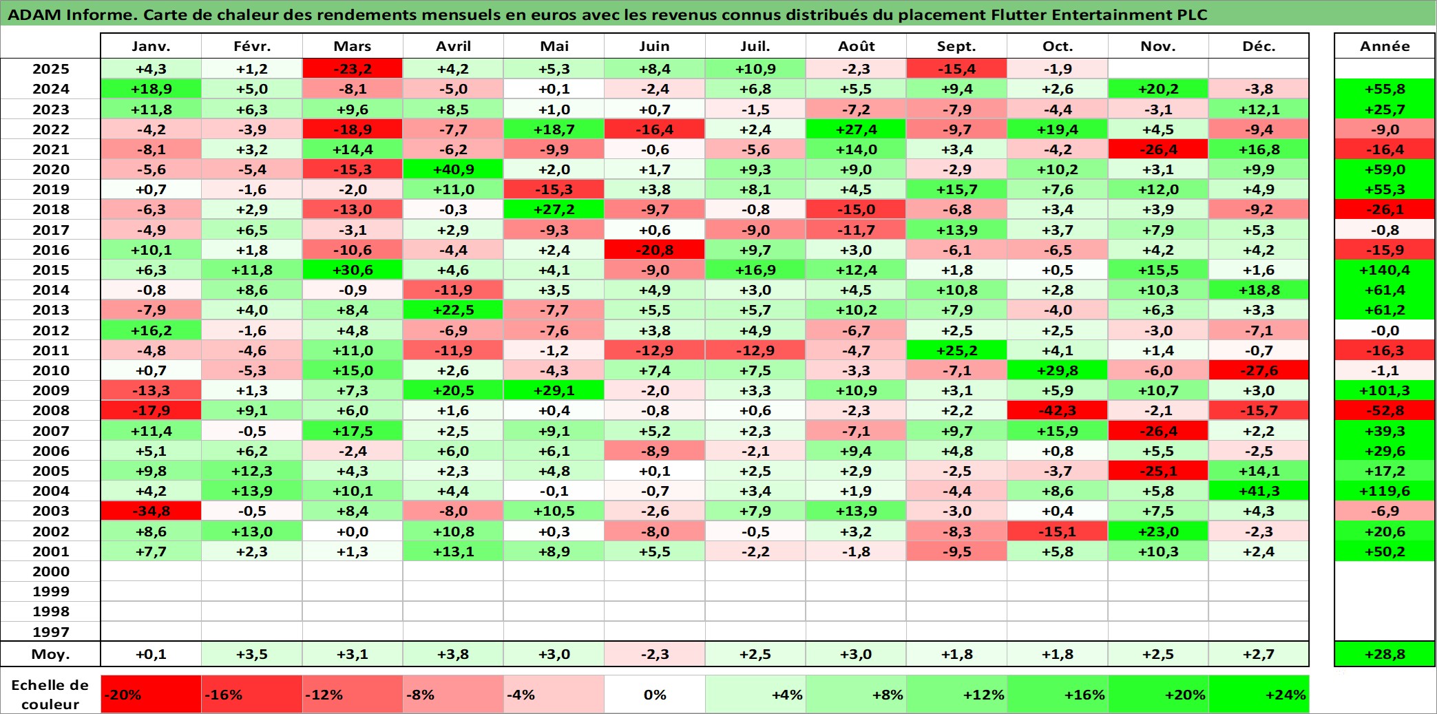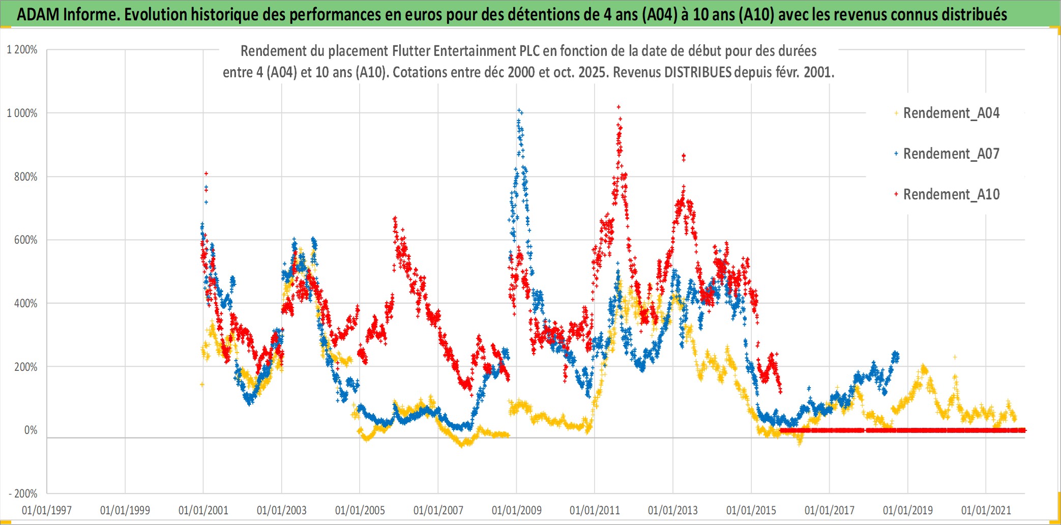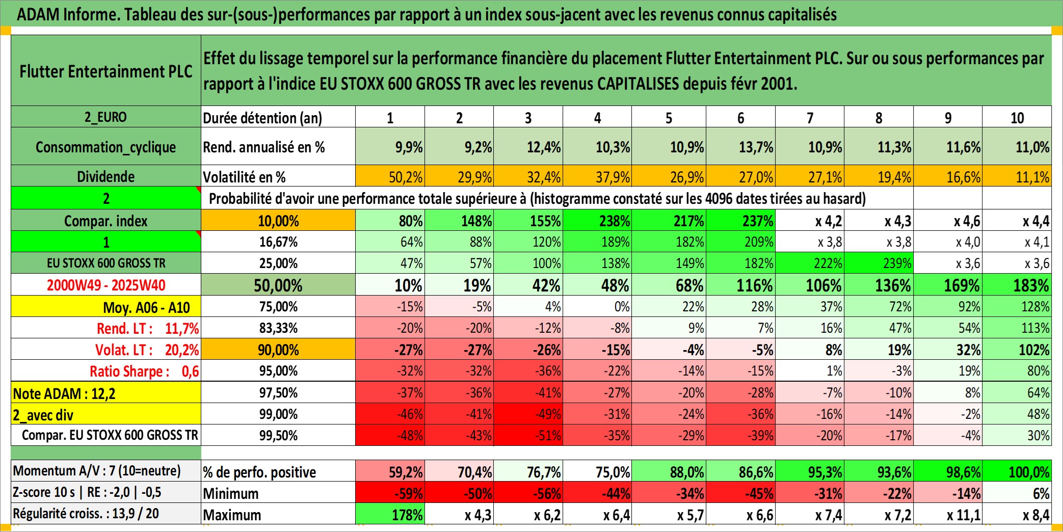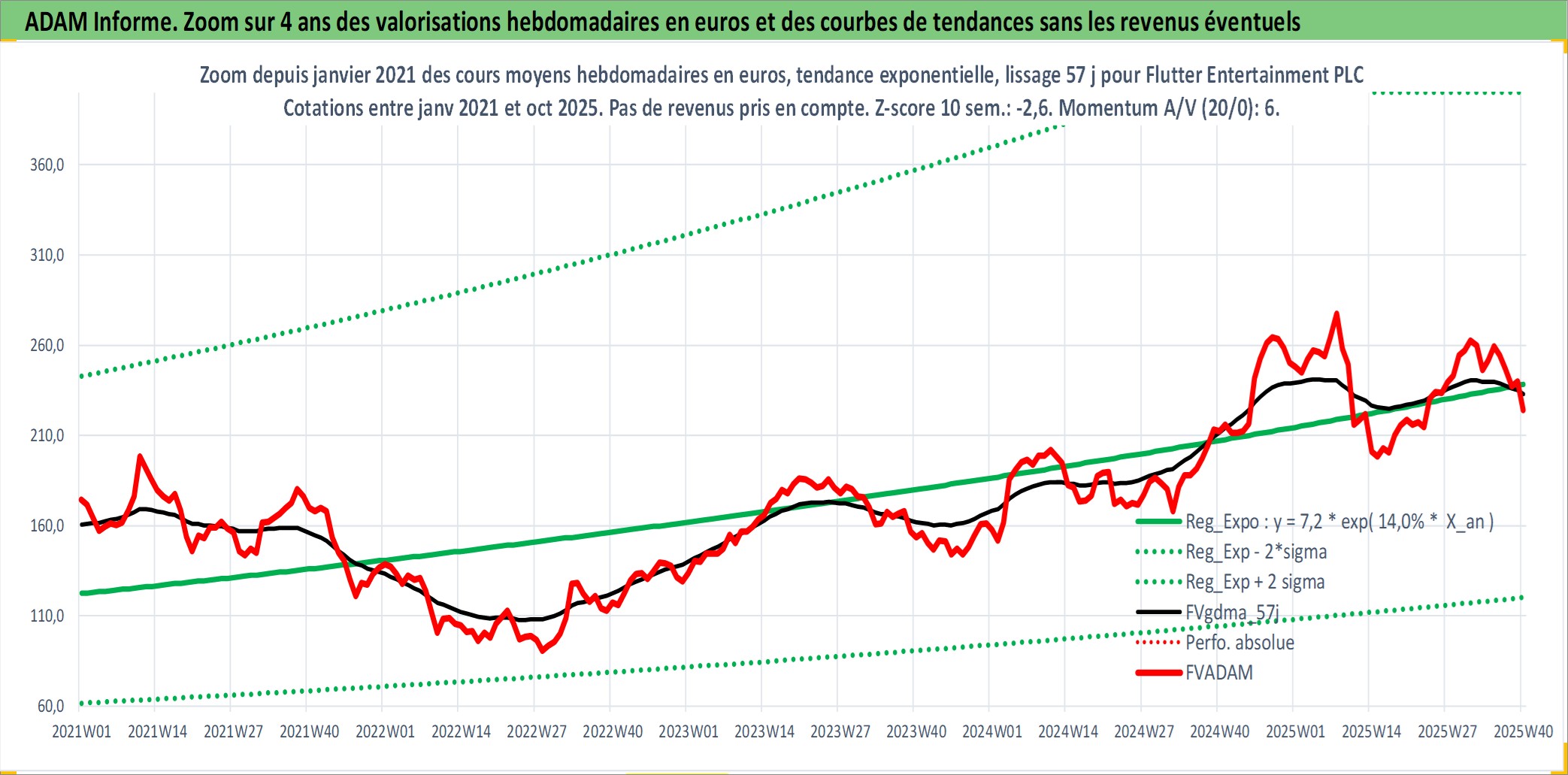 Site dédié aux investisseursPage dédiée sur site financeAnalyse des valorisations hebdomadaires de l'action Flutter Entertainment PLC. Cet actif est cote en GBX. Les valorisations sont en contrevaleur EURO et couvrent les semaines 2000W49 a 2025W40. Les revenus de cet actif financier sont pris en compte depuis la semaine 2001W09. La note globale ESG de cet actif est estimee a 7.0 (apres rebasage entre 0 et 20).