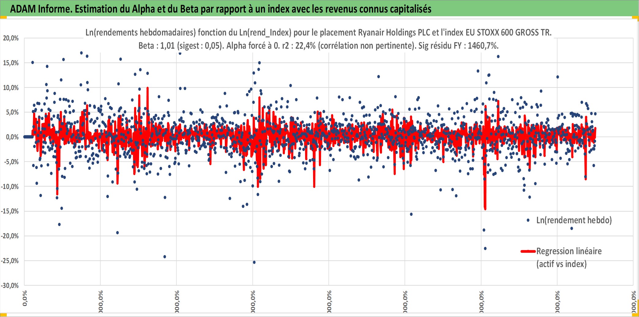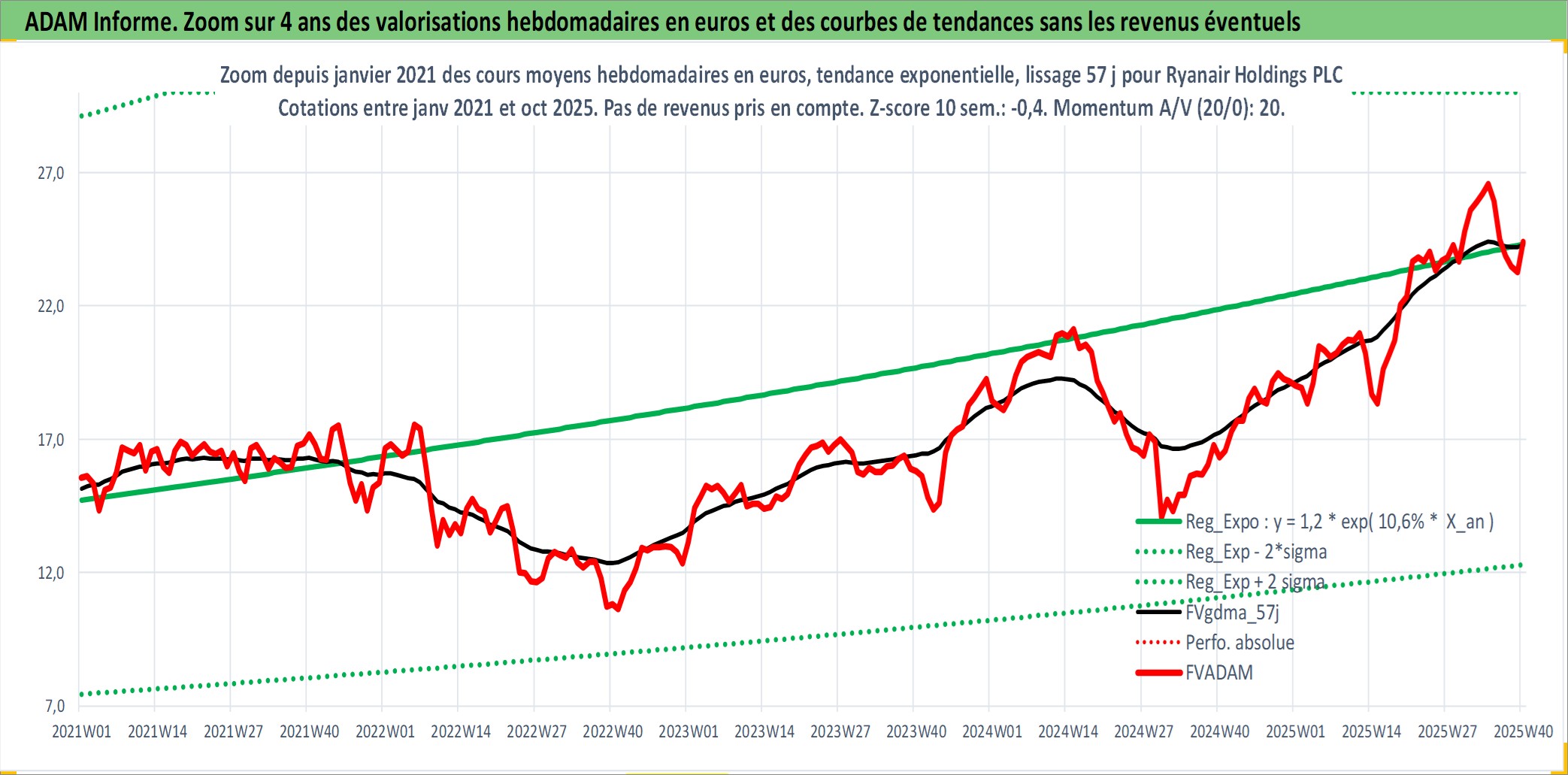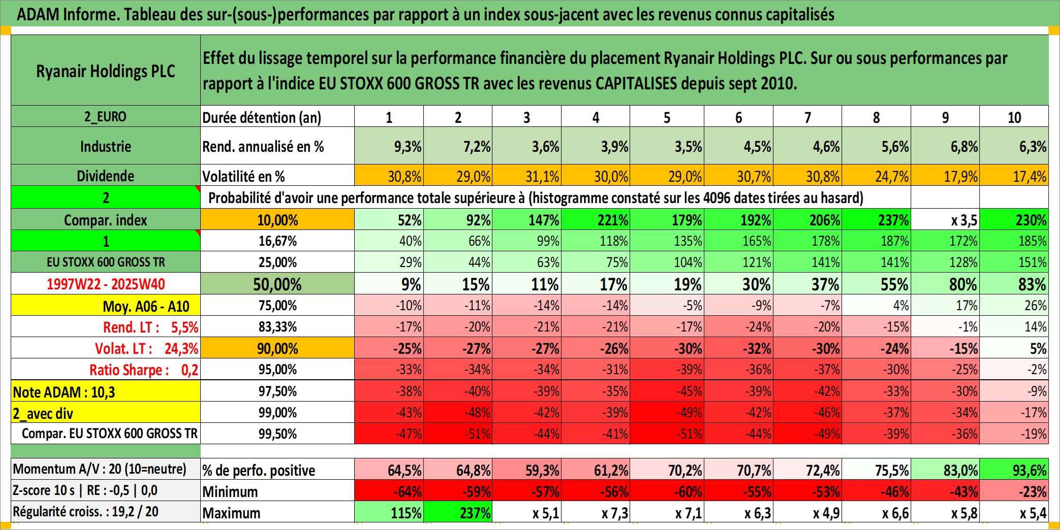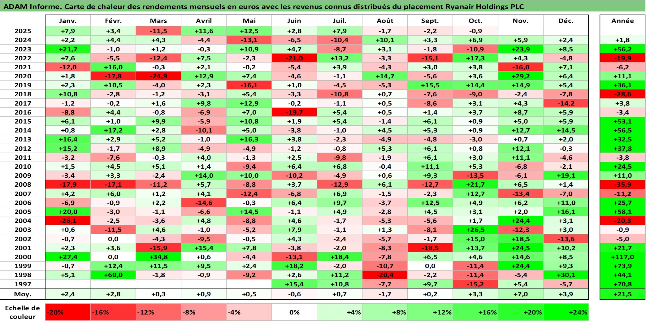 Site dédié aux investisseursPage dédiée sur site financeAnalyse des valorisations hebdomadaires de l'action Ryanair Holdings PLC. Cet actif est cote en EUR. Les valorisations couvrent les semaines 1997W22 a 2025W40. Les revenus de cet actif financier sont pris en compte depuis la semaine 2010W37. La note globale ESG de cet actif est estimee a 8.0 (apres rebasage entre 0 et 20).