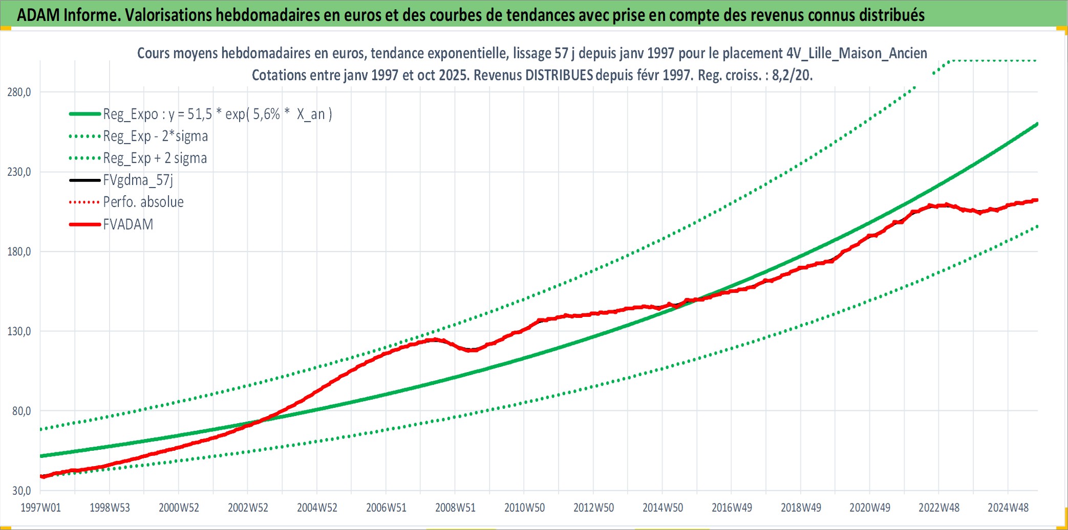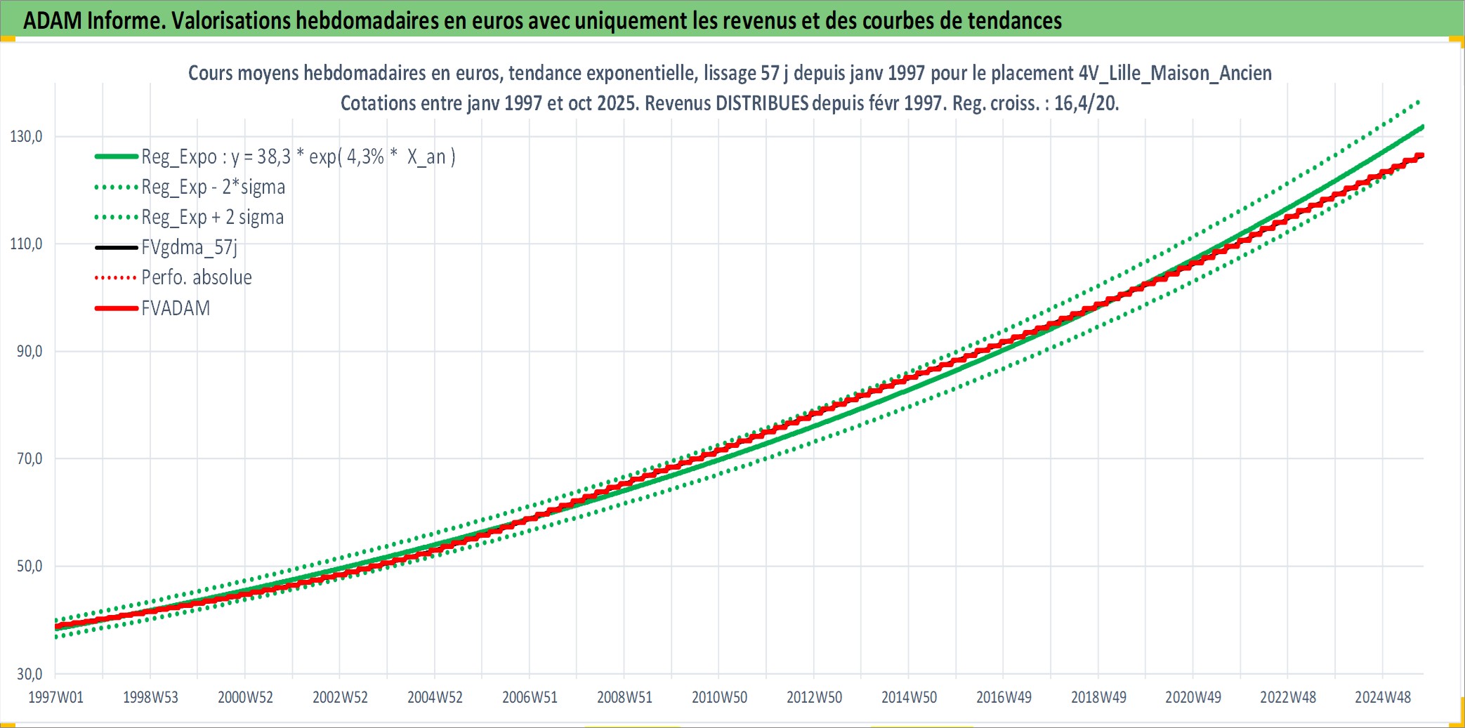 Site dédié aux investisseursPage dédiée sur site financeAnalyse des valorisations hebdomadaires de l'actif 4V_Lille_Maison_Ancien. Cet actif est cote en EUR. Les valorisations couvrent les semaines 1997W01 a 2025W40. Les loyers de cet actif immobilier sont pris egaux a 3,33% annuels de la valeur venale du logement.