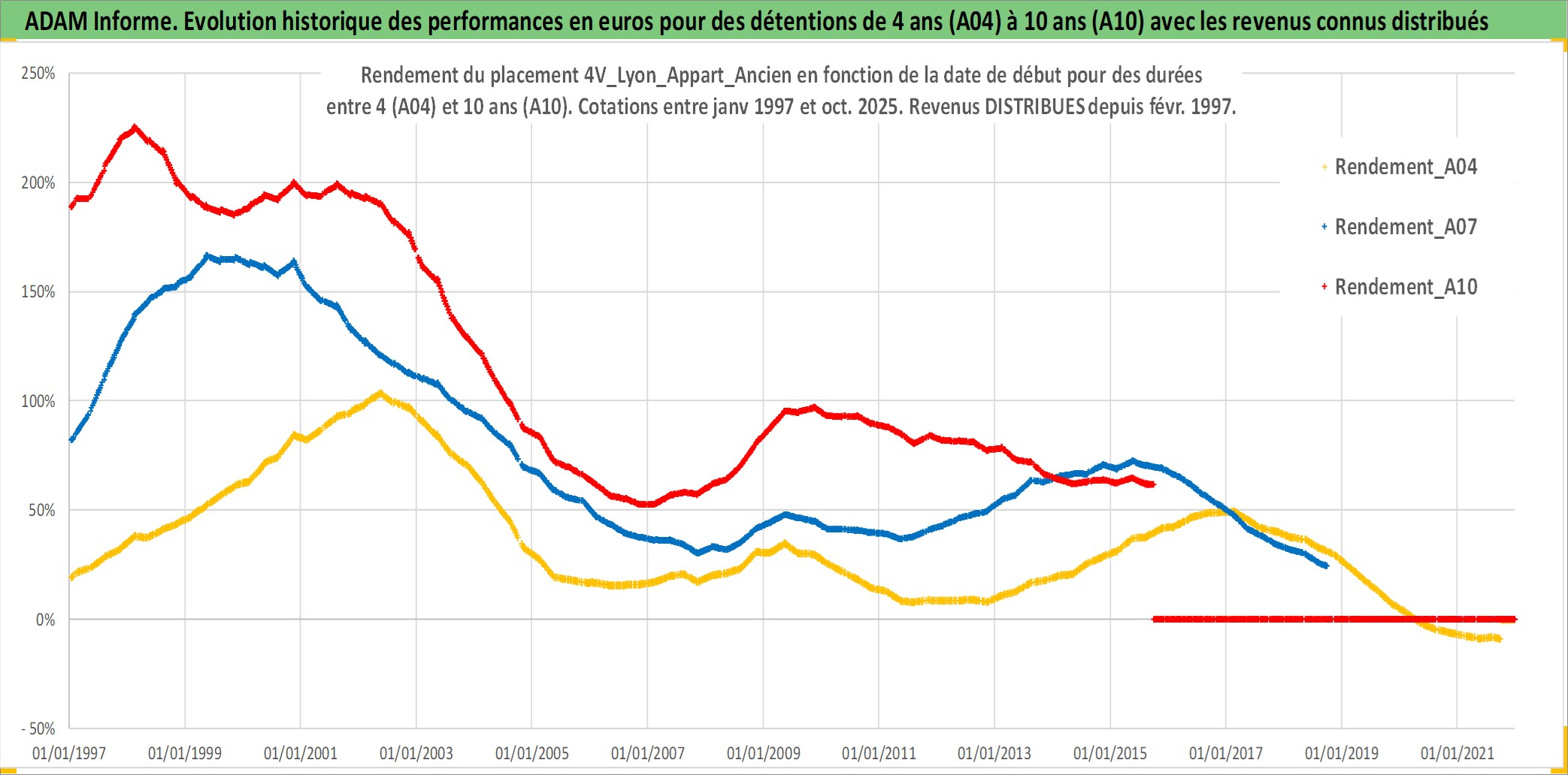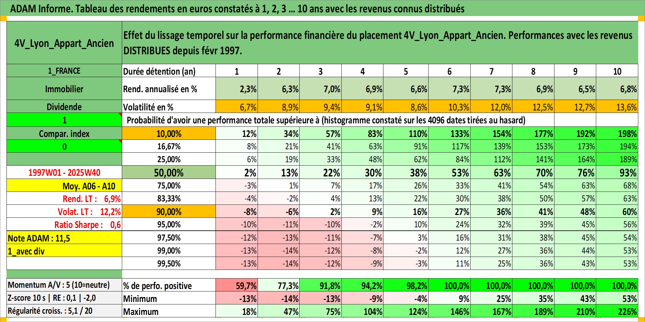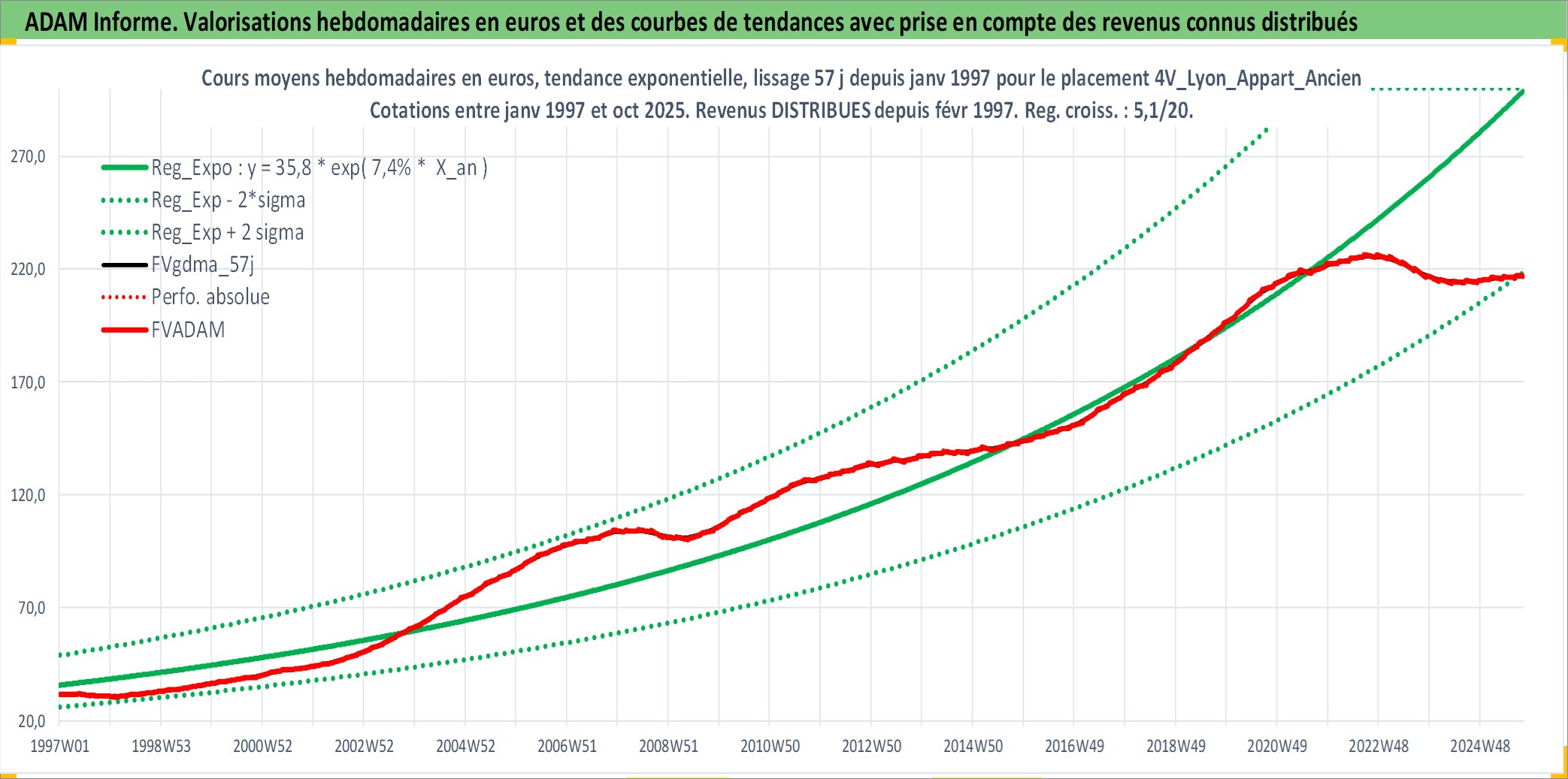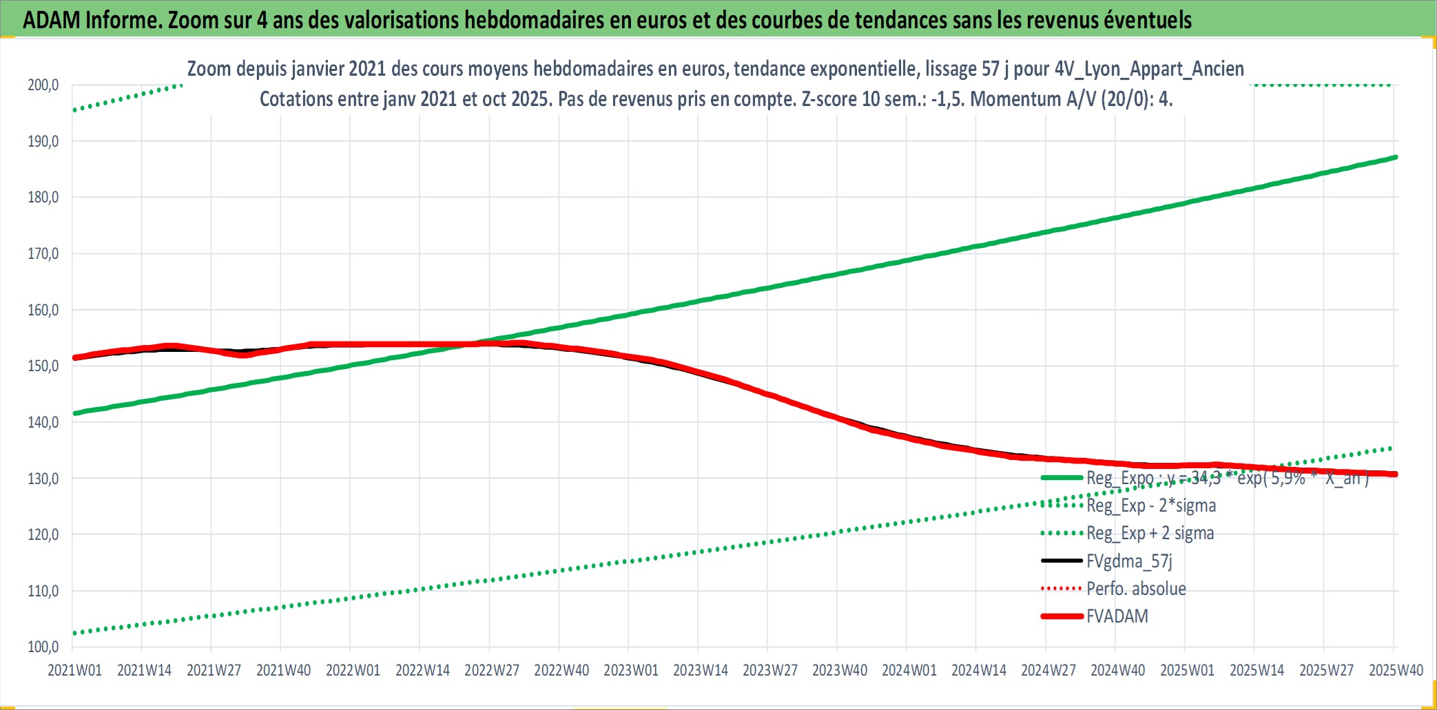 Site dédié aux investisseursPage dédiée sur site financeAnalyse des valorisations hebdomadaires de l'actif 4V_Lyon_Appart_Ancien. Cet actif est cote en EUR. Les valorisations couvrent les semaines 1997W01 a 2025W40. Les loyers de cet actif immobilier sont pris egaux a 3,33% annuels de la valeur venale du logement.