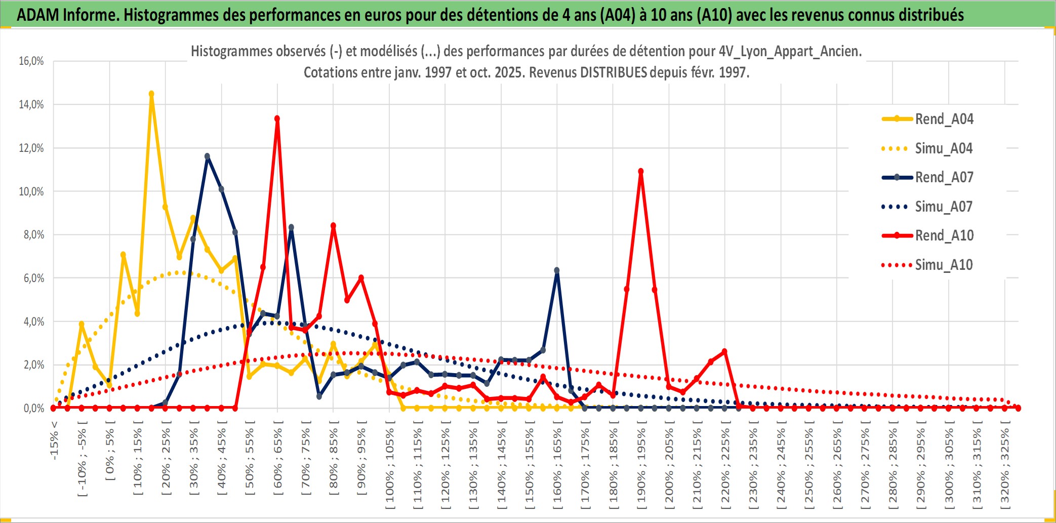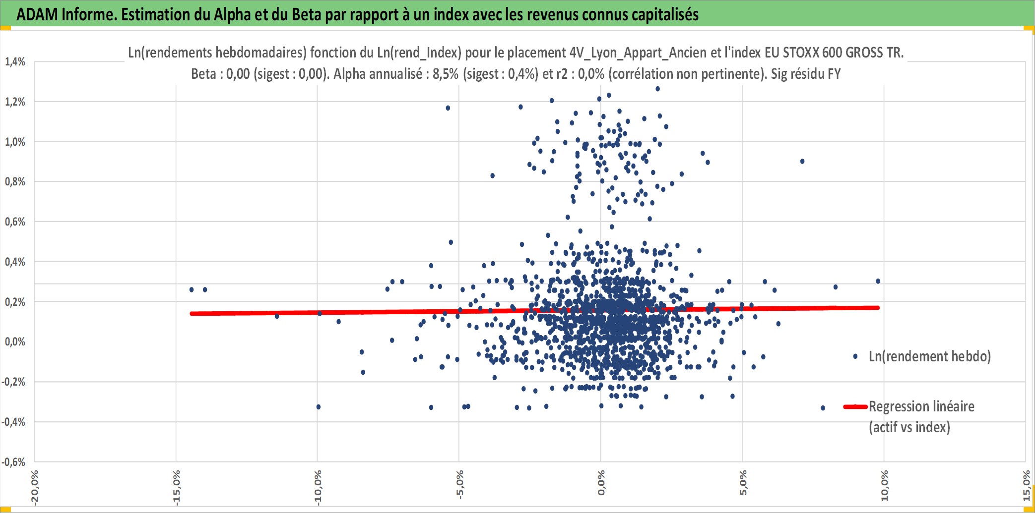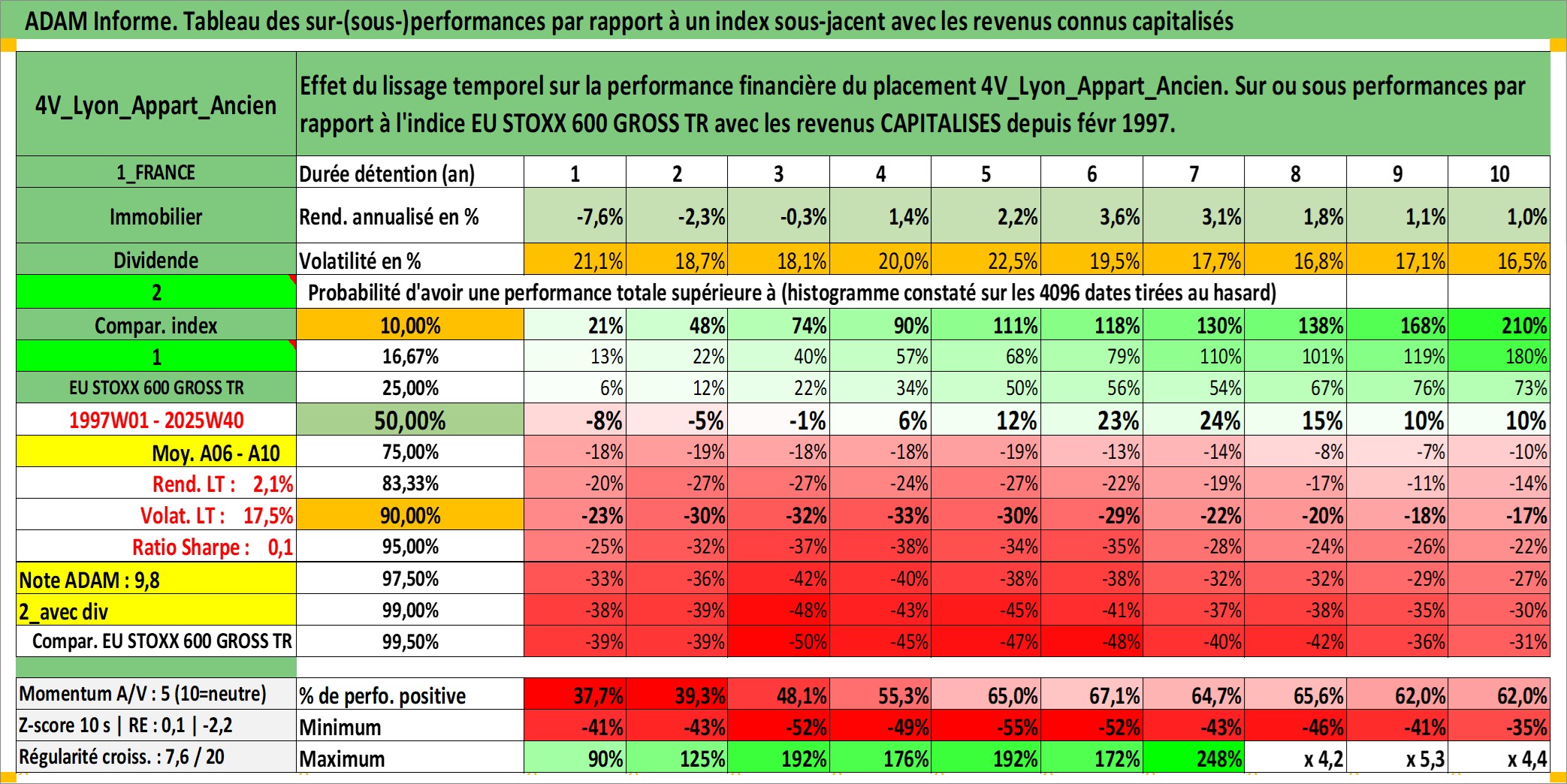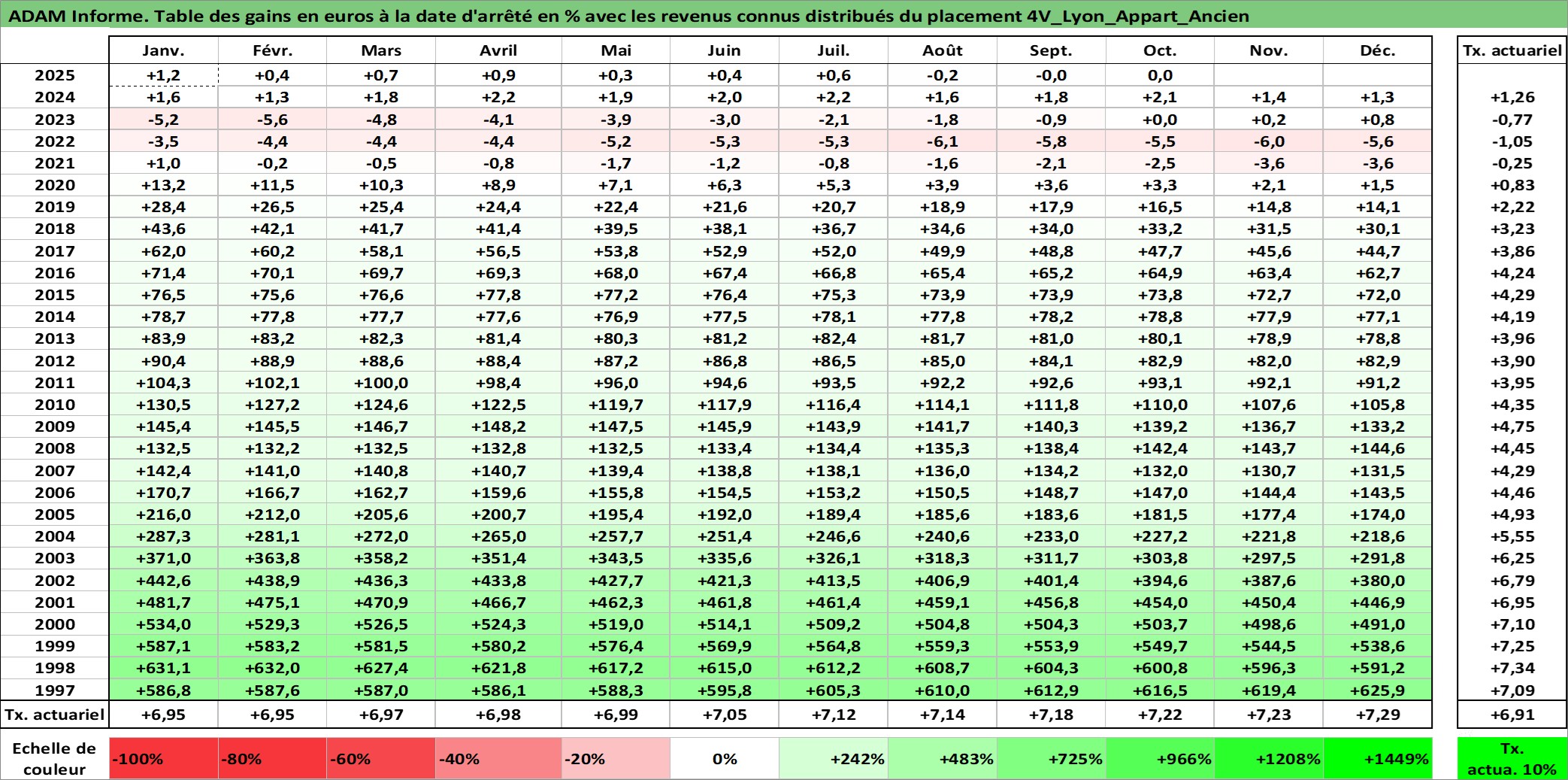 Site dédié aux investisseursPage dédiée sur site financeAnalyse des valorisations hebdomadaires de l'actif 4V_Lyon_Appart_Ancien. Cet actif est cote en EUR. Les valorisations couvrent les semaines 1997W01 a 2025W40. Les loyers de cet actif immobilier sont pris egaux a 3,33% annuels de la valeur venale du logement.