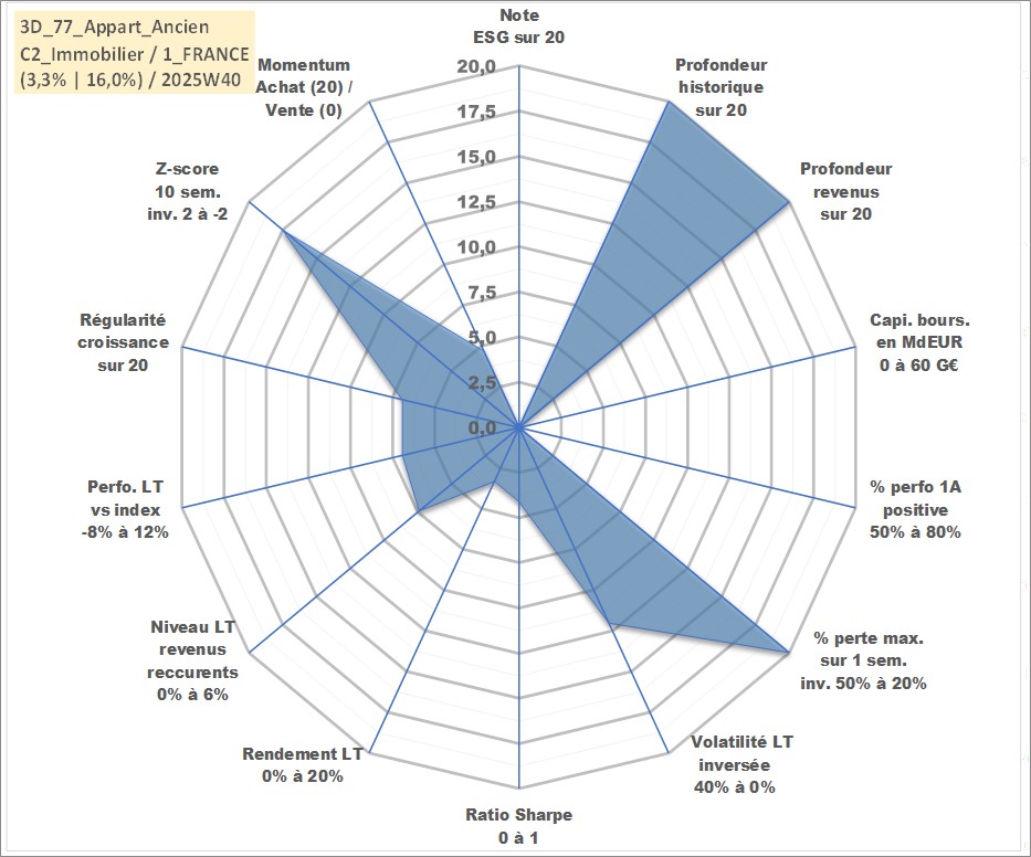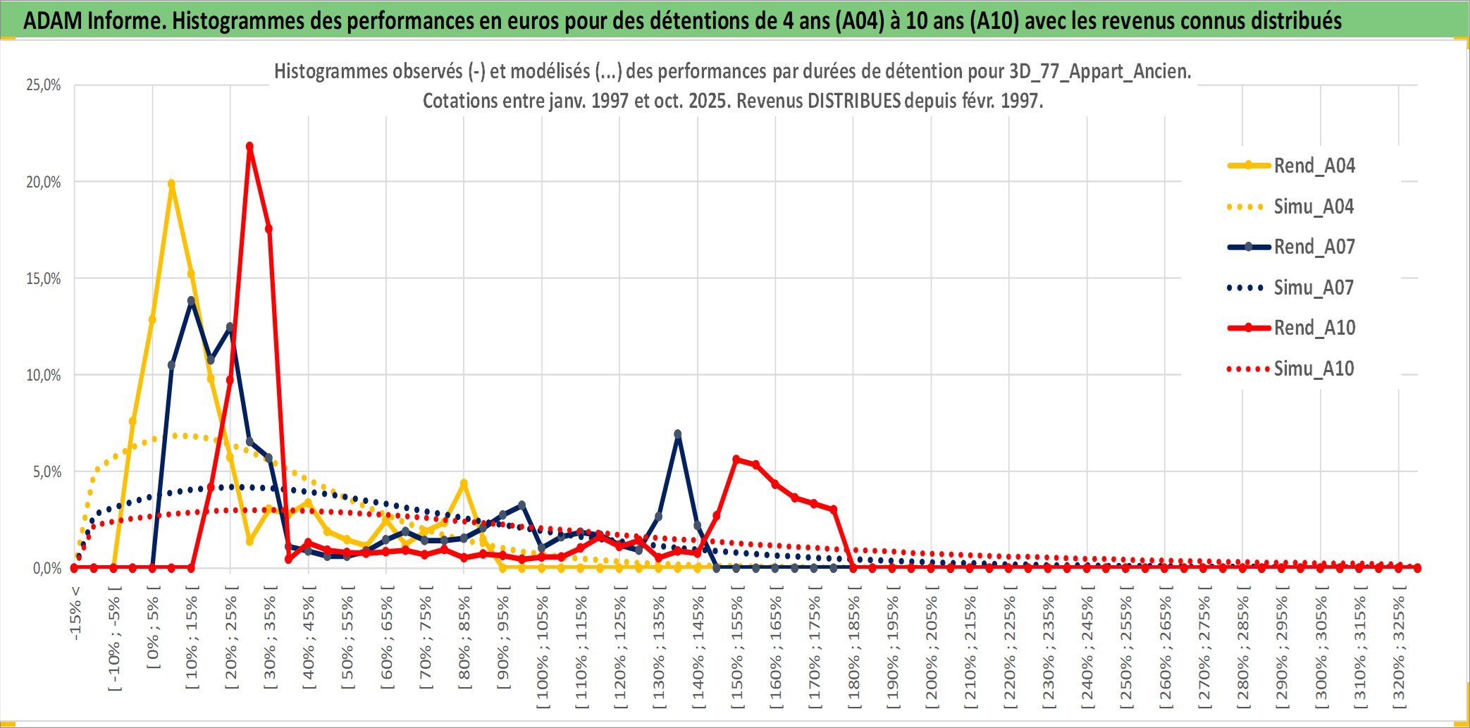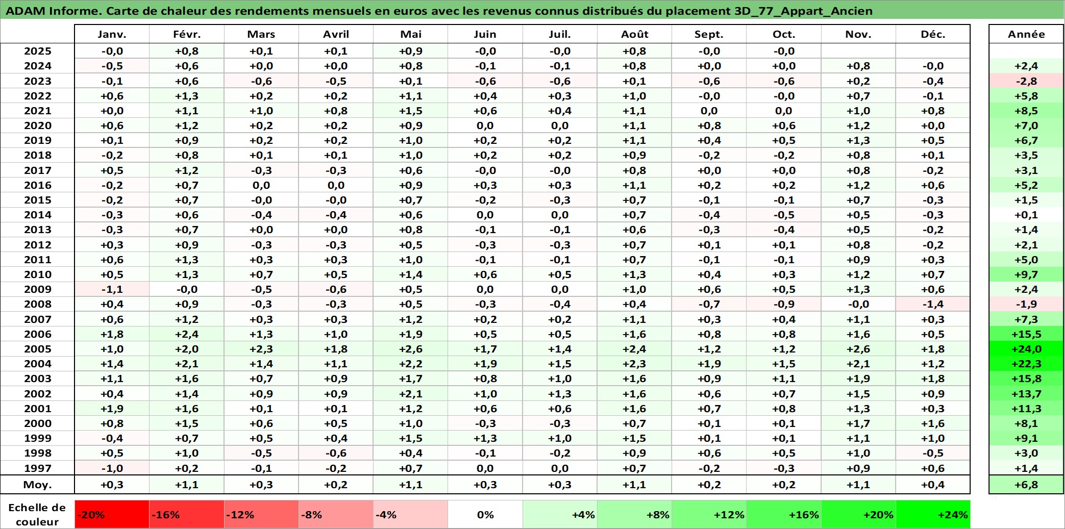 Site dédié aux investisseursPage dédiée sur site financeAnalyse des valorisations hebdomadaires de l'actif 3D_77_Appart_Ancien. Cet actif est cote en EUR. Les valorisations couvrent les semaines 1997W01 a 2025W40. Les loyers de cet actif immobilier sont pris egaux a 3,33% annuels de la valeur venale du logement.