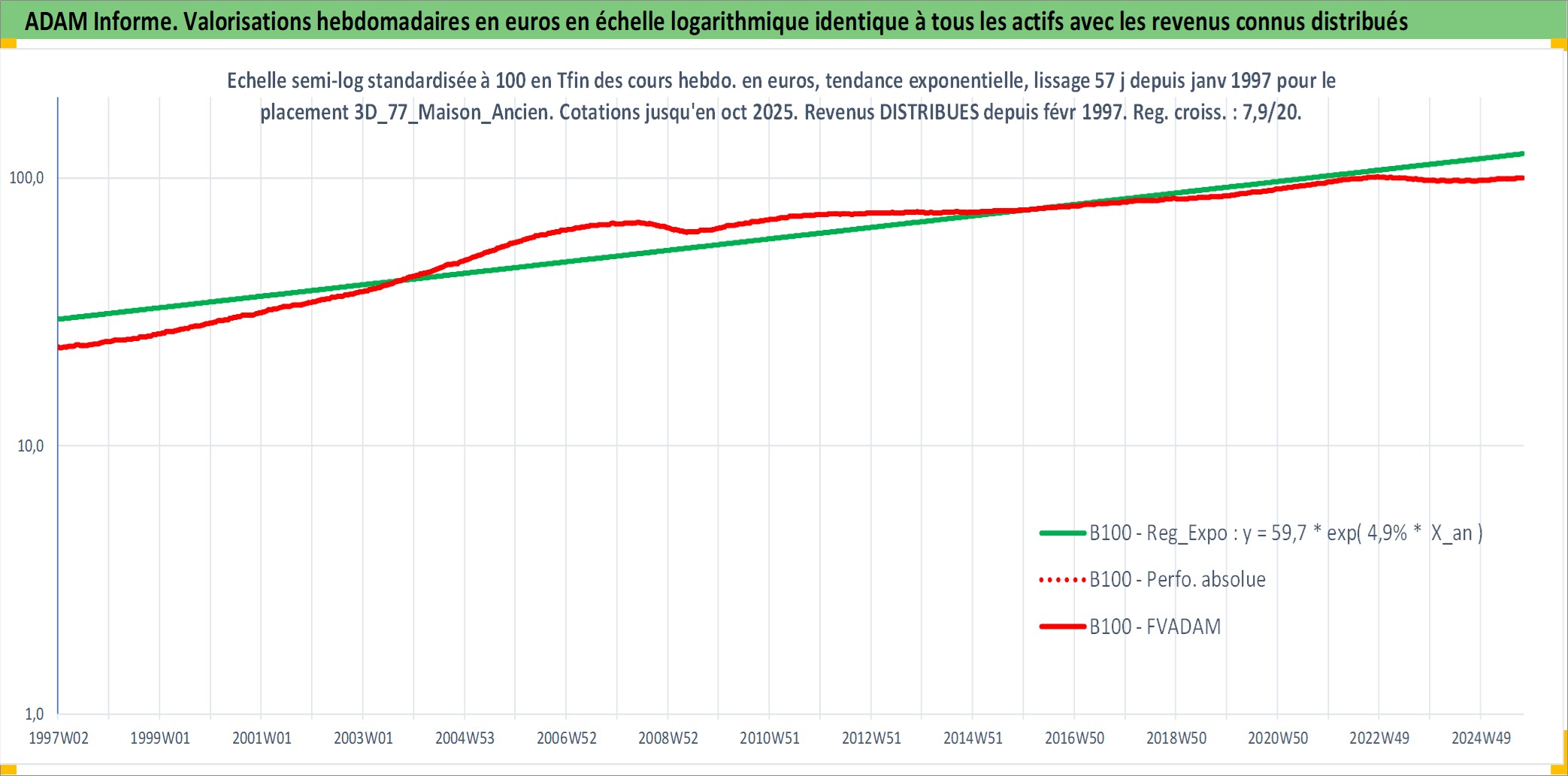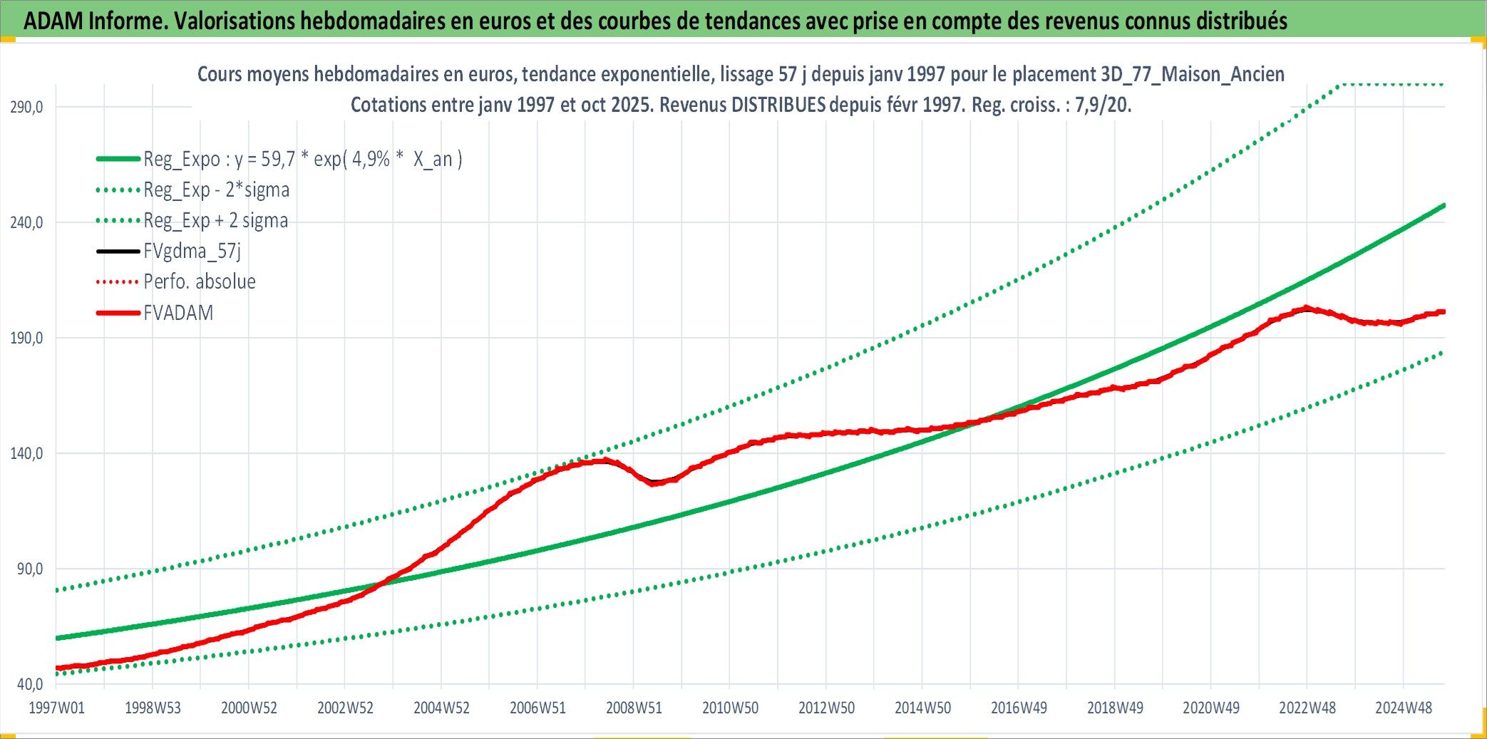 Site dédié aux investisseursPage dédiée sur site financeAnalyse des valorisations hebdomadaires de l'actif 3D_77_Maison_Ancien. Cet actif est cote en EUR. Les valorisations couvrent les semaines 1997W01 a 2025W40. Les loyers de cet actif immobilier sont pris egaux a 3,33% annuels de la valeur venale du logement.