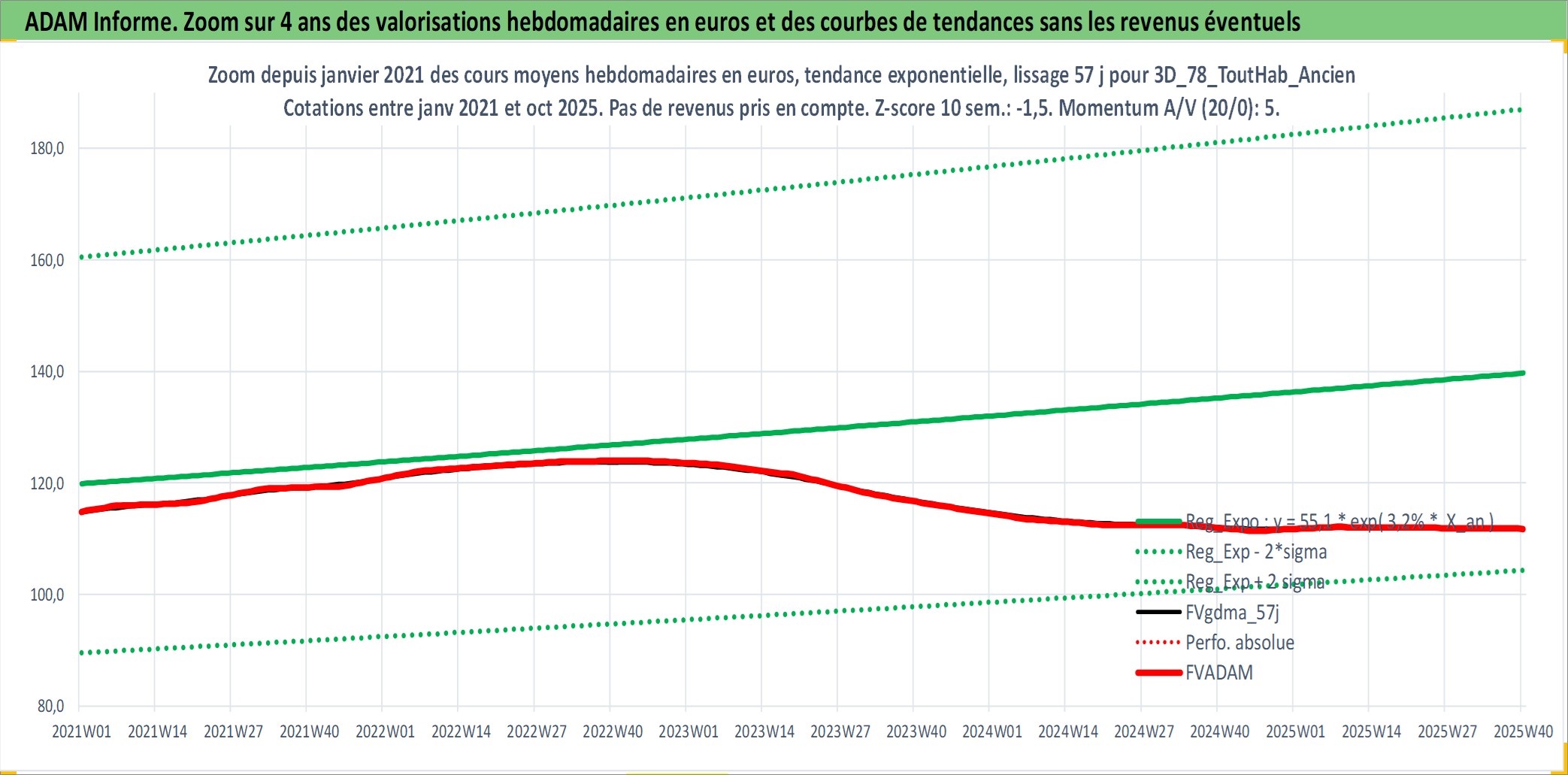 Site dédié aux investisseursPage dédiée sur site financeAnalyse des valorisations hebdomadaires de l'actif 3D_78_ToutHab_Ancien. Cet actif est cote en EUR. Les valorisations couvrent les semaines 1997W01 a 2025W40. Les loyers de cet actif immobilier sont pris egaux a 3,33% annuels de la valeur venale du logement.