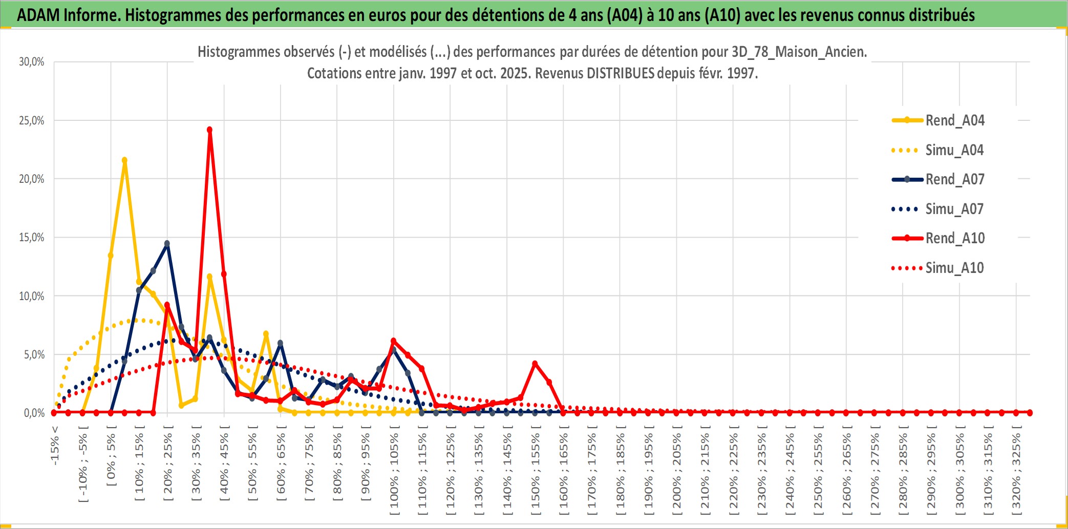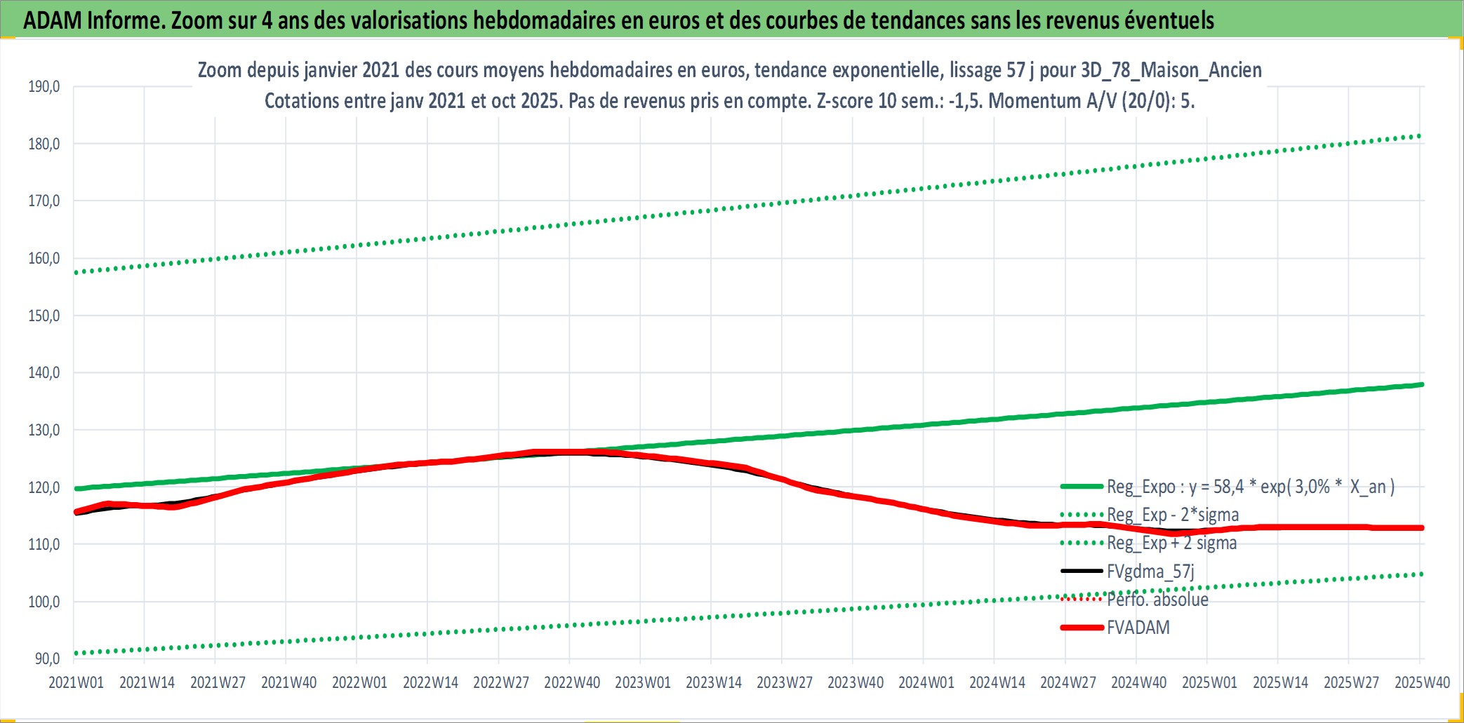 Site dédié aux investisseursPage dédiée sur site financeAnalyse des valorisations hebdomadaires de l'actif 3D_78_Maison_Ancien. Cet actif est cote en EUR. Les valorisations couvrent les semaines 1997W01 a 2025W40. Les loyers de cet actif immobilier sont pris egaux a 3,33% annuels de la valeur venale du logement.