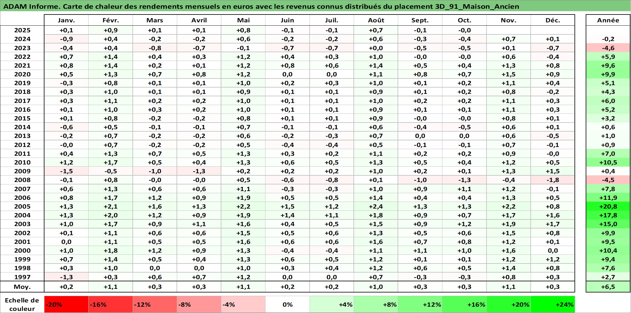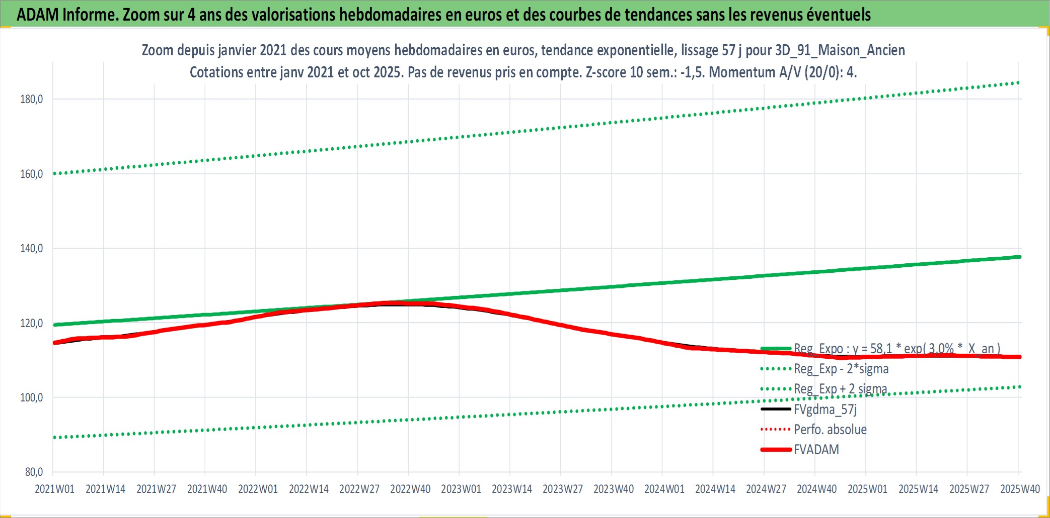Site dédié aux investisseursPage dédiée sur site financeAnalyse des valorisations hebdomadaires de l'actif 3D_91_Maison_Ancien. Cet actif est cote en EUR. Les valorisations couvrent les semaines 1997W01 a 2025W40. Les loyers de cet actif immobilier sont pris egaux a 3,33% annuels de la valeur venale du logement.