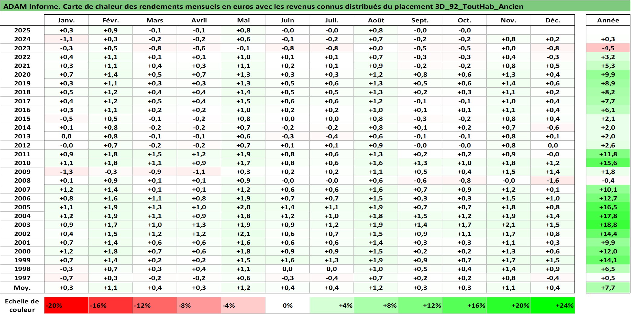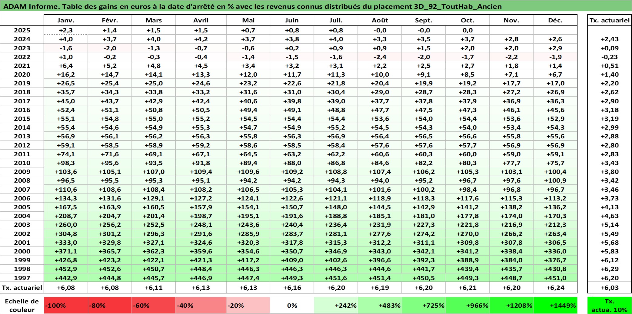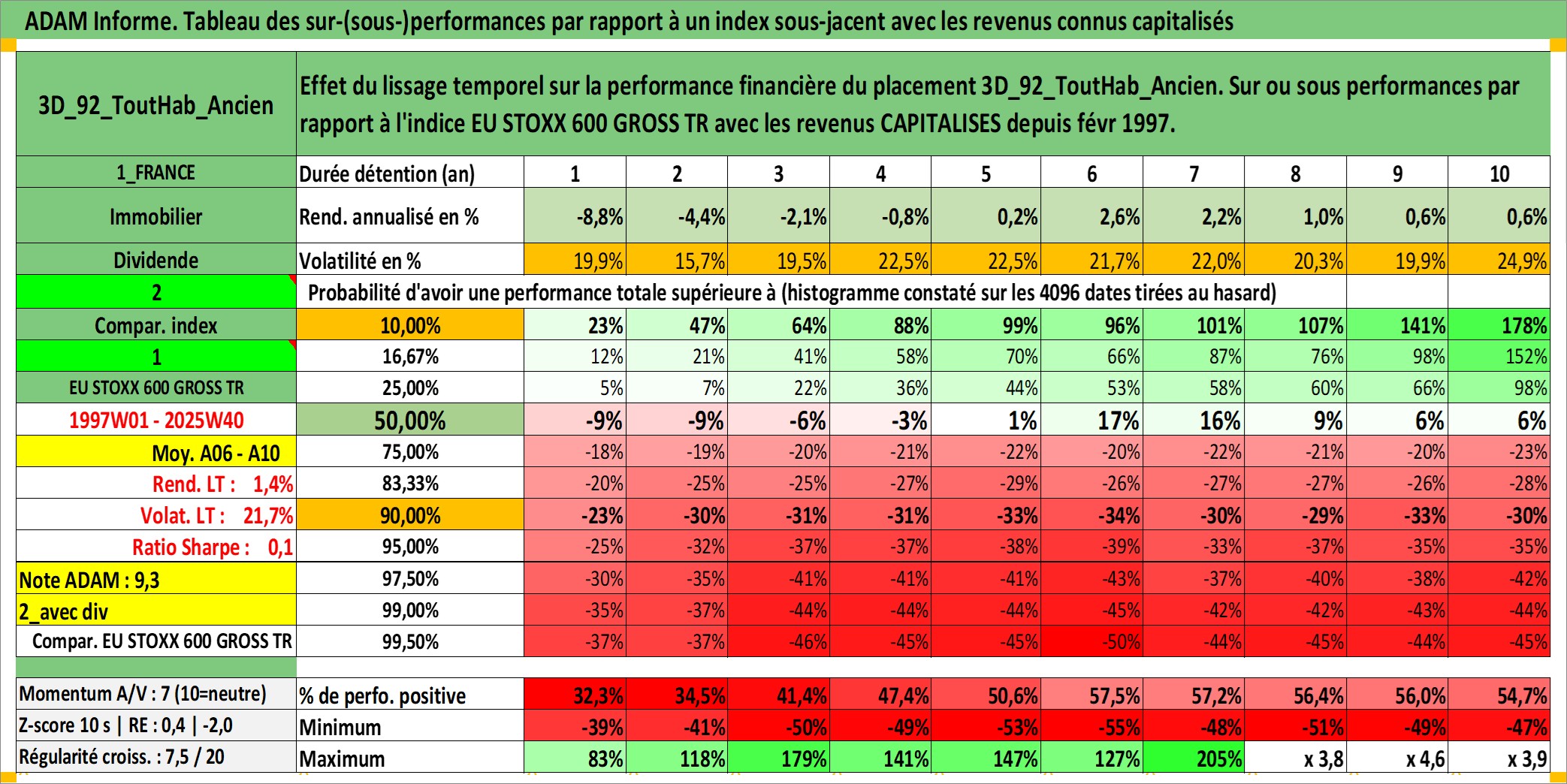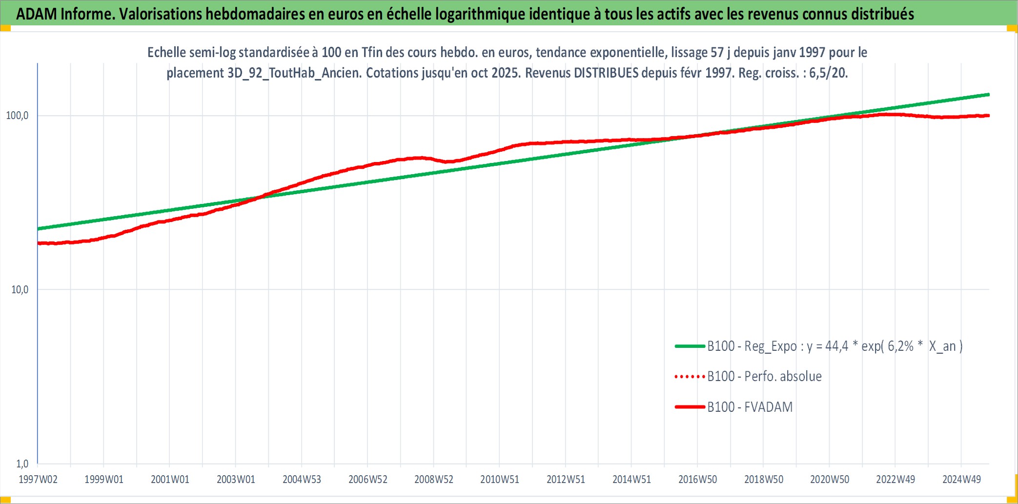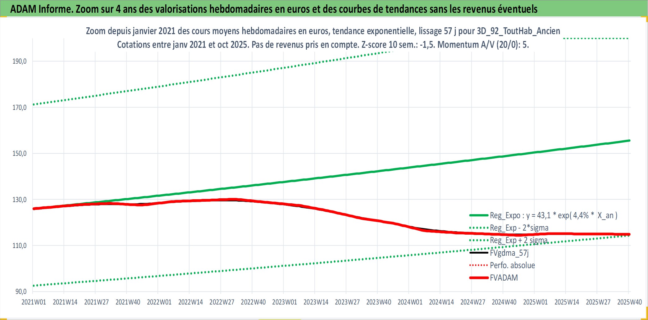 Site dédié aux investisseursPage dédiée sur site financeAnalyse des valorisations hebdomadaires de l'actif 3D_92_ToutHab_Ancien. Cet actif est cote en EUR. Les valorisations couvrent les semaines 1997W01 a 2025W40. Les loyers de cet actif immobilier sont pris egaux a 3,33% annuels de la valeur venale du logement.