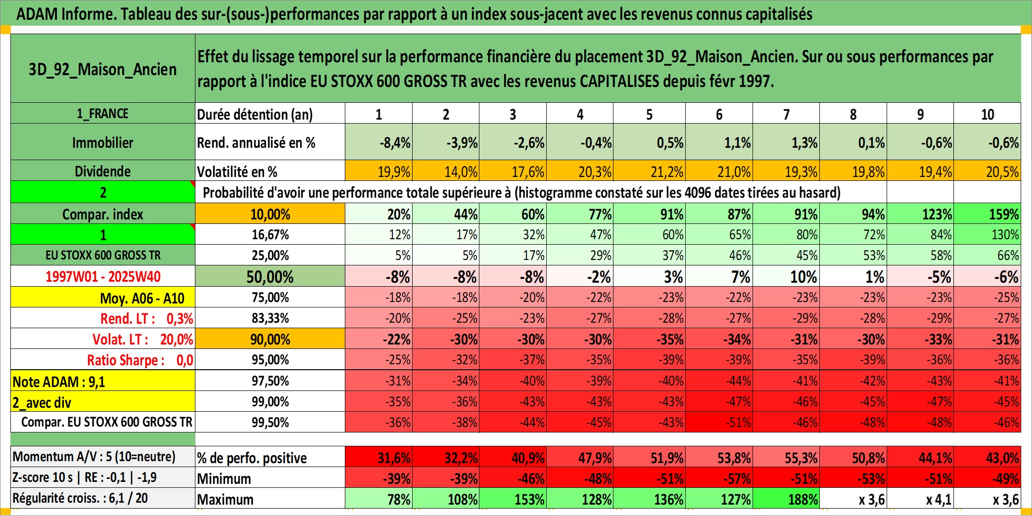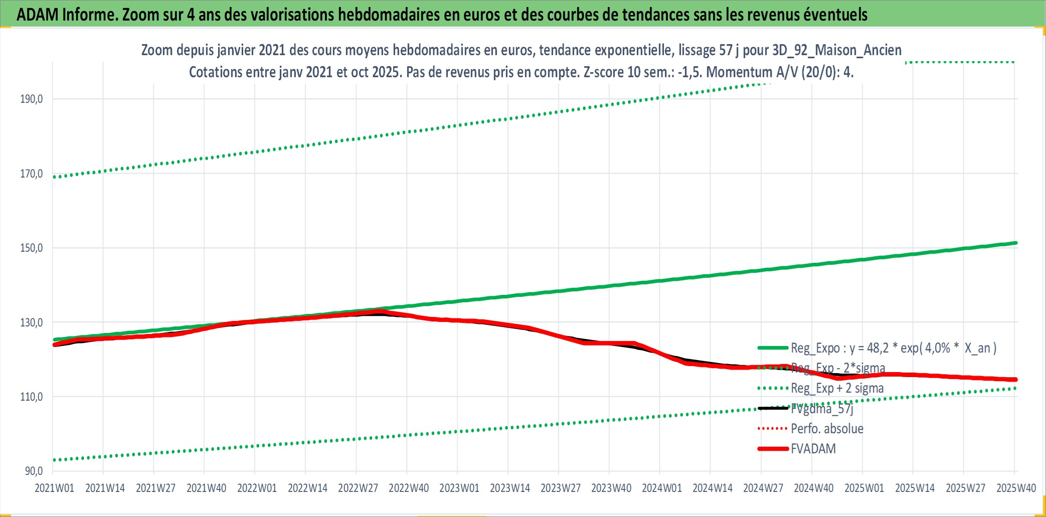 Site dédié aux investisseursPage dédiée sur site financeAnalyse des valorisations hebdomadaires de l'actif 3D_92_Maison_Ancien. Cet actif est cote en EUR. Les valorisations couvrent les semaines 1997W01 a 2025W40. Les loyers de cet actif immobilier sont pris egaux a 3,33% annuels de la valeur venale du logement.